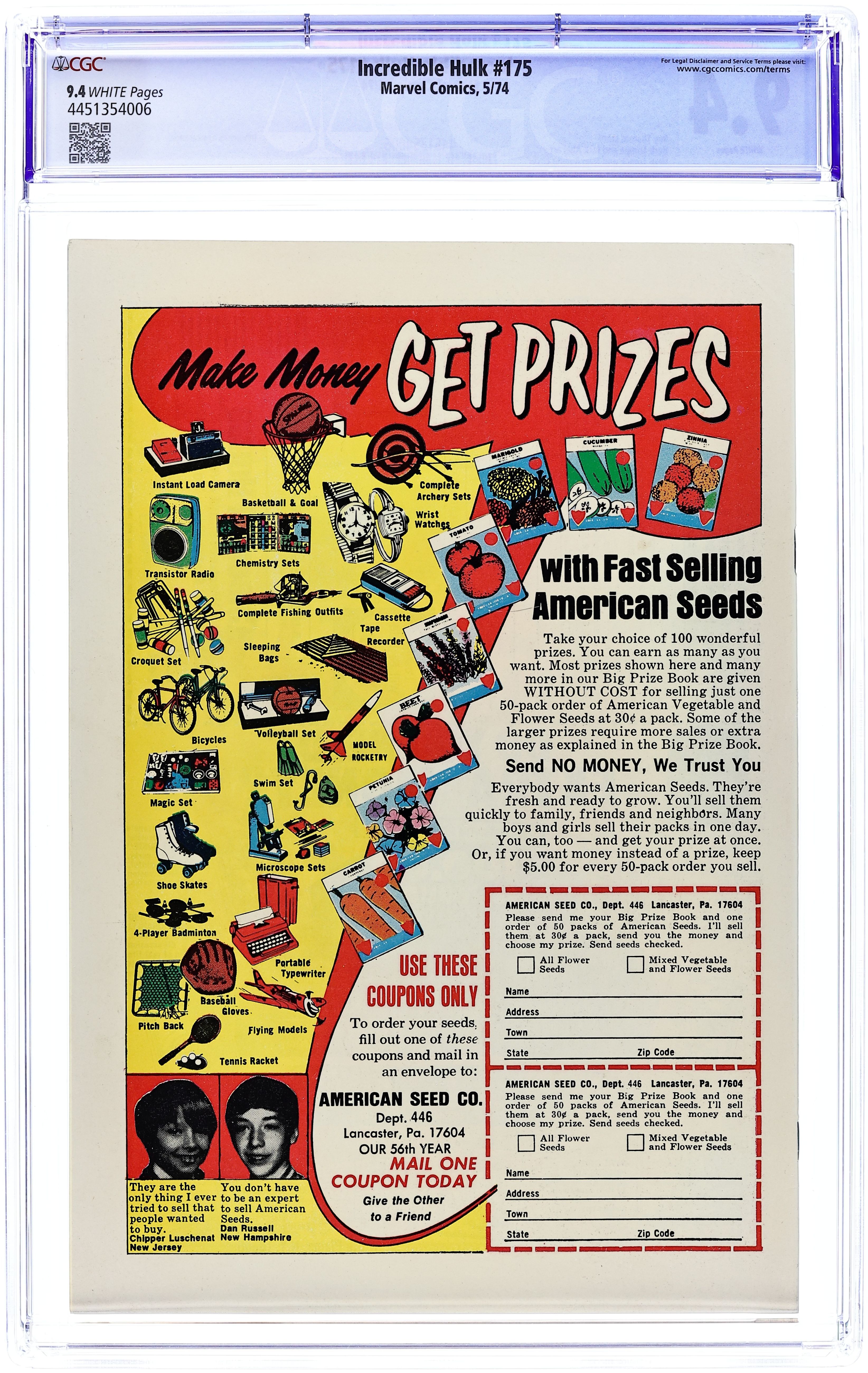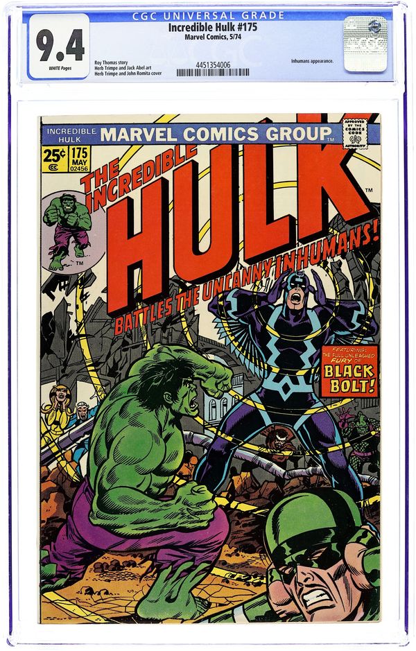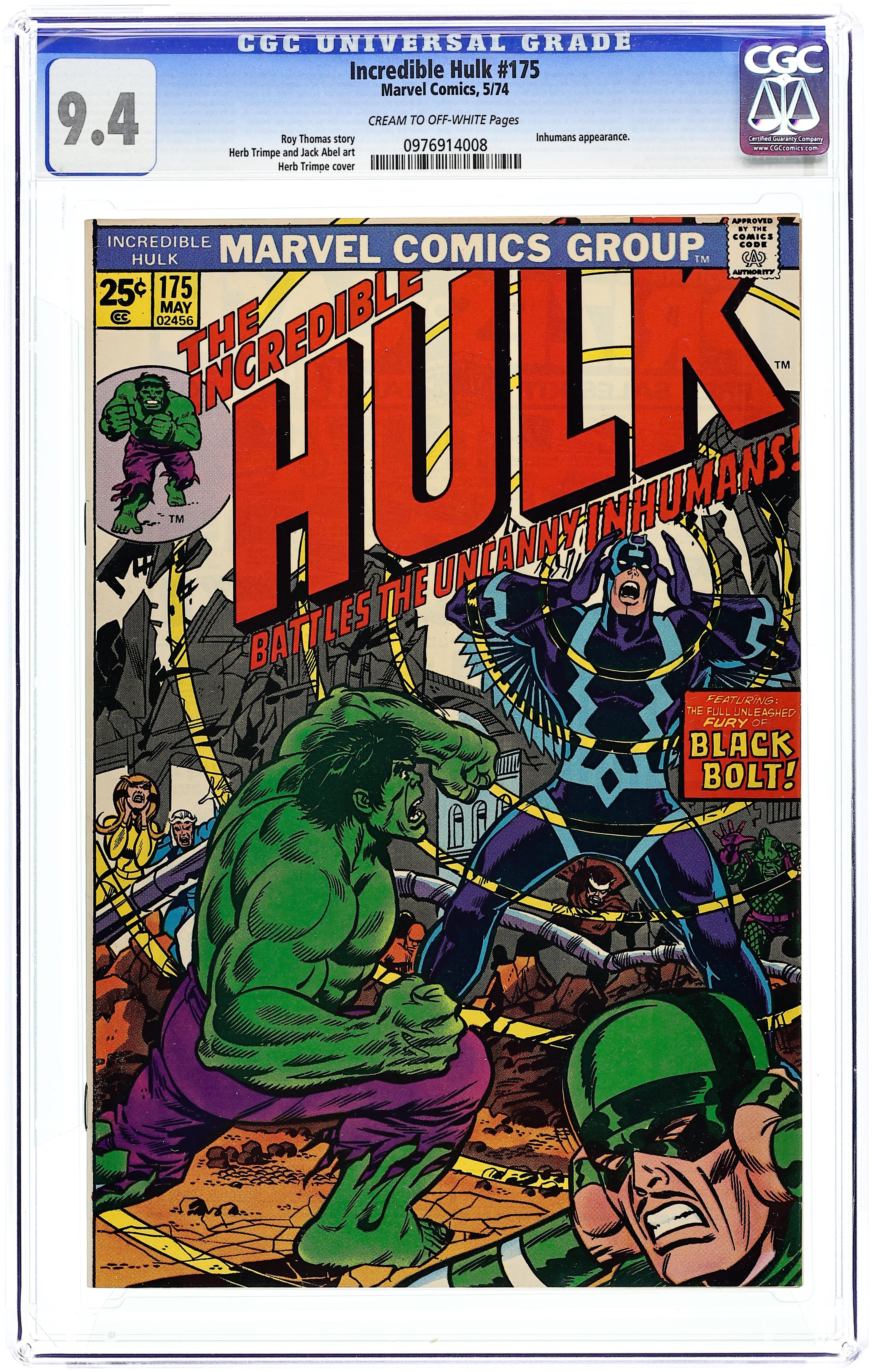 Cover art by Herb Trimpe and John Romita (alterations). "Triumph On Terra-Two," script by Roy Thomas, Gerry Conway, and Tony Isabella, pencils by Herb Trimpe, inks by Jack Abel; Hulk is reverted back to Bruce Banner by an act of brute force; Banner can only watch in horror as the Counter-Earth battle rages on in D.C. Who is the madman posturing as President of Counter-Earth?; And will Hulk be able to save his friend Adam Warlock from certain execution? The Warlock story continues in Strange Tales 178. 36 pgs., full color. $0.25. Cover price $0.25.