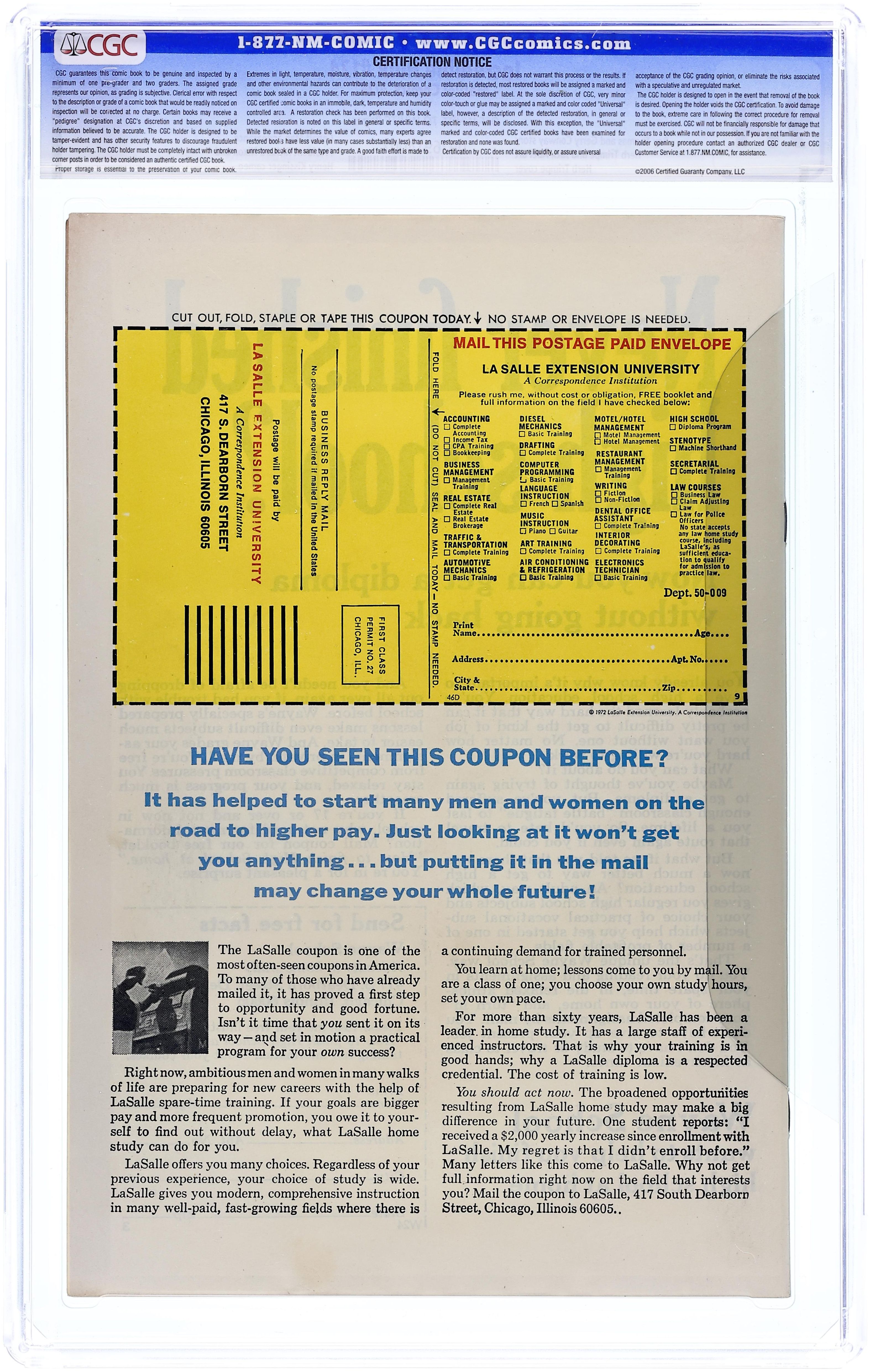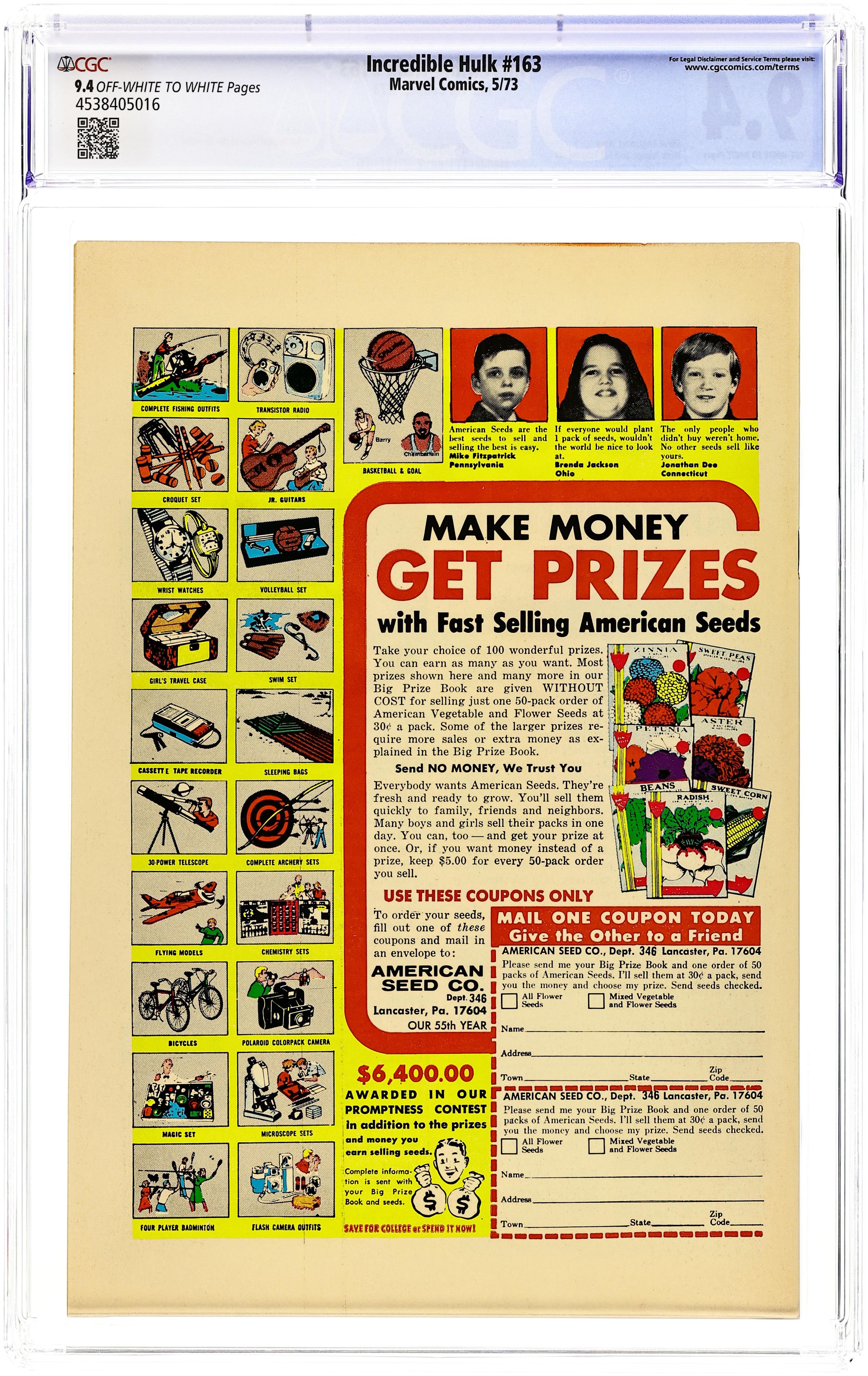 Cover art by Herb Trimpe. Two Years Before the Abomination!, script by Steve Englehart, pencils by Herb Trimpe, inks by Sal Trapani; Bruce returns home from Counter-Earth only to have his shuttle blasted to atoms by Thunderbolt Ross; Ross sends the Hulkbusters out to capture the Hulk but they come home with the Abomination instead; In order to ensure that Betty continues to think the Hulk is dead, Ross makes a deal with Abomination, ensuring him a cure for his gamma irradiated condition and his freedom if he captures the jade giant; Abomination battles the Hulk but, realizing that Ross has deceived him, tells Hulk that Betty has married Glenn and they are honeymooning in Niagara Falls. 36 pgs. $0.20. Cover price $0.20.