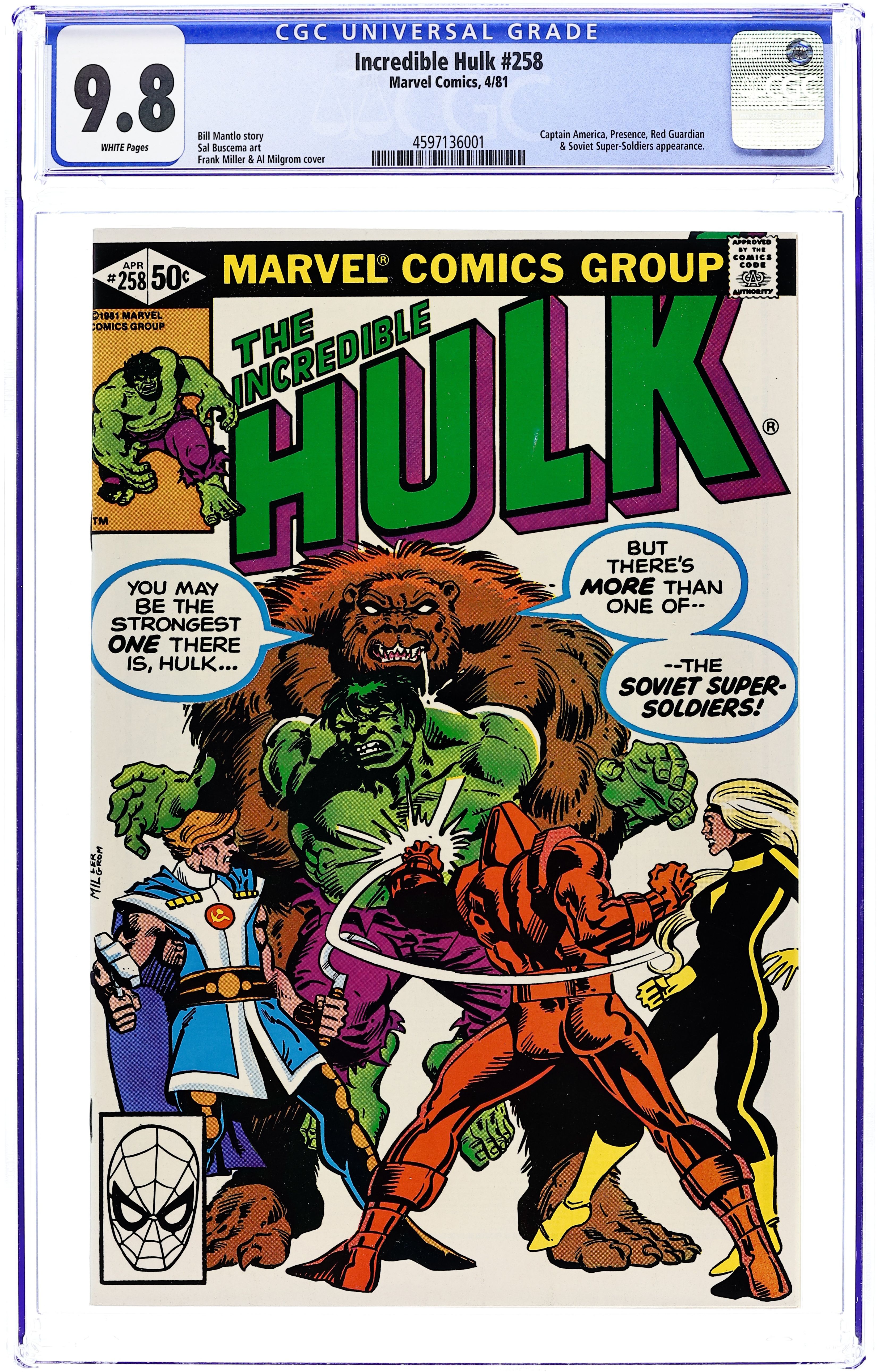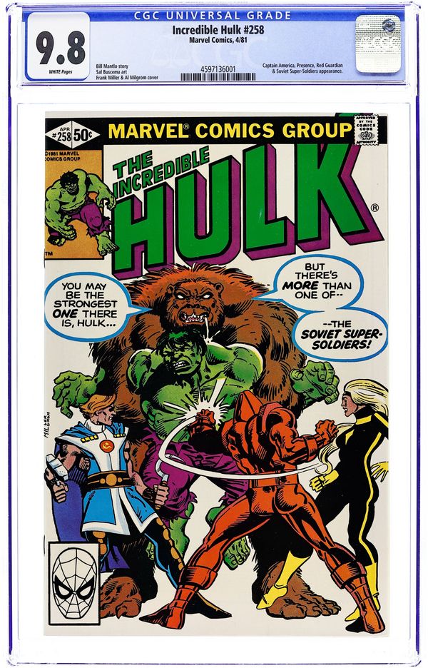 Direct Edition. "...to Hunt the Hulk!" Guest-starring the Soviet Super Soldiers. Captain America cameo. Story by Bill Mantlo. Art by Sal Buscema. Cover by Frank Miller. The Hulk's powerful legs propel him into Russia. Seeing him as a threat the Russian military calls in the Soviet Super Soldiers to handle it. But do Crimson Dynamo, Darkstar, Vanguard, and Major Ursa even have the power to stop the Hulk's rampage. Their titanic tussle draws the attention of a powerful evil, the Presence! Meanwhile, Rick Jones goes to the Avengers to ask for their help to save the Hulk. 36 pages. Cover price $0.50.