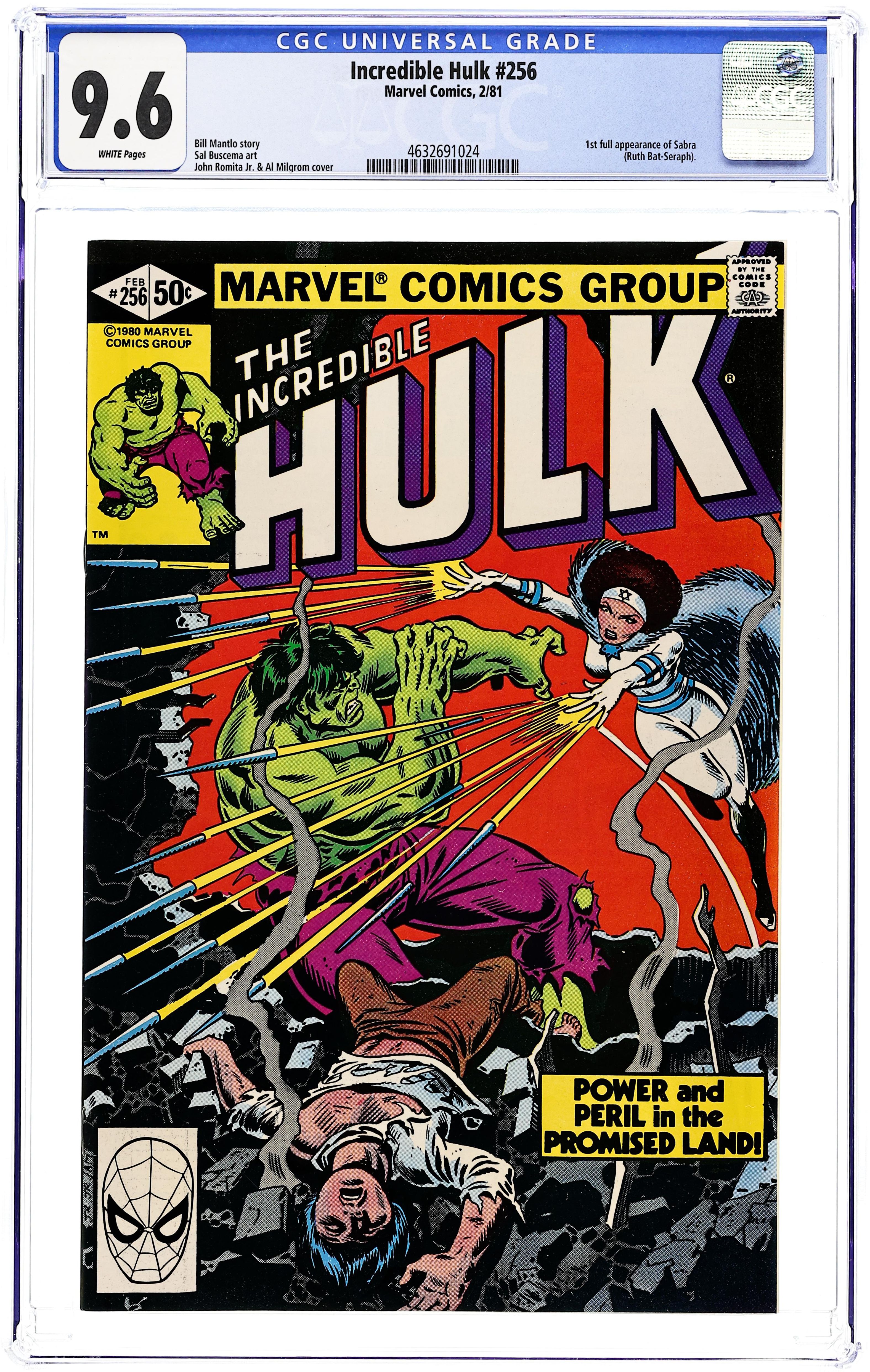 Direct Edition. 1st full appearance of Sabra. "Power in the Promise Land!" Story by Bill Mantlo. Art by Sal Buscema. The government decides to cut the funding for Gamma Base, siting it as a National Liability. Meanwhile, the Hulk arrives in Israel and soon does what the Hulk does. But, he will learn that America is not the only country with super-heroes, as the green goliath must now face Sabra super heroine of the state of Israel! 36 pages. Cover price $0.50.