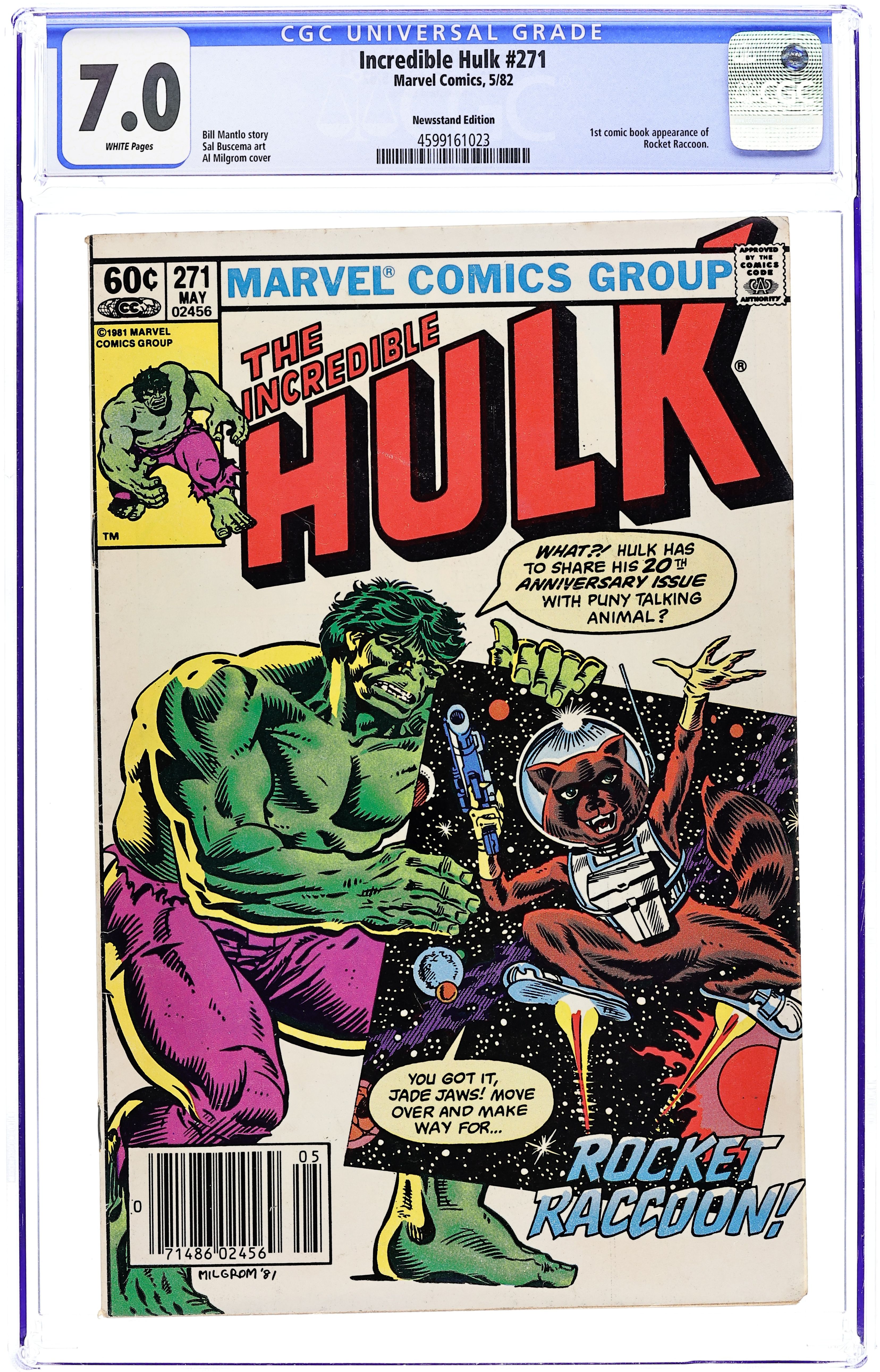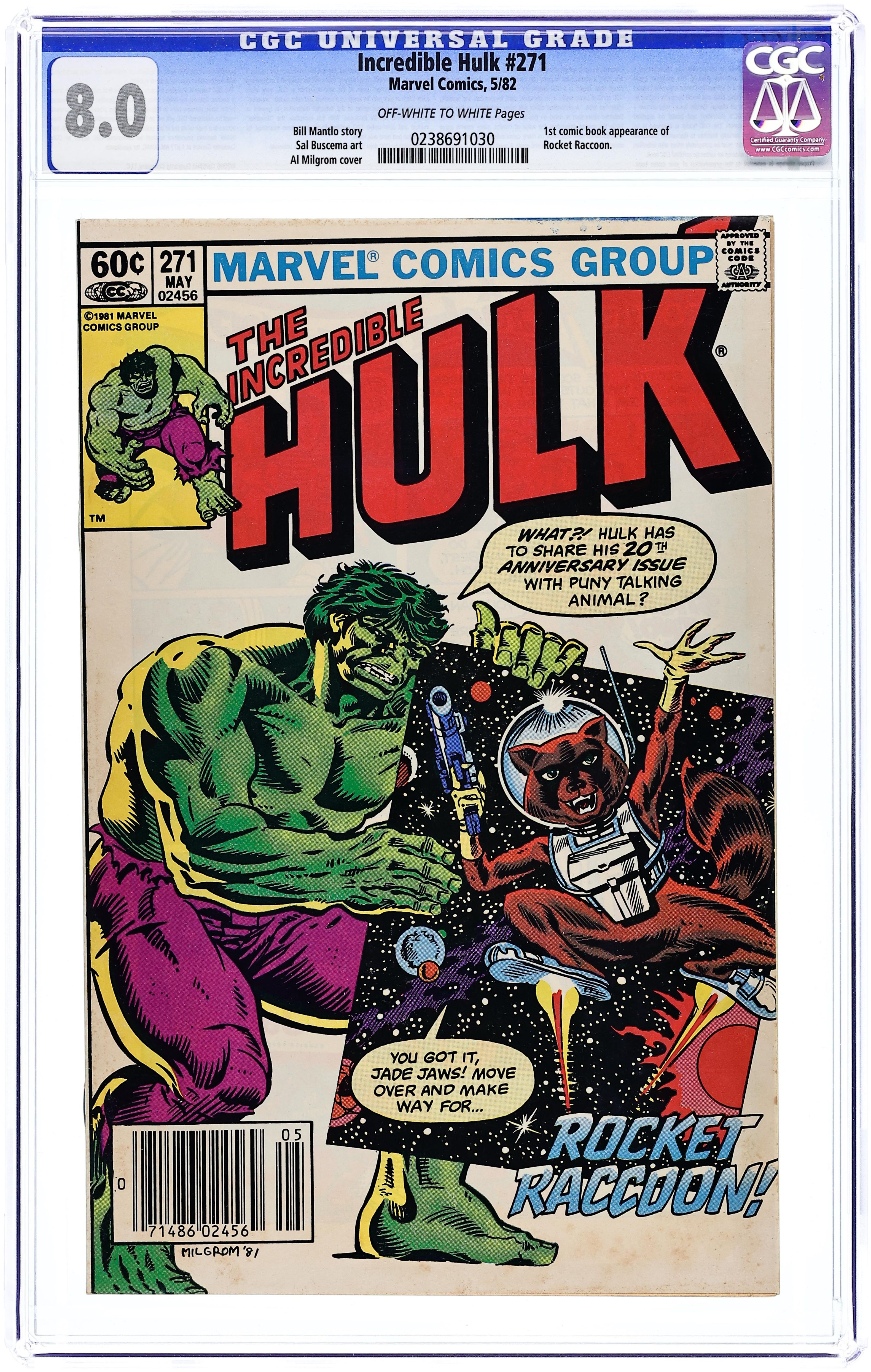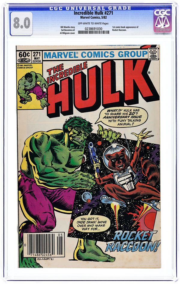 Newsstand Edition. 2nd appearance of Rocket Raccoon (see Marvel Preview #7 for 1st appearance). Story by Bill Mantlo. Art by Sal Buscema. The Hulk celebrates his 20th Anniversary with one of the most offbeat stories of all. Following the events of last issue, Hulk hurtles through the void only to run into the marvelous Rocket Raccoon and his band of colorful friends. Can the Hulk aid Rocket and his crew against the machiavellian Judson Jakes and his sinister scientist, the tortoise Uncle Pyko? 36 pages. Cover price $0.60.