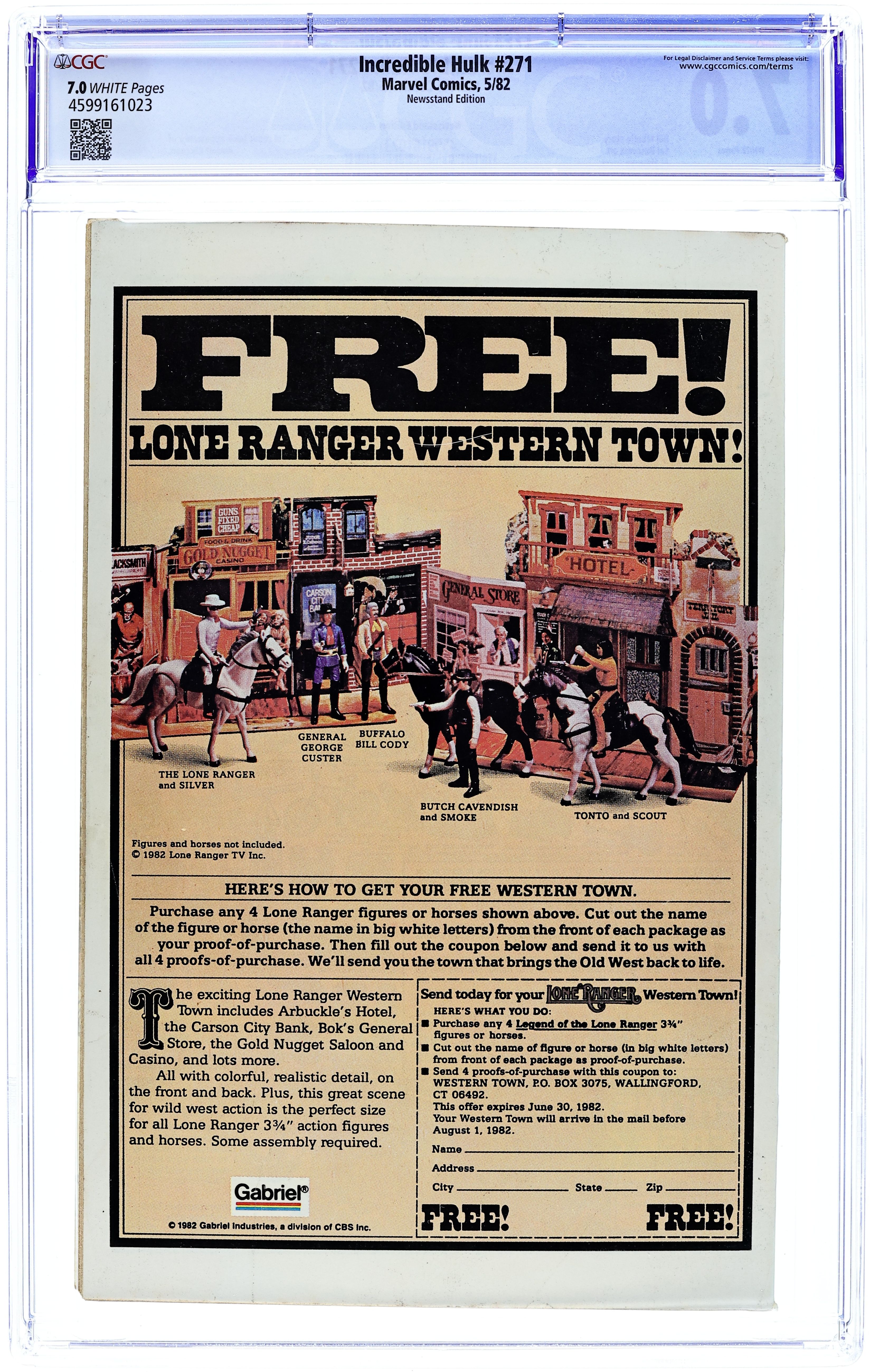 Direct Edition. "...to Hunt the Hulk!" Guest-starring the Soviet Super Soldiers. Captain America cameo. Story by Bill Mantlo. Art by Sal Buscema. Cover by Frank Miller. The Hulk's powerful legs propel him into Russia. Seeing him as a threat the Russian military calls in the Soviet Super Soldiers to handle it. But do Crimson Dynamo, Darkstar, Vanguard, and Major Ursa even have the power to stop the Hulk's rampage. Their titanic tussle draws the attention of a powerful evil, the Presence! Meanwhile, Rick Jones goes to the Avengers to ask for their help to save the Hulk. 36 pages. Cover price $0.50.