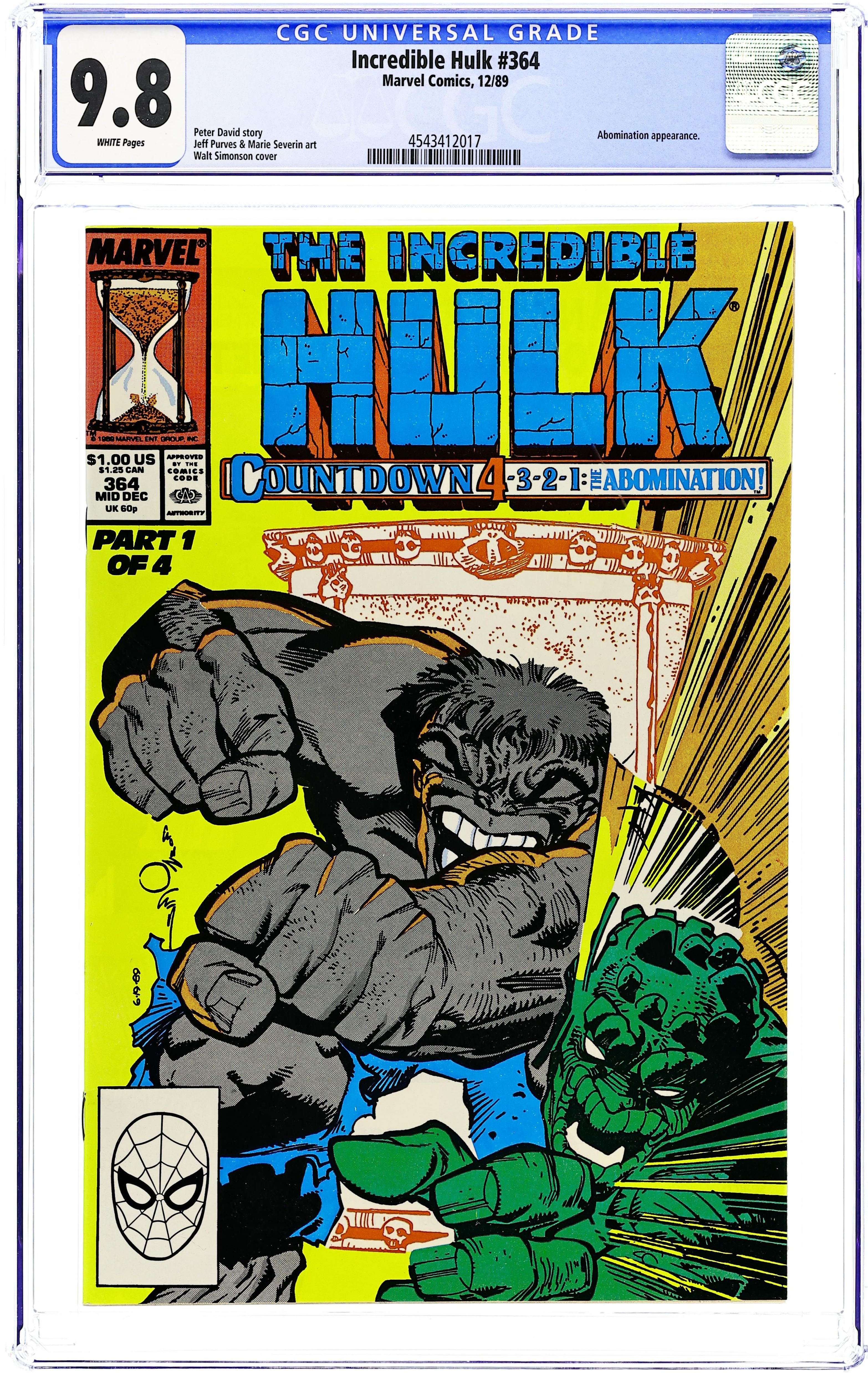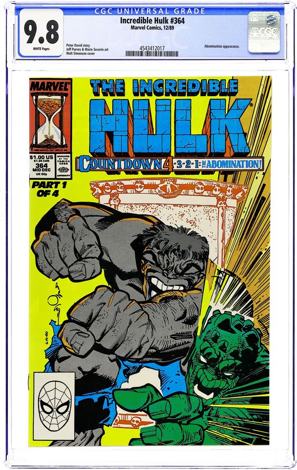 Cover art by Walt Simonson. Countdown Part 4: The Abomination, script by Peter David, pencils by Jeff Purves, inks by Marie Severin; Scientist Phil Stearns tags janitor Bruce Banner with a deadly poison that is going to kill him in sixteen hours; Unfortunately, Bruce has no idea that this has happened; When Abomination arrives at the nuclear testing facility and has only puny Banner to fight, he zaps Bruce with gamma radiation making him change into the Hulk during the day; This turns out to be a really bad move as the Hulk pours toxic chemicals on Blonsky, severely disfiguring him; The Hulk apparently suffers a heart attack thanks to Stearns' poison. 36 pgs. $1.00. Cover price $1.00.