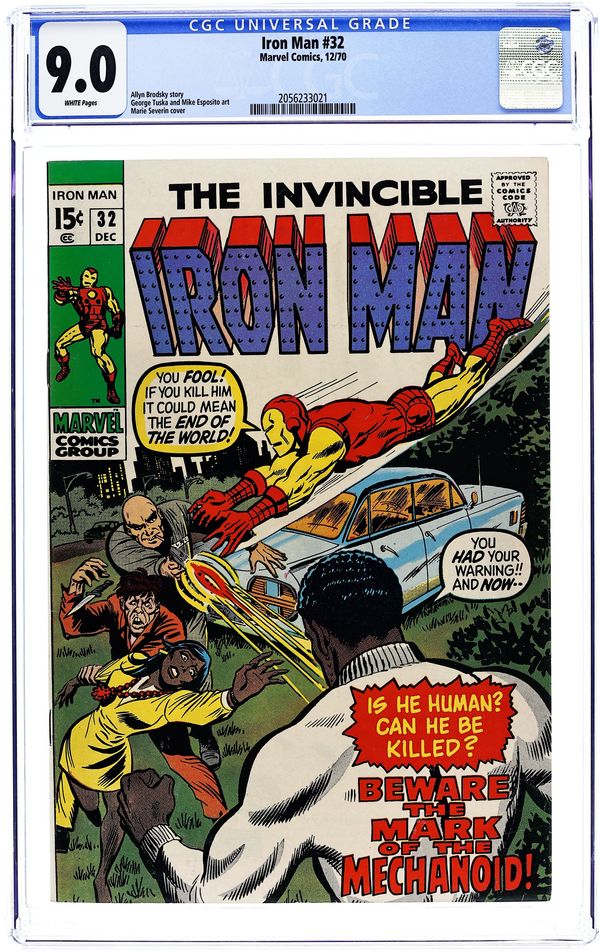 "Now Stalks the Cyborg-Sinister!" Story by Mike Friedrich. Art by George Tuska and Vince Colletta. The Cyborg-Sinister attacks Stark Industries in Long Island! Iron Man quickly arrives on the scene for a one-on-one fight to the death! Will Marianne's frightening vision come true? Meanwhile, Tony and Marianne have a big argument and call off their engagement. 32 pages Cover price $0.20.