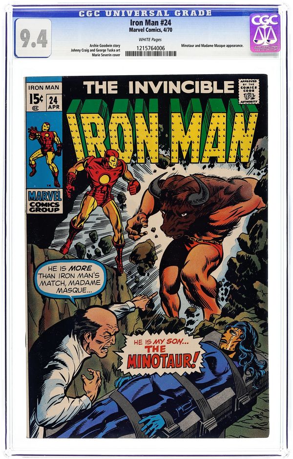 "My Son...The Minotaur!" Story by Archie Goodwin. Art by Johnny Craig and George Tuska. Cover by Marie Severin. Following the events of Iron Man 19, Madame Masque (aka Whitney Frost) washed up in a grotto on an Aegean Sea island. Now she is the unsuspecting prisoner of the twisted Dr. Vryolak and the Minotaur! The duo of Iron Man and Jasper Sitwell is on the way to free her, but can they rescue Madame Masque before Dr. Vryolak turns her into a mate for his son? 32 pages Cover price $0.15.