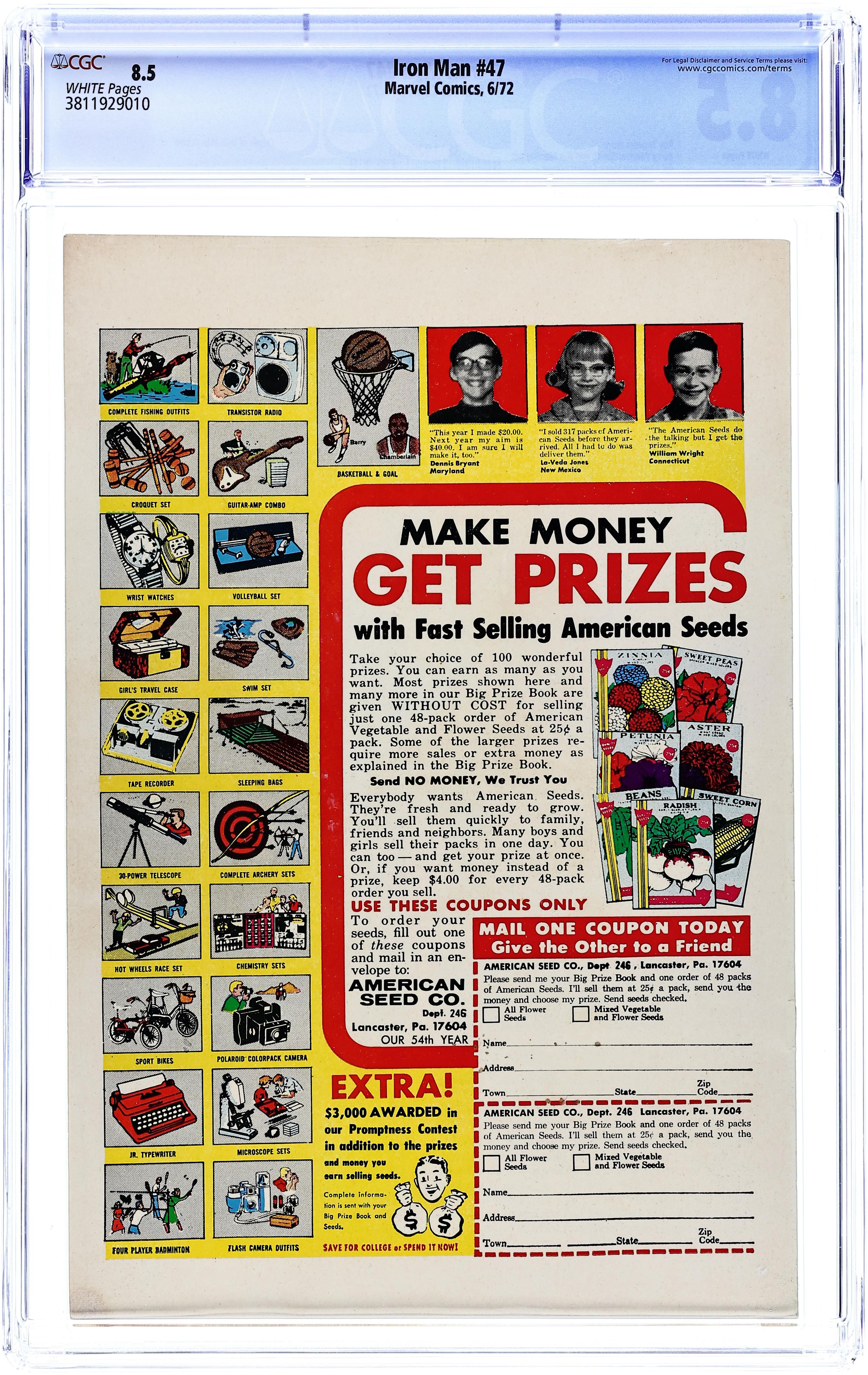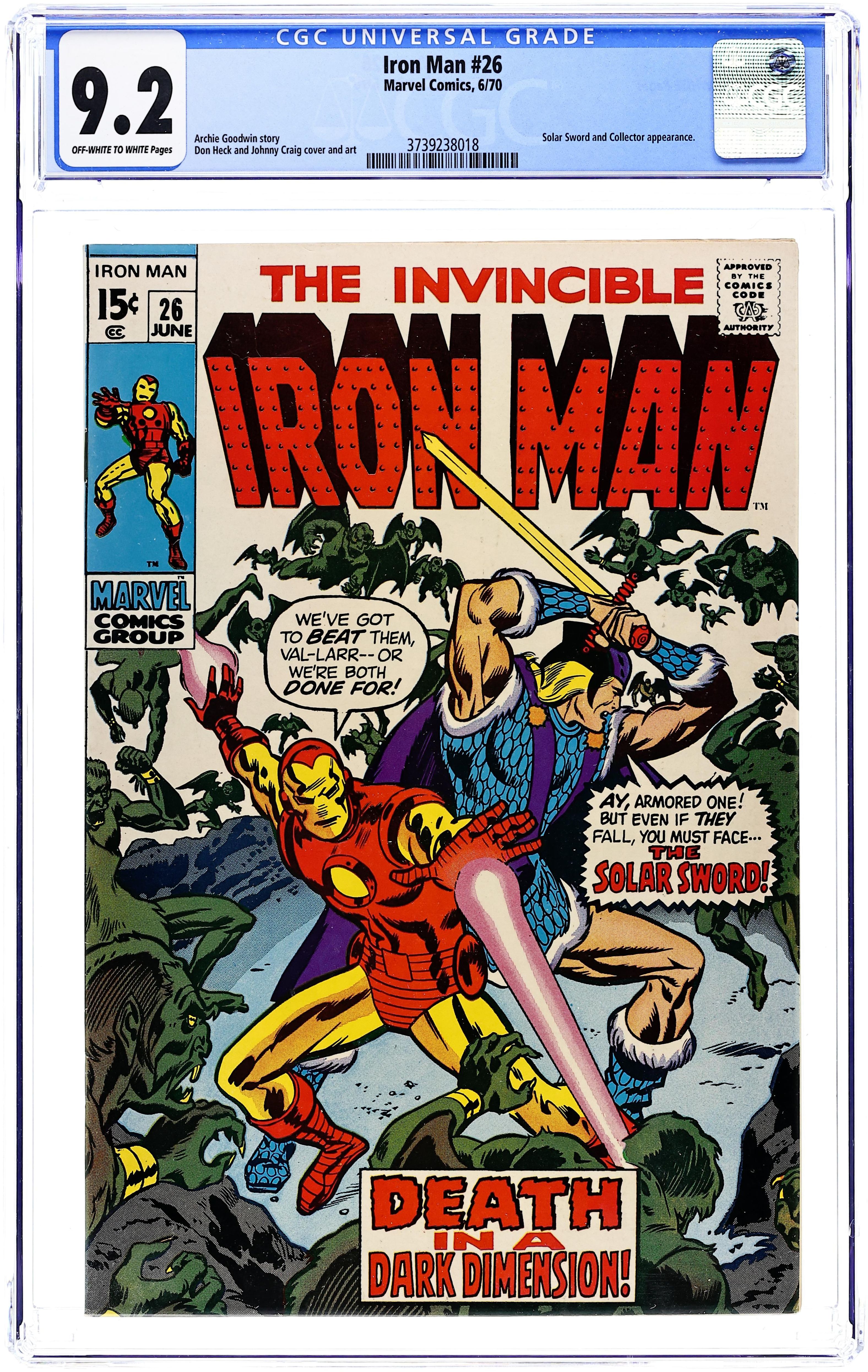"Duel In A Dark Dimension!" Story by Archie Goodwin. Art by Don Heck and Johnny Craig. The Collector wants to add the Freak (aka Happy Hogan) to his intergalactic collection! So the ancient elder of the universe abducts Pepper Hogan to lure her husband and Iron Man to his spaceship. After the Collector captures Happy, he proposes a trade to Iron Man. If Shell-head can obtain the solar sword from the dark dimension, the Collector will release both Pepper and Happy. Will the golden avenger betray Val-Larr, the owner of the solar sword, in order to save his friends? 32 pages Cover price $0.15.