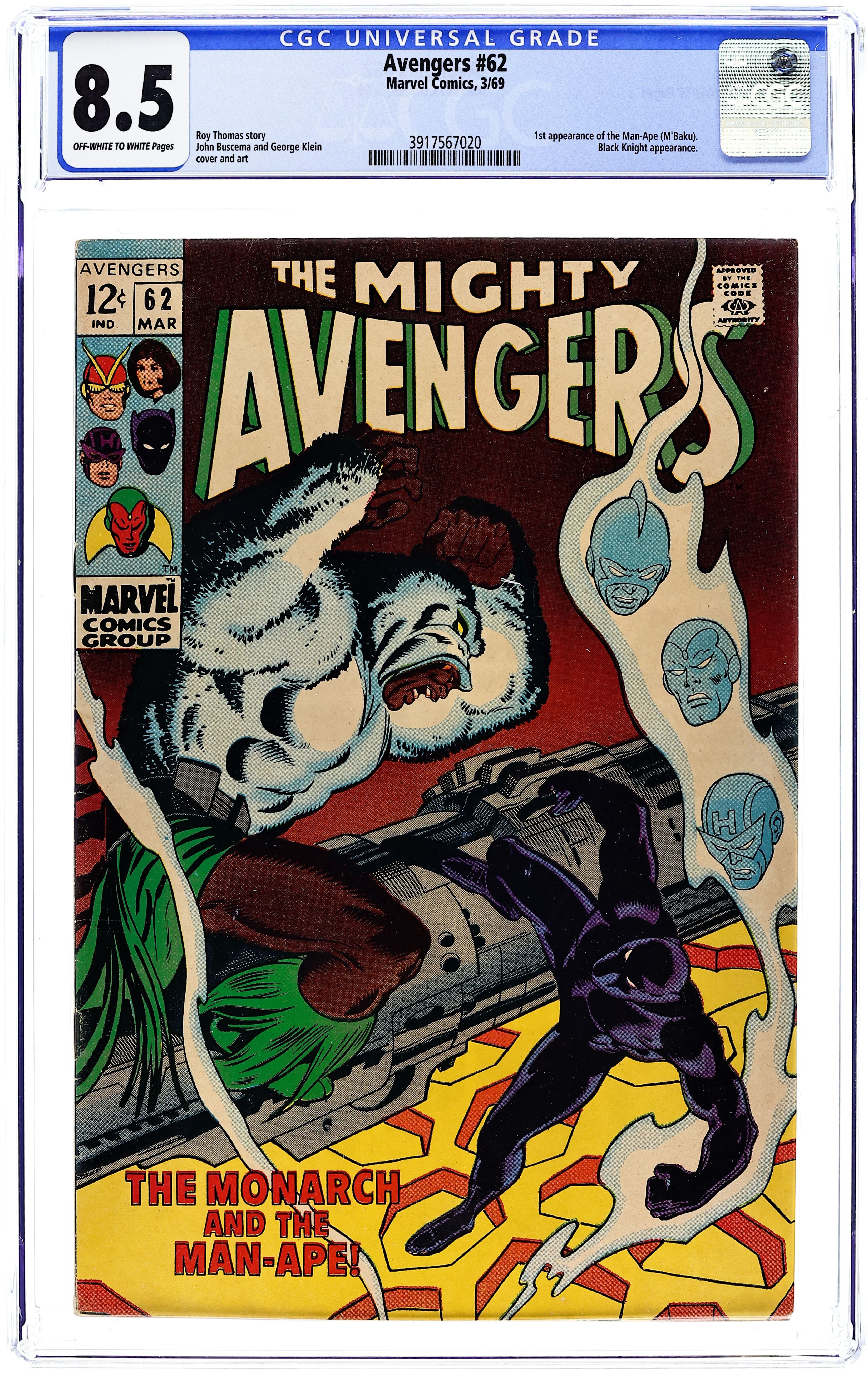 "The Monarch and the Man-Ape" First appearance of the Man-Ape. Script by Roy Thomas. Pencils by John Buscema. Inks by George Klein. Cover by John Buscema and George Klein. After their encounter with Ymir and Surtur, the Avengers travel to the Black Panther's homeland to recuperate! But unfortunately there is something rotten in the state of Wakanda! M'Baku, one of T'Challa's mightiest warriors, has usurped the throne and secretly taken on the identity of the Man-Ape! However, the Avengers don't know that when they sit down for the evening feast! Once his teammates succumb to M'Baku's drugged wine, the Black Panther must face his royal challenger alone! In the heart of the jungle, T'Challa battles for his throne and his life vs. the ferocious Man-Ape! Appearance by the Black Knight. Avengers Lineup: Black Panther, Hawkeye, and the Vision. (Notes: The Man-Ape returns in Avengers 78. The cover logo changes to "The Mighty Avengers" thru issue 69. The letters page also contains a statement of ownership: average print run 428,600; average paid circulation 276,951. This story was reprinted in Jungle Action 5.) 36 pages. 12 cent cover price. Cover price $0.12.