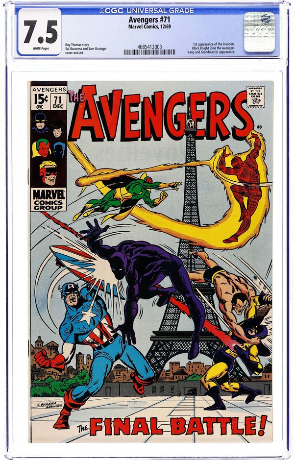 "Endgame!" Part 3 of 3. Guest-starring the Invaders (first appearance). Script by Roy Thomas. Pencils by Sal Buscema. Inks by Sam Grainger. Cover by Buscema and Grainger. The Avengers battle the Invaders in 1941 occupied France! Cameo appearances by Ravonna and the original 6th century Black Knight (aka Sir Percy). Notes: The plot of Avengers 71 overlaps with Invaders Annual 1 published eight years later in 1977. The last page is a pin-up featuring the Avengers. Kang returns in Incredible Hulk 135. This is the second appearance of the original Human Torch in Silver Age/Bronze Age continuity. This issue was reprinted in Marvel Super Action 32 and Giant Size (2008) Avengers Invaders. 36 pages. Cover price $0.15.