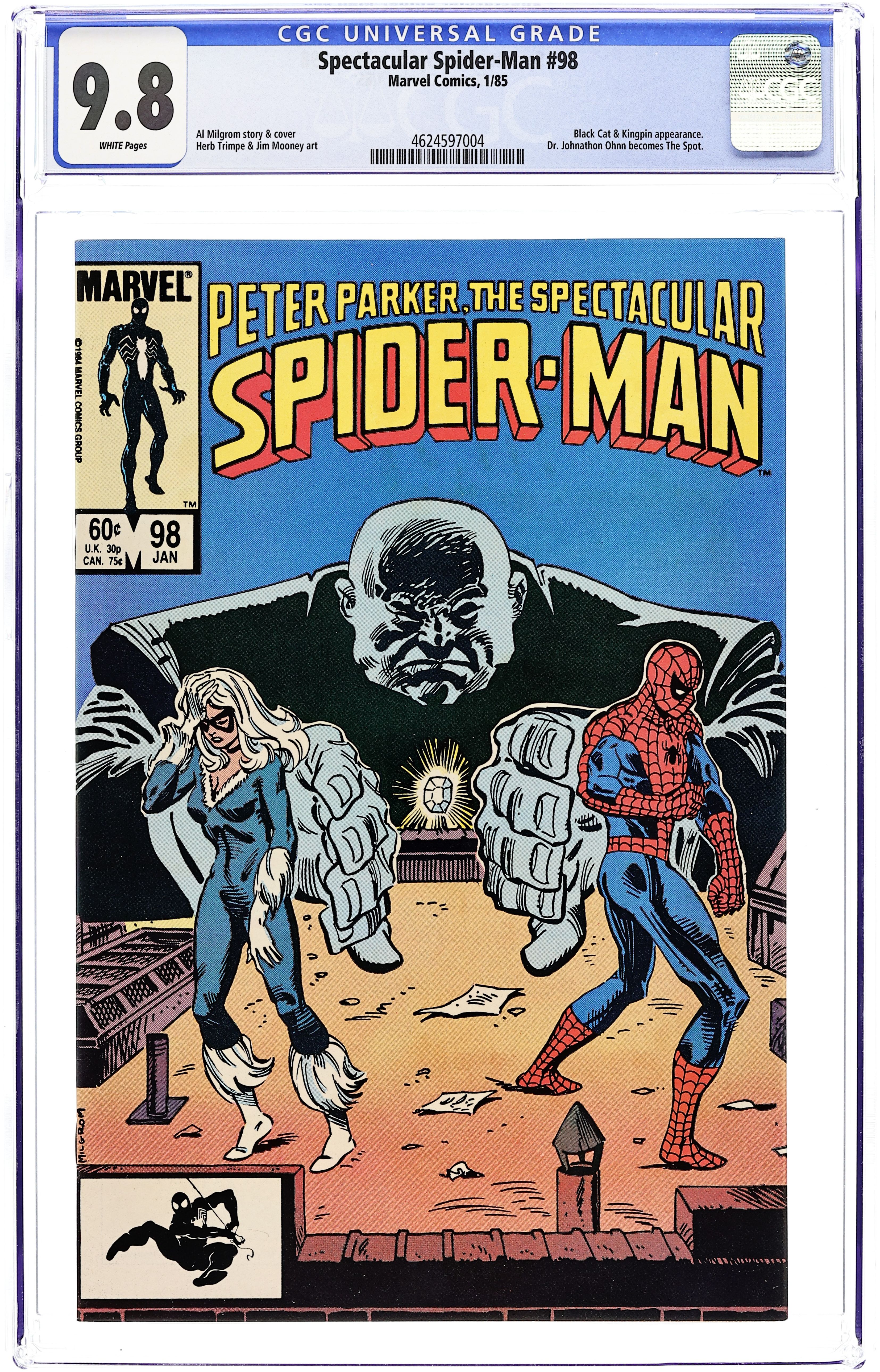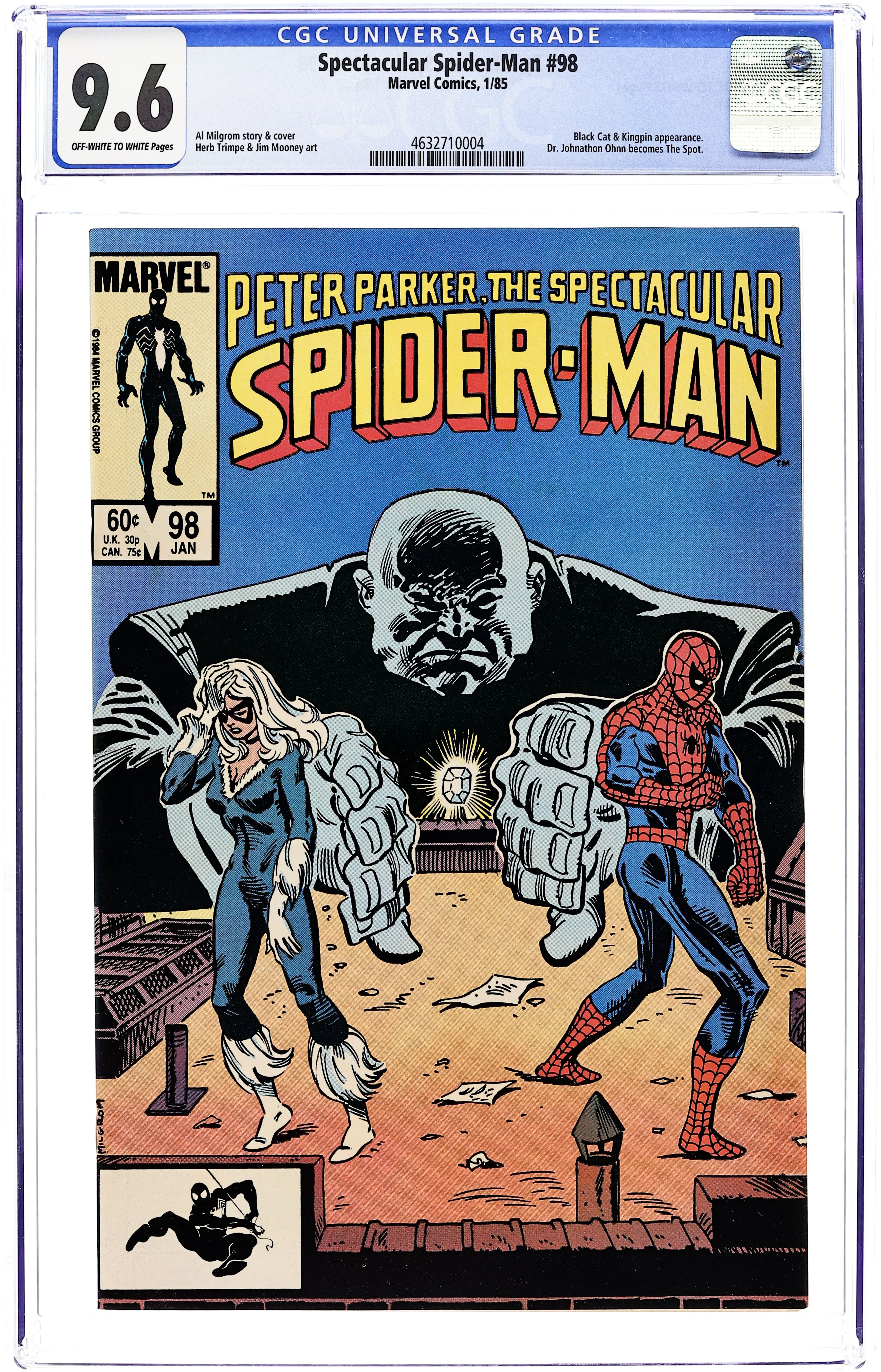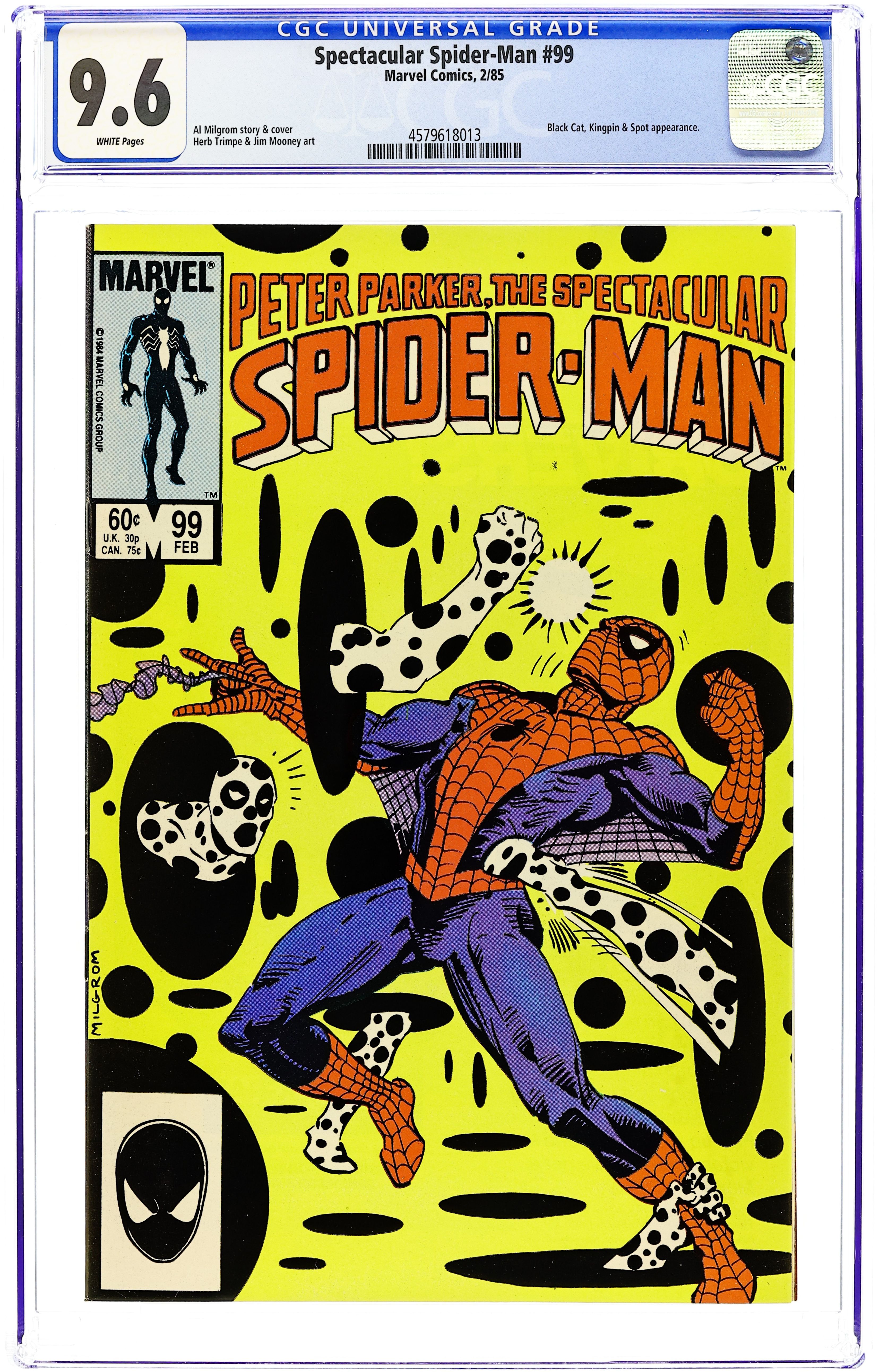 Direct Edition. "Breakin'!" Double-sized issue. Script and Pencils by Al Milgrom. Inks by Vince Colletta and Geof Isherwood. Cover by Al Milgrom. The wall-crawler returns to the Kingpin's skyscraper, but again runs into the pesky Spot! While Spider-Man fights the Spot, the Black Cat confronts the Kingpin and learns the tragic secret of her bad luck powers. A dejected Felicia elects not to attack the massive crime boss, but a few minutes later...the Spectacular Spider-Man does! It's a great slugfest between the Kingpin and the web-slinger! Meanwhile, as the battle is raging at the Kingpin's tower, the alien symbiote slips into Peter Parker's closet...and waits! (Note: The alien symbiote plot line continues in Web of Spider-Man 1.) 48 pages Cover price $1.00.