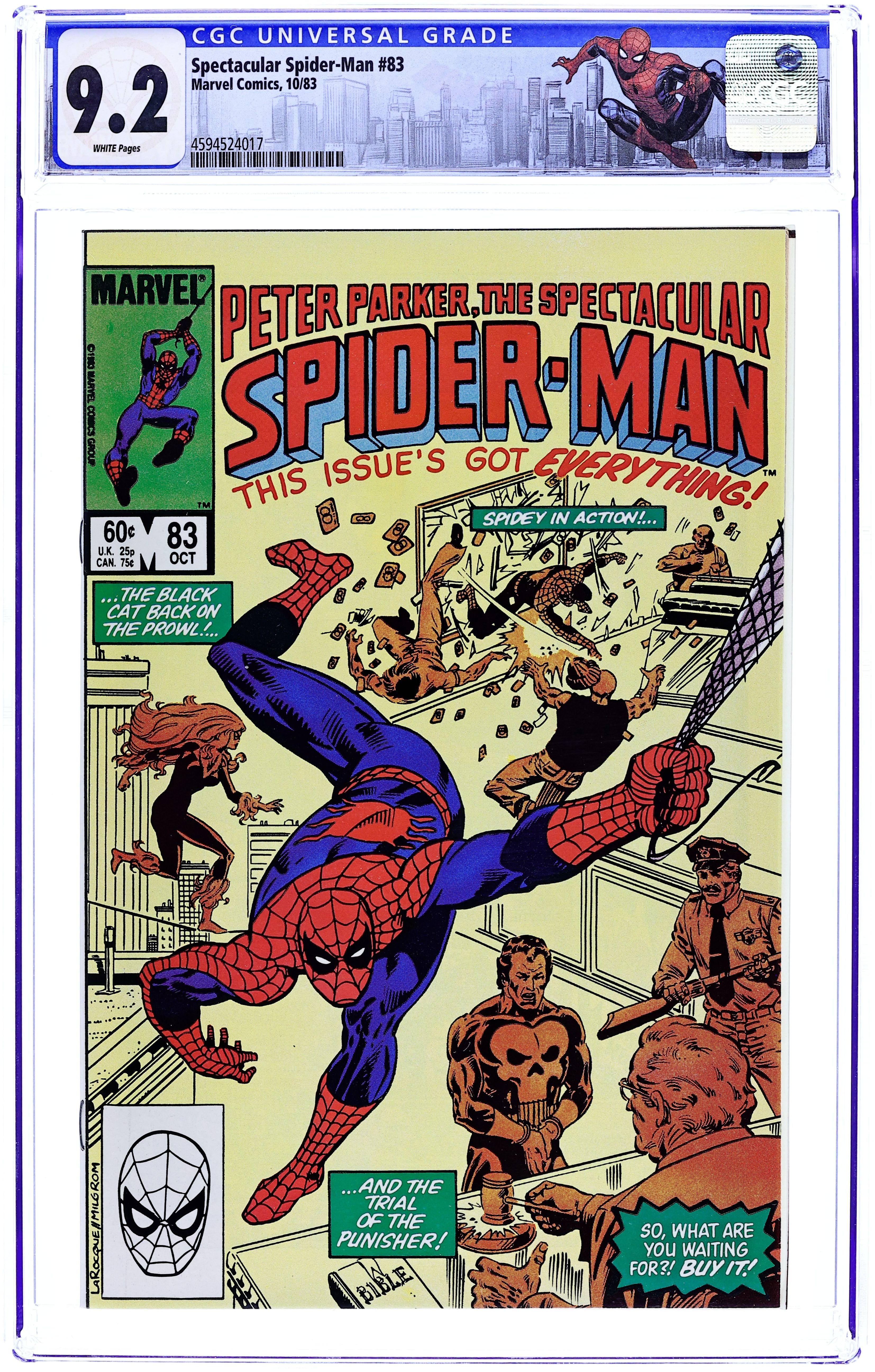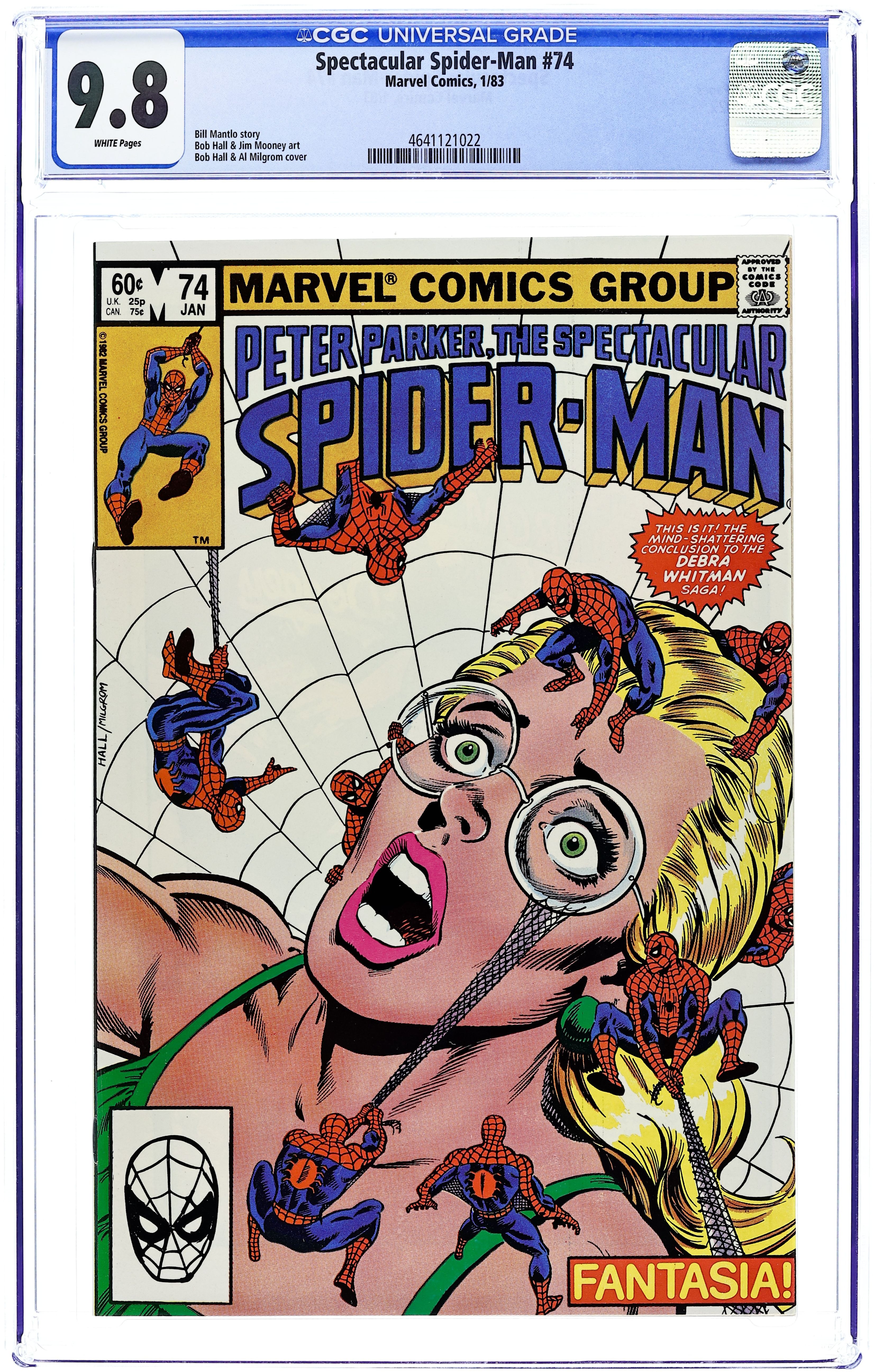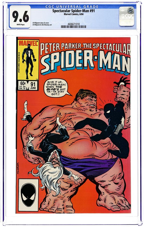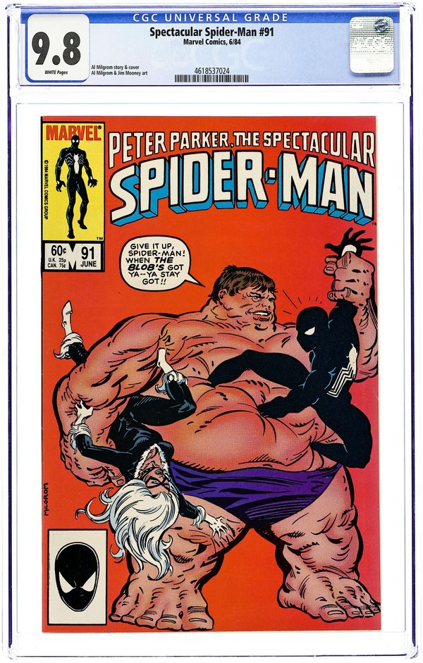 Direct Edition. "Breakin'!" Double-sized issue. Script and Pencils by Al Milgrom. Inks by Vince Colletta and Geof Isherwood. Cover by Al Milgrom. The wall-crawler returns to the Kingpin's skyscraper, but again runs into the pesky Spot! While Spider-Man fights the Spot, the Black Cat confronts the Kingpin and learns the tragic secret of her bad luck powers. A dejected Felicia elects not to attack the massive crime boss, but a few minutes later...the Spectacular Spider-Man does! It's a great slugfest between the Kingpin and the web-slinger! Meanwhile, as the battle is raging at the Kingpin's tower, the alien symbiote slips into Peter Parker's closet...and waits! (Note: The alien symbiote plot line continues in Web of Spider-Man 1.) 48 pages Cover price $1.00.