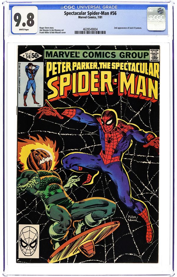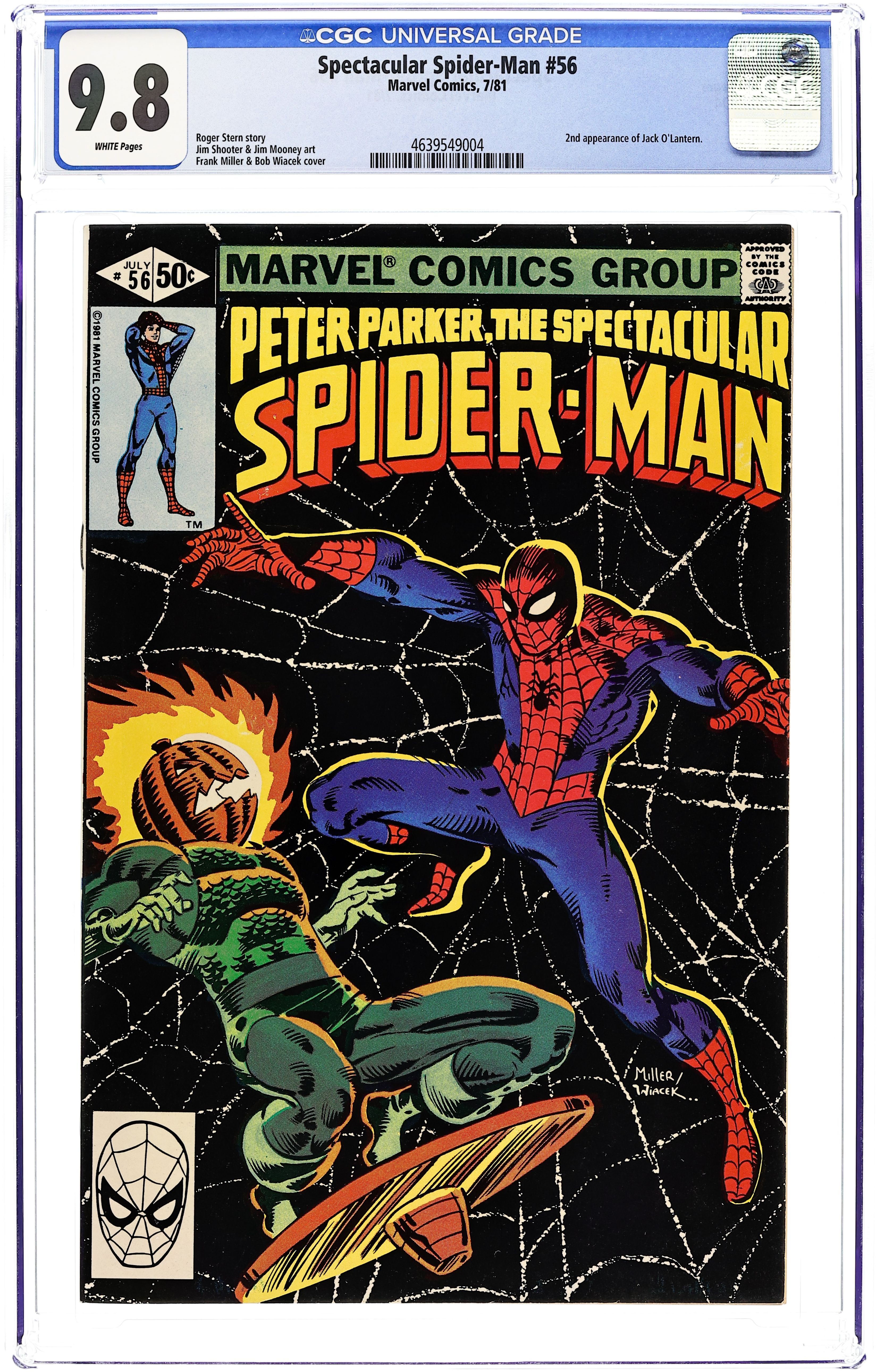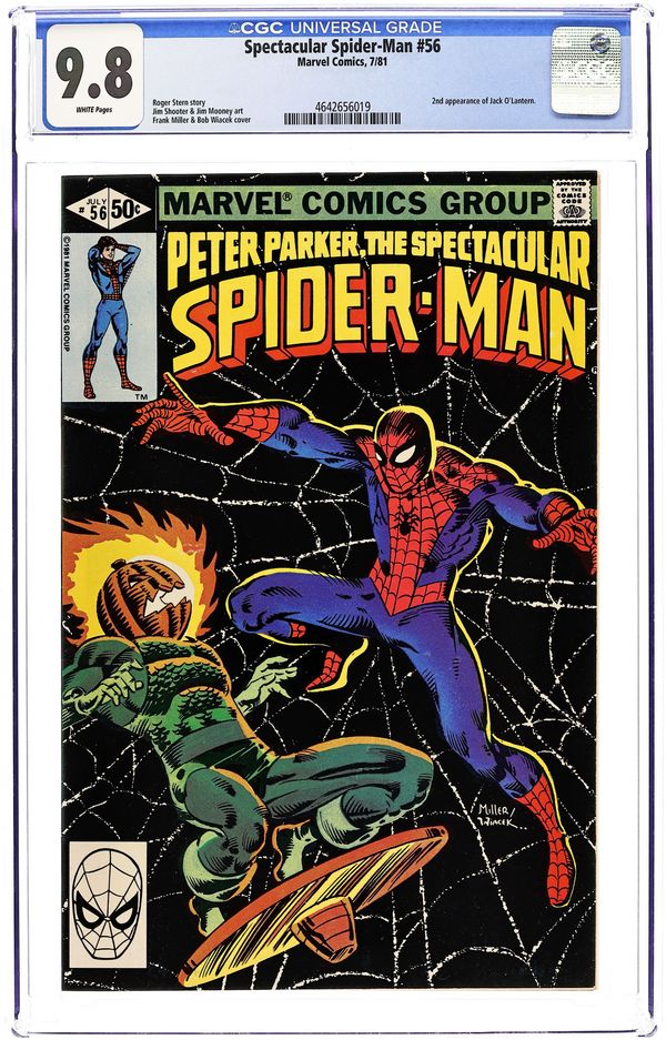 Direct Edition. "The Peril...and the Pumpkin?" Script by Roger Stern. Art by Jim Shooter (layouts) and Jim Mooney (finishes). Cover by Frank Miller and Bob Wiacek. Second appearance of Jack O'Lantern (aka Jason Macendale). The evil terrorist, Jack O'Lantern, has taken the staff and patients at Bellevue Hospital hostage! And the hostage list includes Aunt May's fiancé, Nathan Lubensky! However, the wondrous wall-crawler is on the way; and Jack O'Lantern will soon be on the run! Meanwhile at Empire State University, Steve Hopkins' prank on Marcy Kane goes terribly wrong. Cameo appearances by Nitro and the Vulture. (Notes: Jack O'Lantern first appeared in Machine Man 19. Jason Macendale eventually became the Hobgoblin in Amazing Spider-Man 289. This issue includes a full-page ad for Marvel Treasury Edition 28 "Superman and Spider-Man.") 32 pages Cover price $0.50.