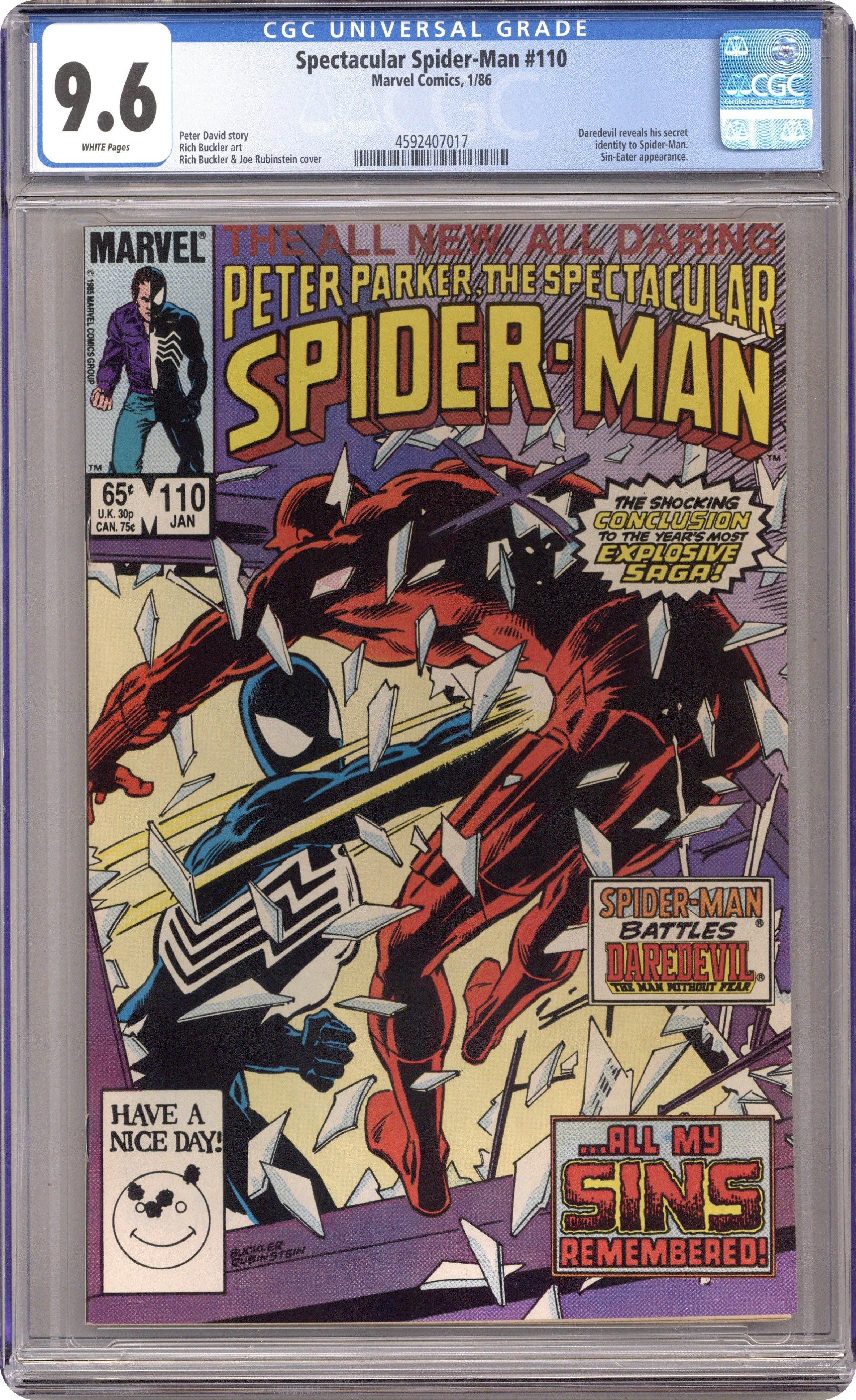 Direct Edition. "Original Sin" Part 1 of 4. Guest-starring Daredevil. Script by Peter David. Pencils by Rich Buckler. Inks by Brett Breeding. Cover by Rich Buckler. The critically acclaimed Death of Jean DeWolff storyline begins with this issue. In a stunning development, police captain Jean DeWolff is found murdered in her apartment. The entire city is in a state of shock over the killing including the police department, the staff at the Daily Bugle, and the Amazing Spider-Man. The web-slinger (in his black costume) begins investigating the homicide by meeting with the detective assigned to the case, Stan Carter. However, another superhero, Daredevil, gets the first shot at stopping the murderous rampage of the Sin-Eater! First appearance of the Sin-Eater. 32 pages Cover price $0.65.