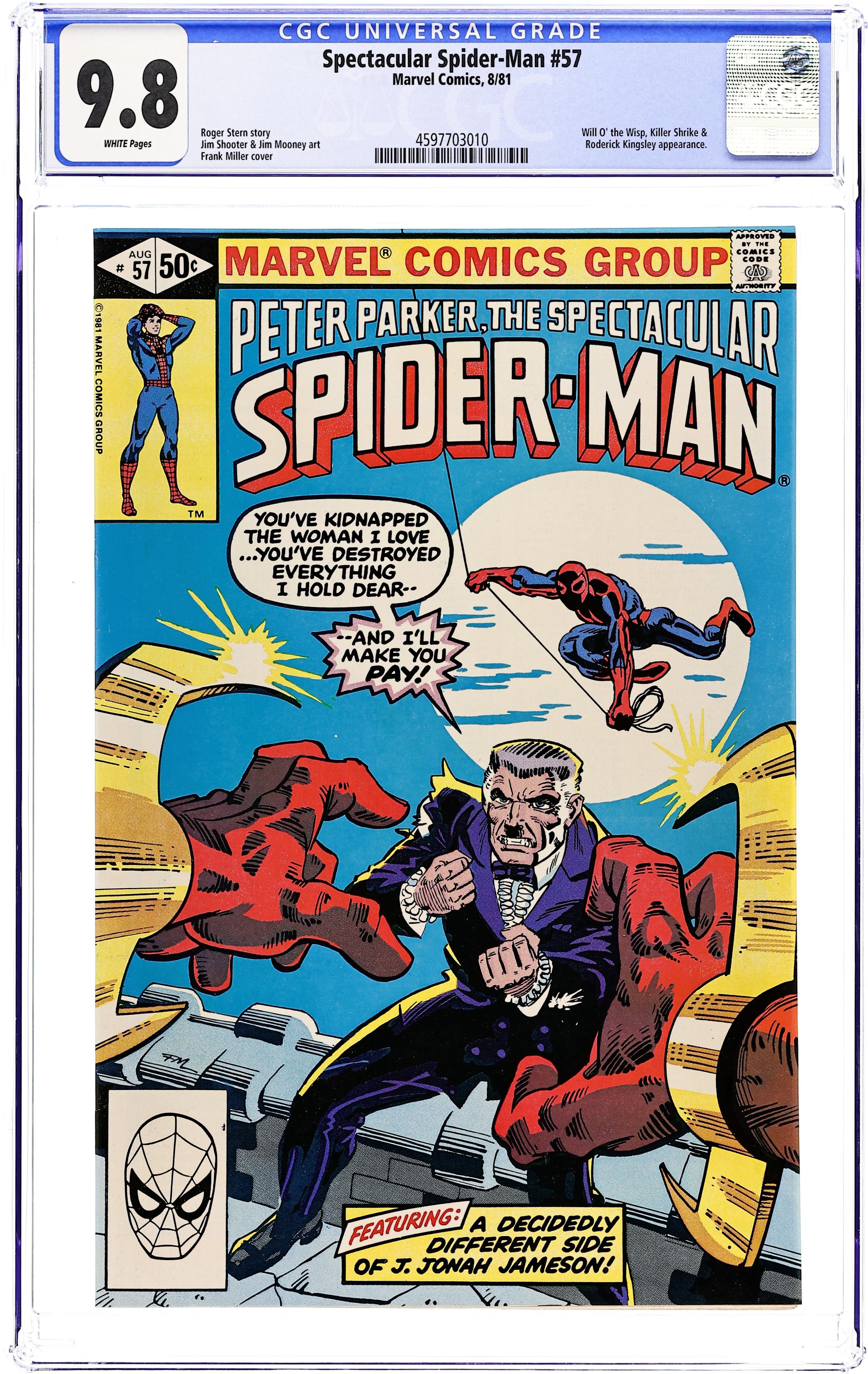 Direct Edition. "These Wings Enslaved!" Script by Roger Stern. Art by Jim Shooter (layouts) and Jim Mooney (finishes). Cover by Frank Miller. J. Jonah Jameson hosts a high society party to celebrate Dr. Marla Madison's appointment as the Brand Corporation's new director of research. It's a wonderful evening for Jonah, until Killer Shrike crashes the party and abducts Marla! The web-slinger follows in hot pursuit and all roads lead to the Brand Corporation's special powers lab in New Jersey! The wall-crawler is ready to battle Killer Shrike, but is he ready for the return of Will-O'-the-Wisp? 32 pages Cover price $0.50.