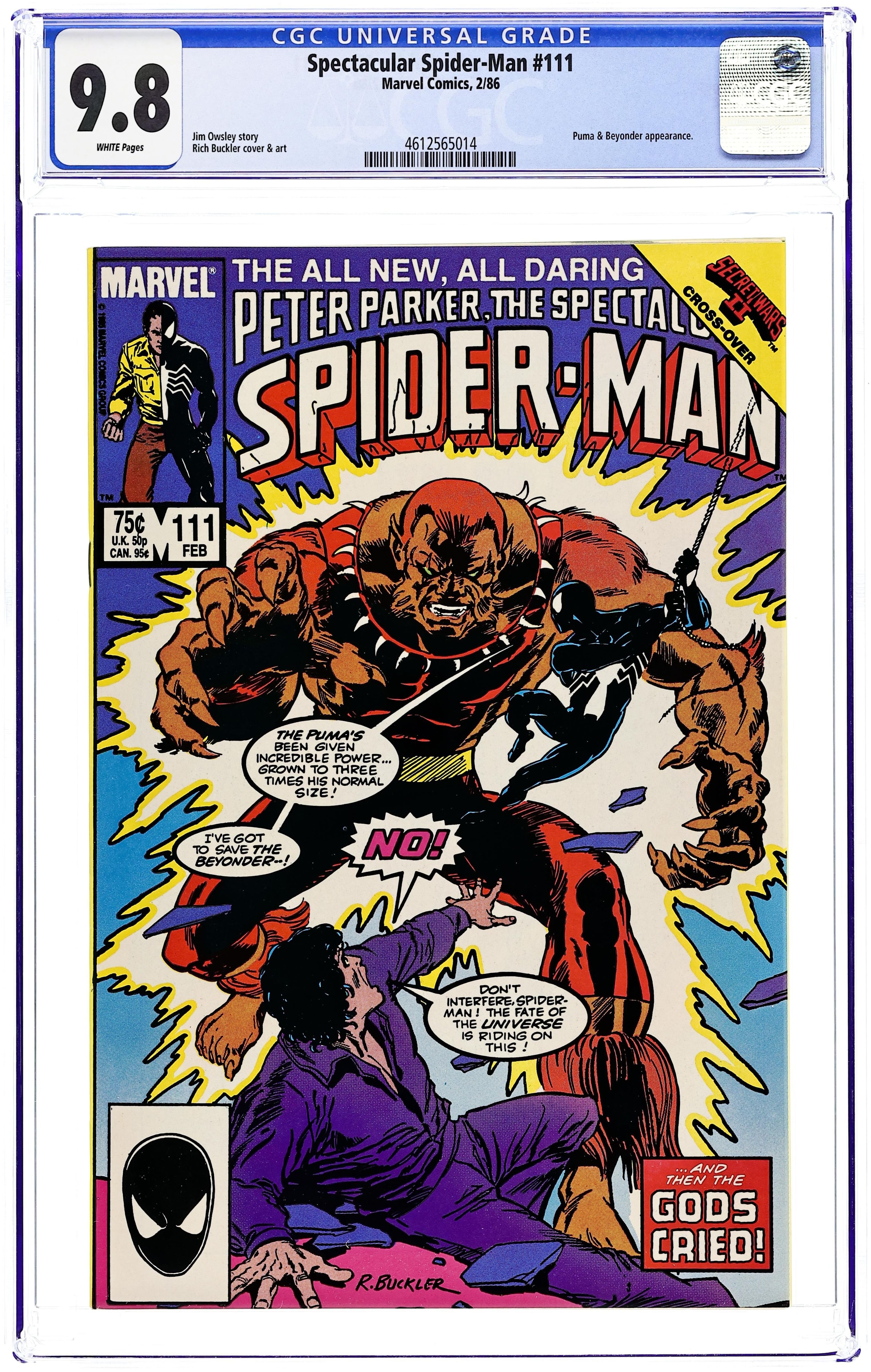 "And Then The Gods Cried" Secret Wars II crossover. Script by Jim Owsley. Pencils by Rich Buckler. Inks by (unnamed) many hands. Cover by Rich Buckler. Following the events of Amazing Spider-Man 273, the Beyonder and the Puma meet in Japan. After their confrontation, Thomas Fireheart is convinced more than ever that the Beyonder must be destroyed, so he returns to New York and tries to recruit the reluctant wall-crawler to his cause. The high-powered showdown among the web-slinger, Puma, and Beyonder takes place at a nightclub! First 75¢ issue. 32 pages Cover price $0.75.