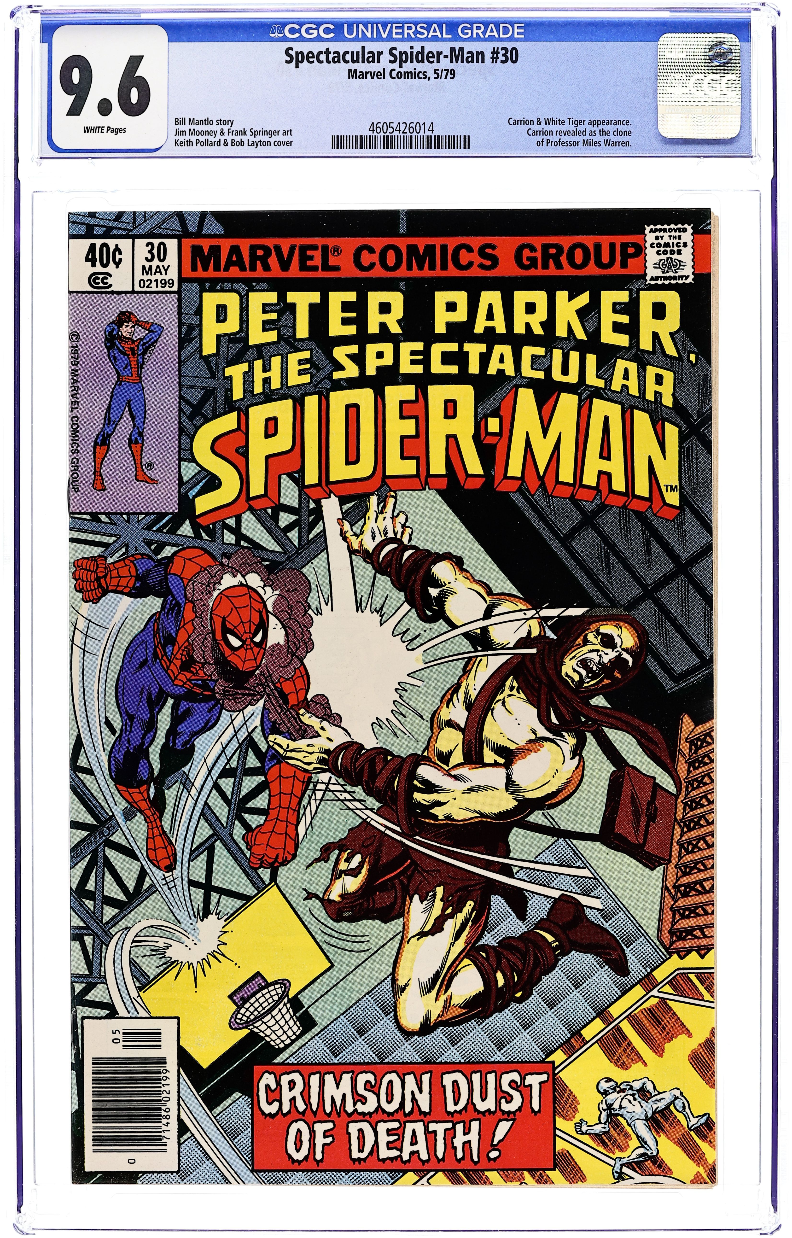 "Secret as the Grave!" Script by Bill Mantlo. Pencils by Jim Mooney. Inks by Frank Springer. Cover by Keith Pollard and Bob Layton. Carrion has charged Spider-Man with the murders of both Gwen Stacy and Professor Miles Warren! What is Carrion's connection to the people from Peter Parker's past? Now in the ESU campus gymnasium, the wall-crawler and the White Tiger will fight together against the evil of Carrion! First 40¢ issue. 32 pages Cover price $0.40.