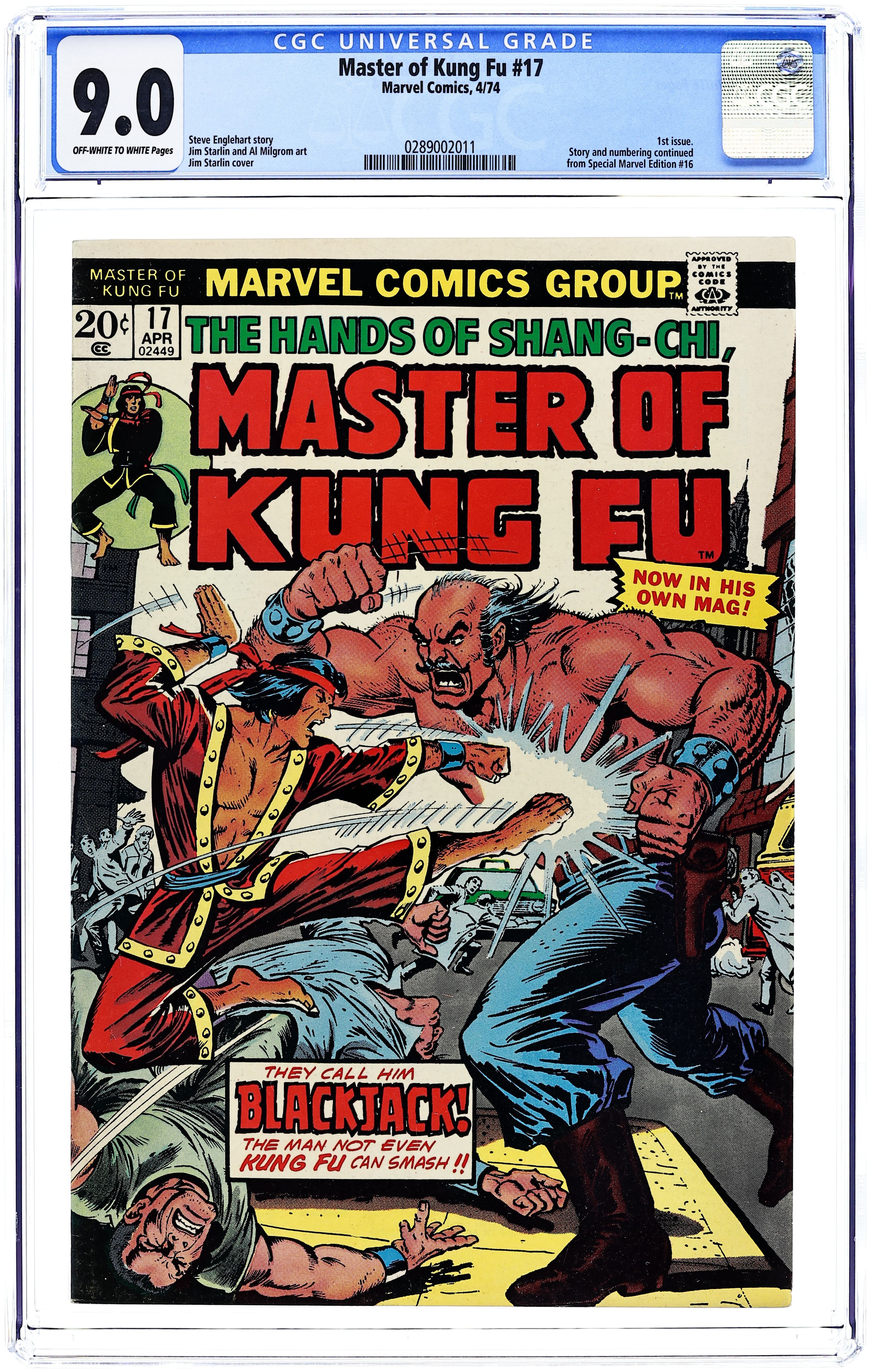 First issue of the series (continues from Special Marvel Edition). "Lair of the Lost!" Script by Steve Englehart, pencils by Jim Starlin, inks by Al Milgrom. What good is it being the Master of Kung Fu if you are facing Blackjack, the man not even Kung Fu can smash? The letters page includes the Marvel Value Stamp series A # 53 (The Grim Reaper). Cover price $0.25.