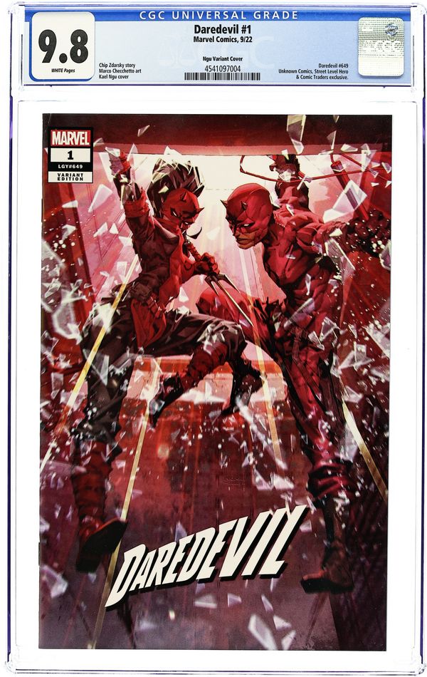 Comics Illuminati (Unknown Comics, Street Level Hero, and Comic Traders) Exclusive Cover by Kael Ngu. Written by Chip Zdarsky. Art by Marco Checchetto. AN ALL-NEW ERA OF DAREDEVIL STARTS HERE! After the shocking events of DEVIL'S REIGN, what is left of DAREDEVIL? Who lived, who died, and who is left to pick up the pieces? CHIP ZDARSKY and his superstar collaborator MARCO CHECCHETTO turn their gaze to a future full of peril and pain, in this - the explosive beginning of an all new era for Hell's Kitchen's guardian devil, and the most important DAREDEVIL issue of the year (until next month.)! 40 pages, full color. Rated T+
