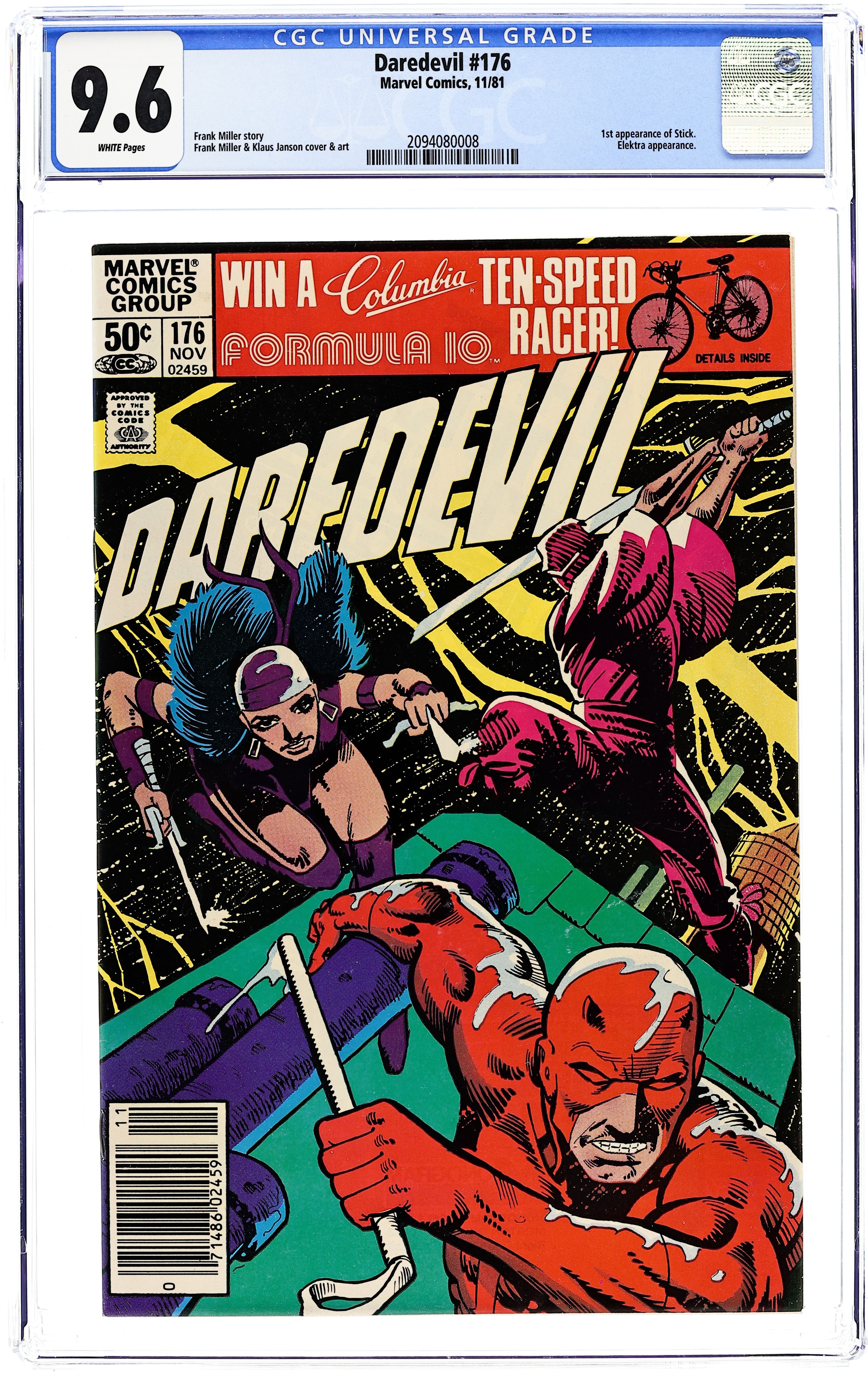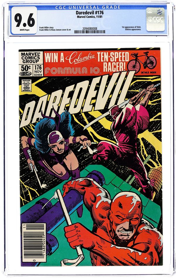 Newsstand Edition. Cover pencils by Frank Miller, inks by Frank Miller and Klaus Janson. First appearance of Stick in Hunters, script by Frank Miller, pencils by Frank Miller (breakdowns) and Klaus Janson (finished art), inks by Klaus Janson; DD and Elektra hunt down Matt's old teacher Stick; Turk steals the Mauler uniform to try and take down DD; Elektra has a final confrontation with Kirigi. 32 pgs. Cover price $0.50. Cover price $0.50.