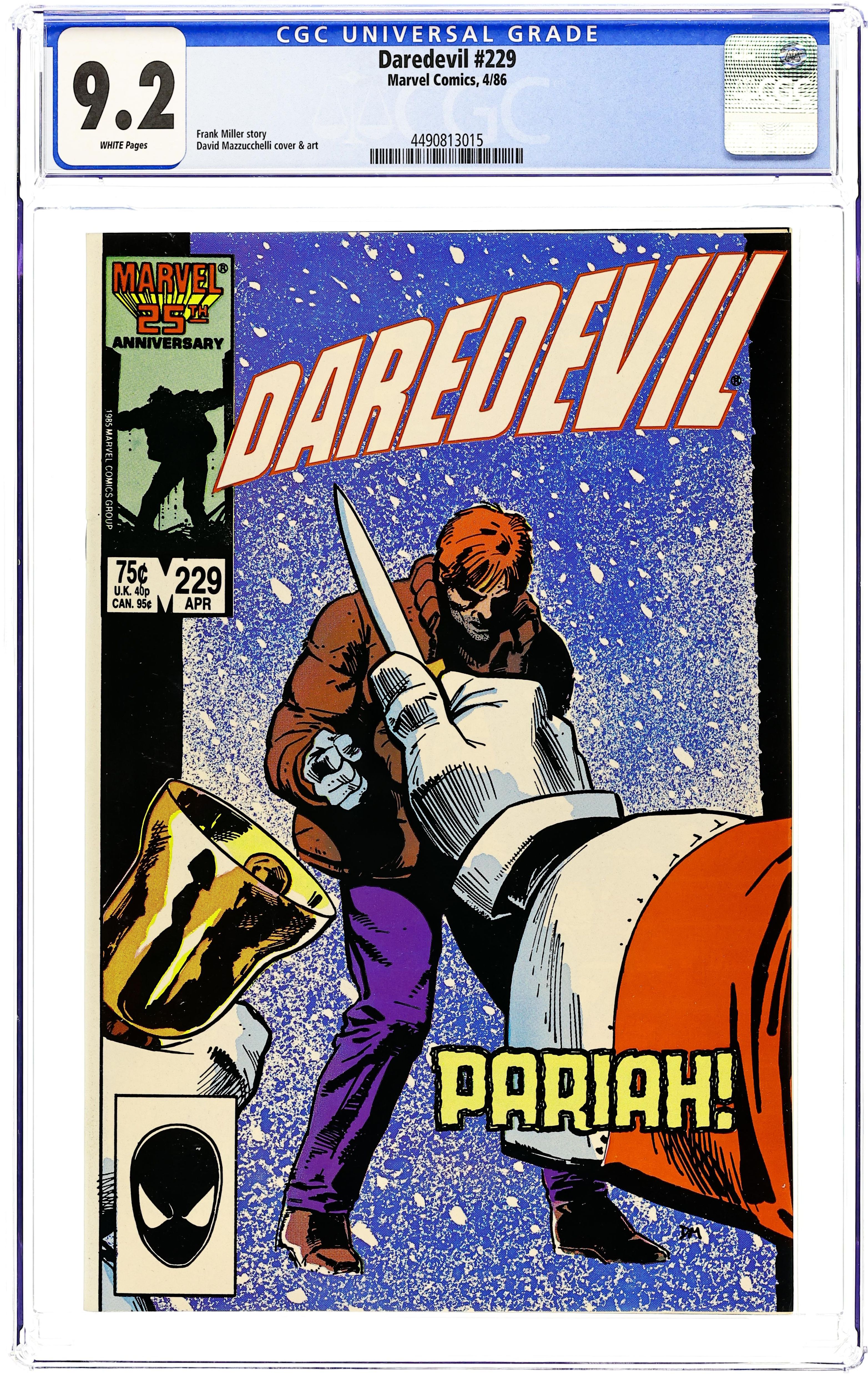 Cover art by David Mazzucchelli. Pariah!, script by Frank Miller, art by David Mazzucchelli; brief Daredevil Origin; Turk dressed as Santa knifes Matt in the gut; Ben is warned off of investigating a story about Murdock and the Kingpin; a wounded Matt is tended by Sister Maggie; takes place Dec. 25th; part 3 of critically acclaimed Born Again storyline. 36 pgs. Cover price $0.75. Cover price $0.75.