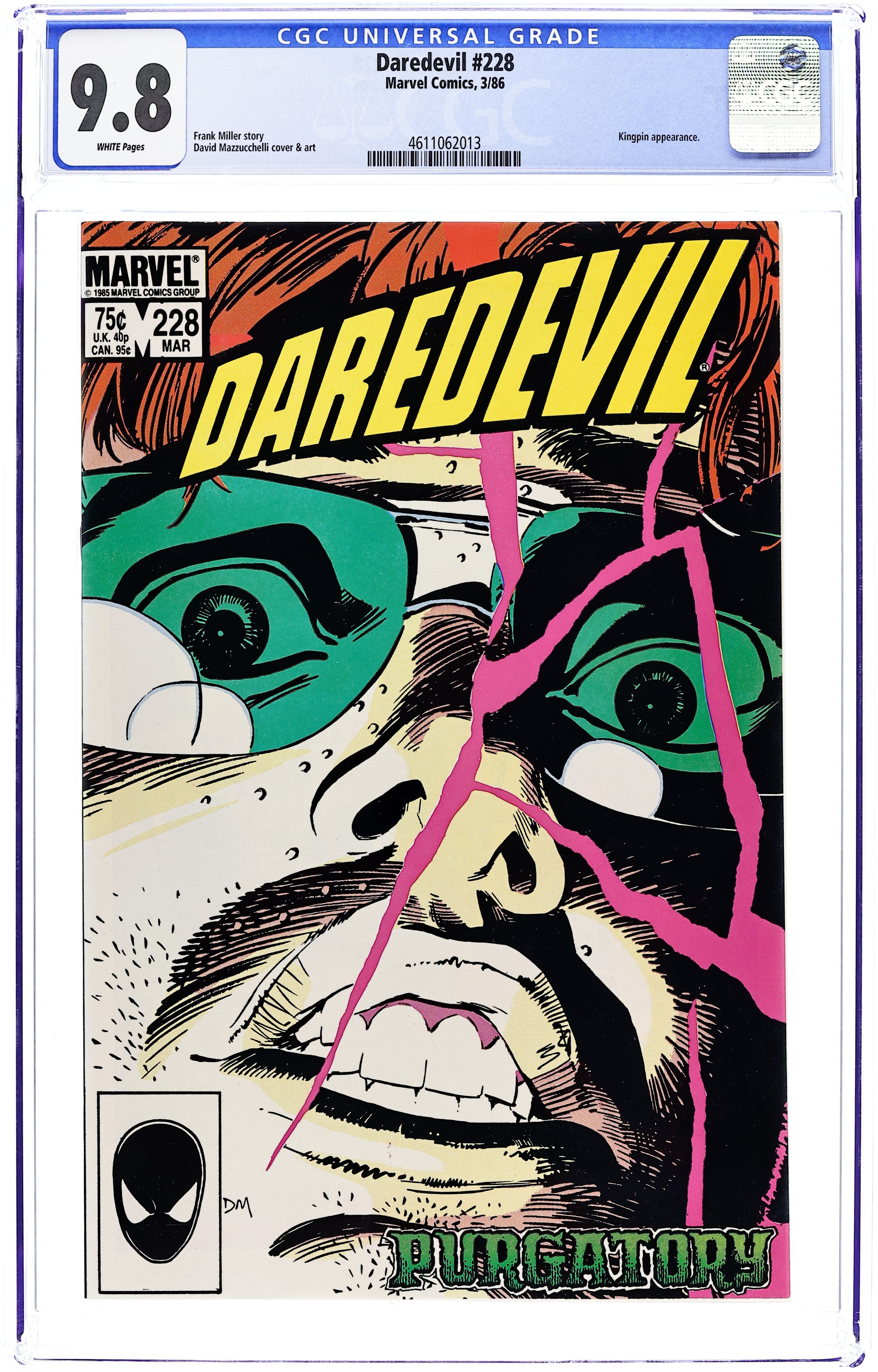 Direct Edition. Cover art by David Mazzucchelli. Purgatory, script by Frank Miller, art by David Mazzucchelli; the Kingpin's war against Daredevil continues, and Matt's life continues to unravel; Matt confronts the Kingpin directly and is beaten senseless; part 2 of critically acclaimed Born Again storyline. 36 pgs. Cover price $0.75. Cover price $0.75.