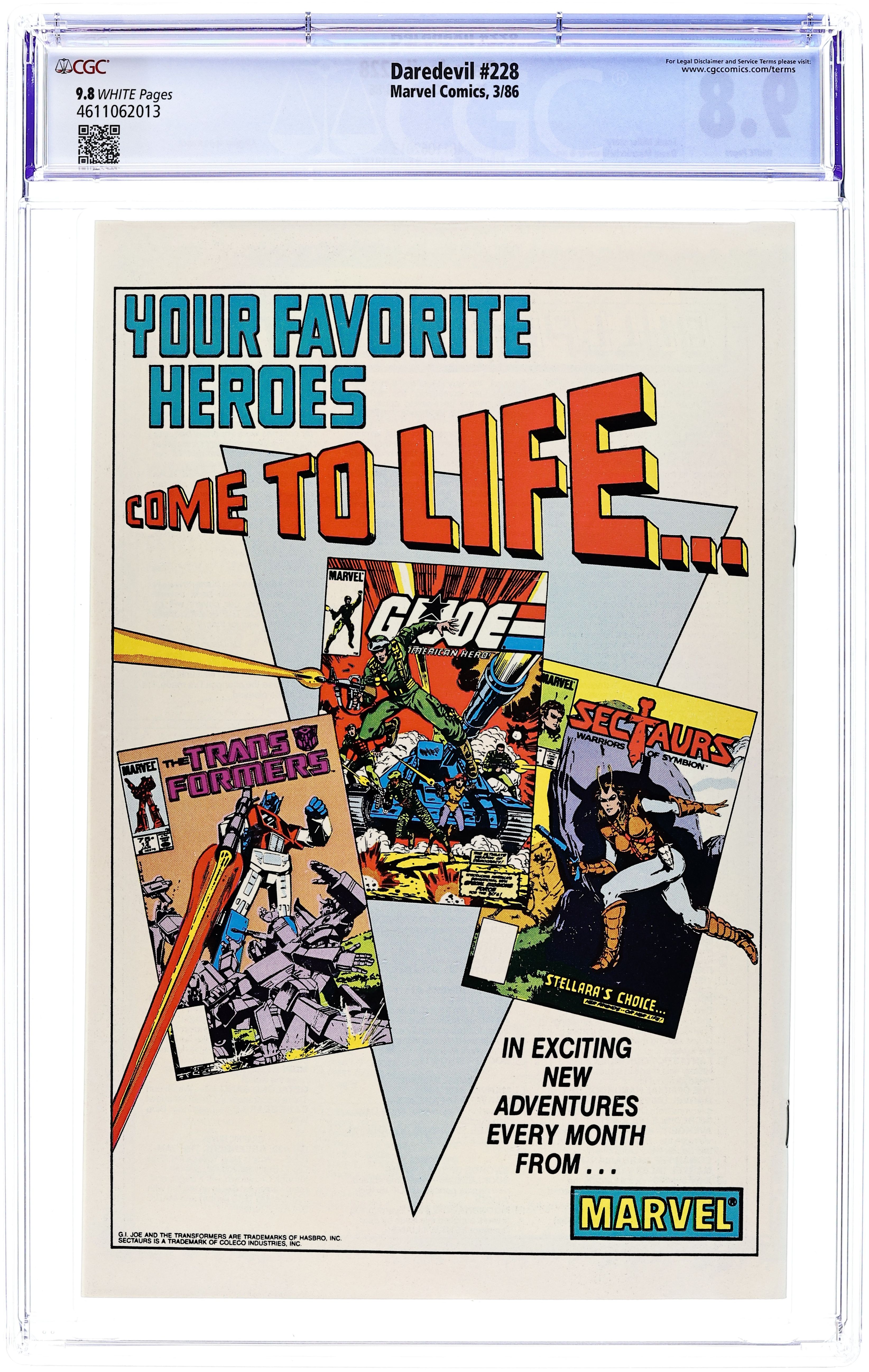 Cover art by David Mazzucchelli. Armageddon, script by Frank Miller, art by David Mazzucchelli; Captain America intervenes in Daredevil's battle with Nuke and finds out that the government has still been using the Super Soldier Program; Cap and DD link Kingpin with the Nuke fiasco and ruin his reputation; cameos by Thor and Iron Man; part 7 (conclusion) of critically acclaimed Born Again storyline. 36 pgs. Cover price $0.75. Cover price $0.75.