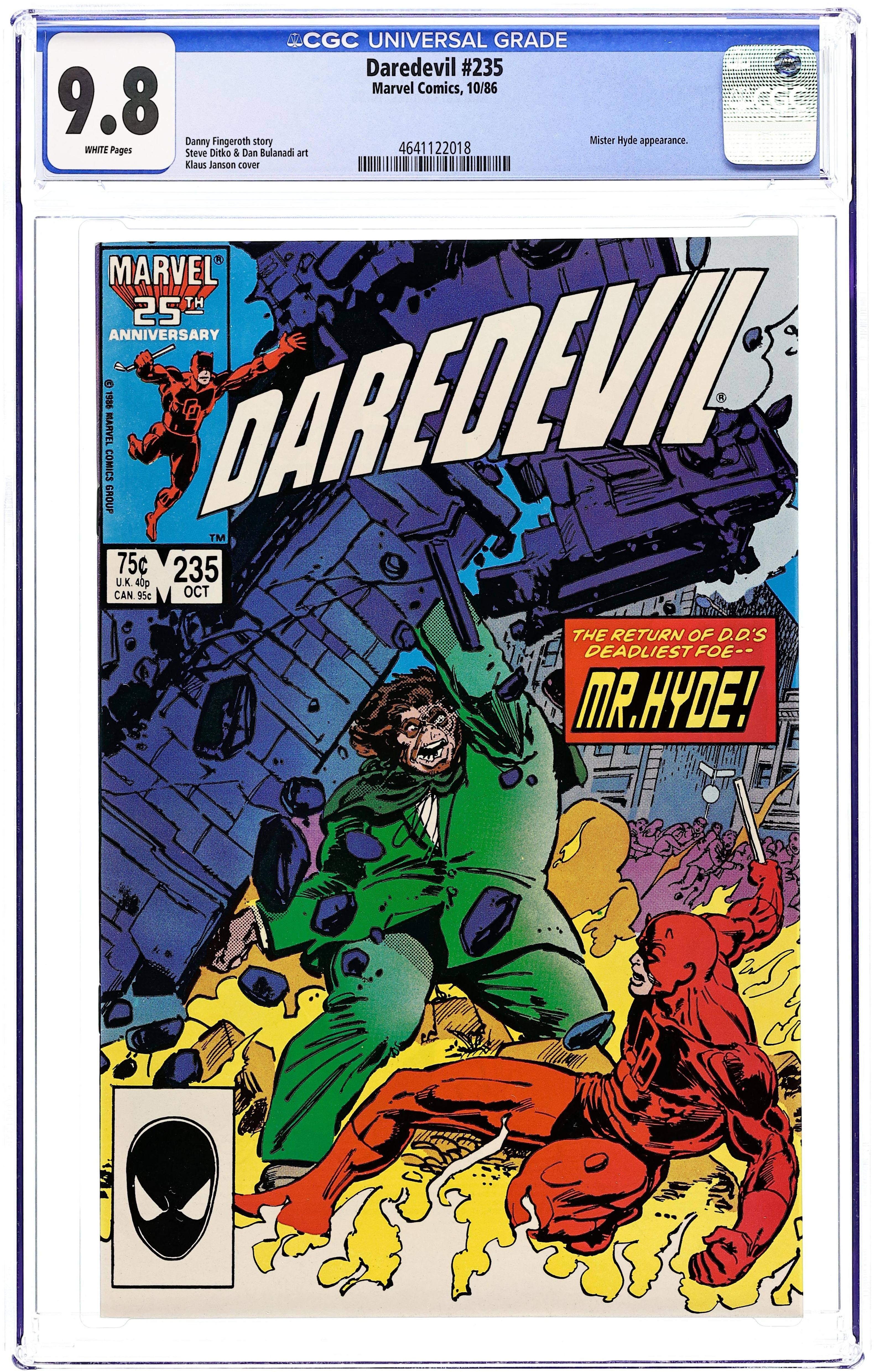 Direct Edition. Cover art by Klaus Janson. A Safe Place starring Daredevil, Karen Page, and Mr. Hyde, cameo flashback by Battling Jack Murdock, Fixer, Cobra, and Thor, script by Danny Fingeroth, pencils by Steve Ditko (breakdowns), inks by Danny Bulanadi (finisher); DD accidentally prevents Hyde from taking a formula that would have transformed him back into Calvin Zabo for good. 32 pgs. Cover price $0.75. Cover price $0.75.