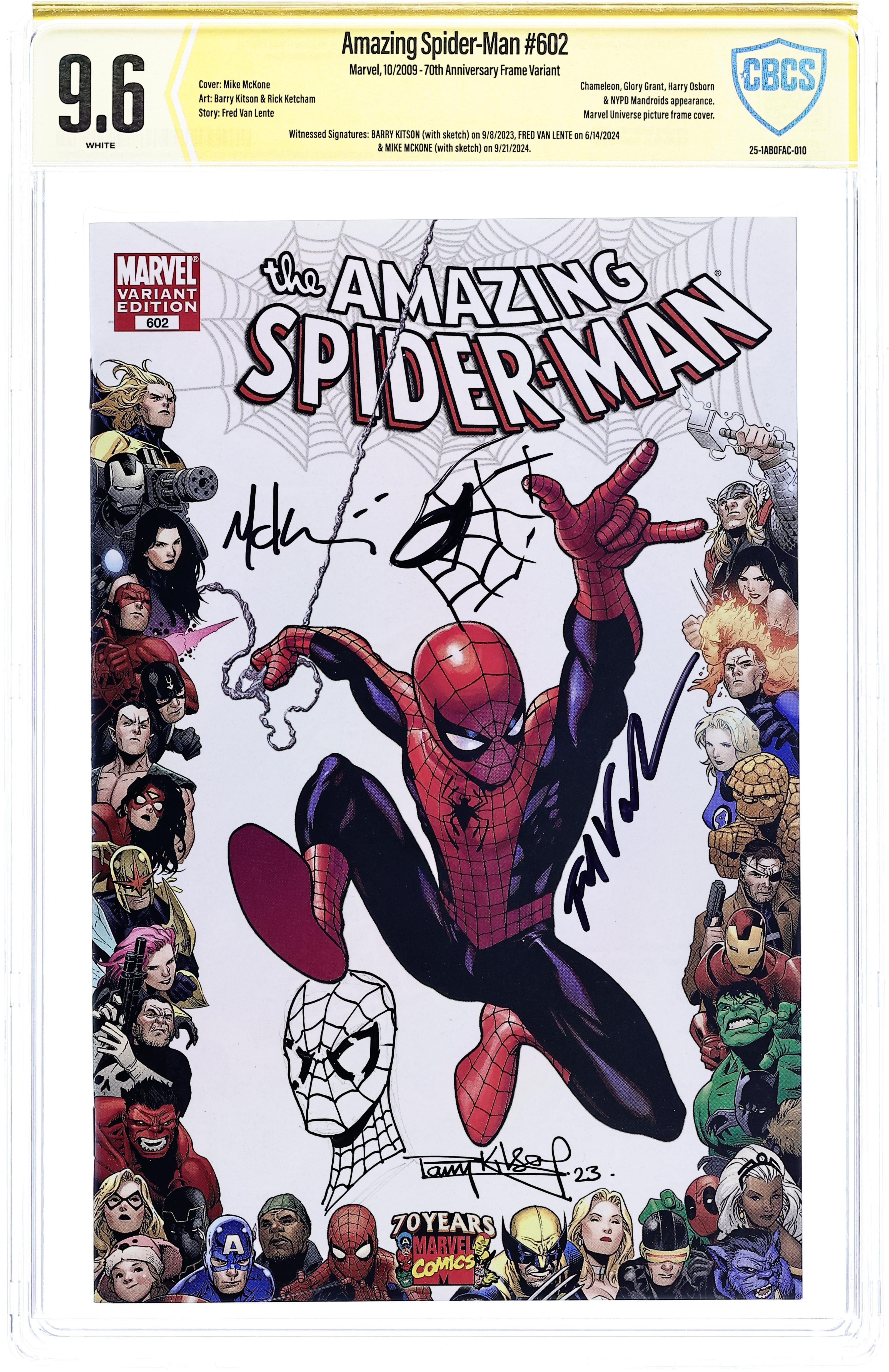 - Witnessed Signatures: Barry Kitson (with sketch) on 9/8/2023, Fred Van Lente on 6/14/2024, & Mike McKone (with sketch) on 9/21/2024. 70th Anniversary Frame Variant.