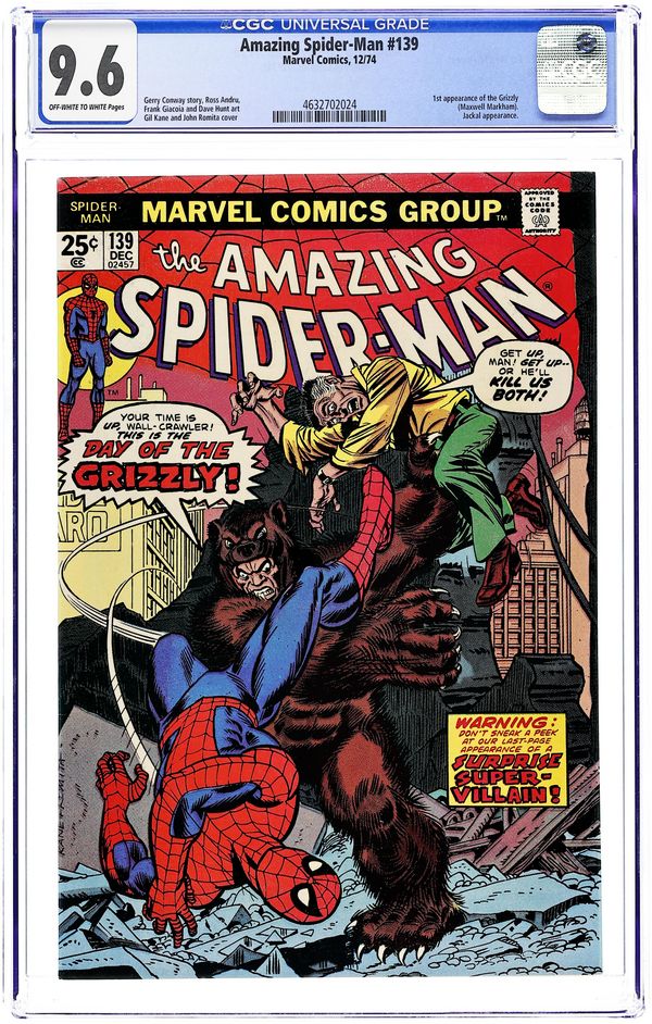 "Day of the Grizzly!" Part 1 of 2. Script by Gerry Conway. Pencils by Ross Andru. Inks by Frank Giacoia and Dave Hunt (backgrounds). Cover by Gil Kane (pencils) and John Romita Sr. (inks). Peter Parker finds a new place to live at 410 Chelsea Street! And when he stops by the Daily Bugle to tell his friends...the Grizzly attacks! Whoa, were did this 9-foot super-villain come from? There's no time for questions or answers as the web-slinger leaps into action! But the Grizzly is loaded for bear and then some! All the amazing one can do is save J. Jonah Jameson while the Grizzly escapes! However courtesy of the Jackal, the rematch is coming next issue! First appearance of the Grizzly. Cameo appearances by Betty Brant, Liz Allan, and Joe Robertson. (Notes: The letters page includes Marvel Value Stamp series A #42 Man-Wolf by Gil Kane and Mike Esposito. This story was reprinted in Marvel Tales 116.) 36 pages. 25c cover price. Cover price $0.25.
