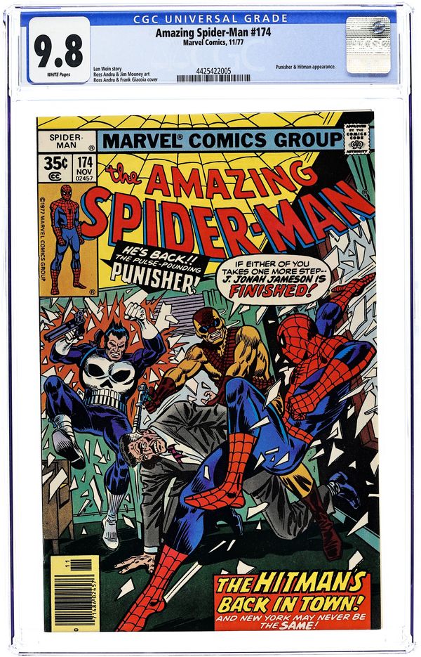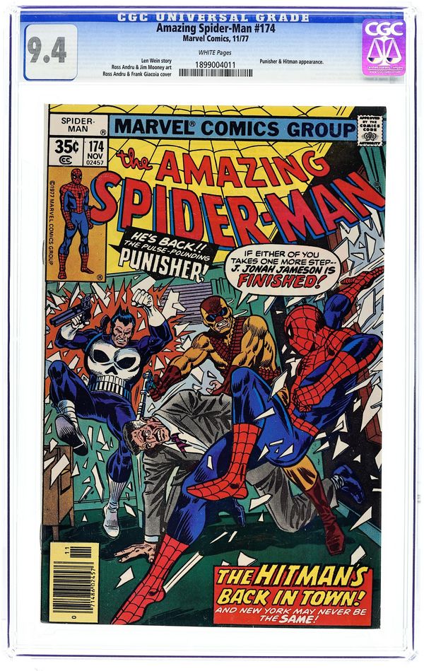 "The Hitman's Back in Town!" Part 1 of 2. Guest-starring the Punisher. Script by Len Wein. Art by Ross Andru (breakdowns), Jim Mooney (finishes), and Tony DeZuniga (finishes). Cover by Ross Andru and Frank Giacoia. The Hitman is back! And he's got a brand new target: J. Jonah Jameson! But there's another gun-toting vigilante back in town too: the Punisher! And he's tracking the Hitman! Mix in the wondrous wall-crawler...and as shown on the dynamic cover, all concerned parties come together in JJJ's corner office! Pandemonium erupts when the bullets start flying! Stay down Jonah! Let Spidey and the Punisher take the hit (man)! Cameo appearances by Harry Osborn, Flash Thompson, Dr. Marla Madison, and Dr. Bart Hamilton. First 35¢ issue. (Notes: The Hitman previously appeared in Spectacular Spider-Man 5. This story was reprinted in Marvel Tales 216.) 36 pages Cover price $0.35.
