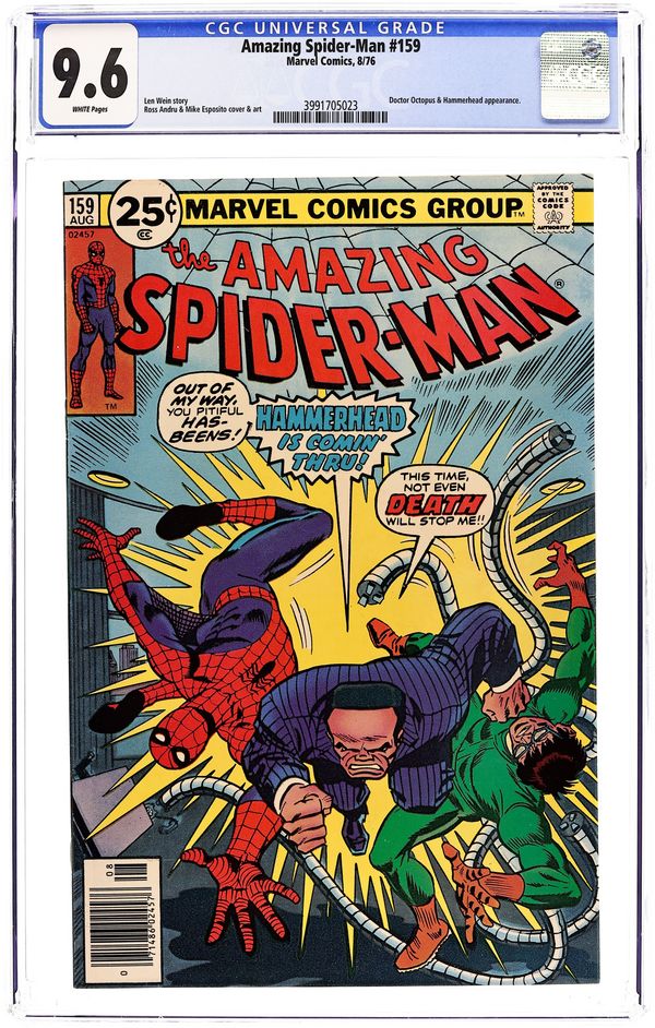 Ends Dec 8 7:18 PM CST Bid History 5 bids Current Bid $9 Your Secret Max Bid If you'd like to bid, please log in or register. "Hammerhead is Out!" Part 2 of 3. Script by Len Wein. Pencils by Ross Andru. Inks by Mike Esposito. Cover by Ross Andru and Frank Giacoia. After surviving his free fall from the helicopter, the wondrous wall-crawler continues his pursuit of Dr. Octopus and Aunt May! The six-armed super-villain takes refuge at Brookhaven National Laboratory to draw Hammerhead's ghost into a deadly trap! But the sudden arrival of the web-slinger throws off Doc Ock's plan! Instead of destroying the ghost, Octopus' equipment returns Hammerhead to flesh and blood! And that sets the stage for the next issue's three-sided tussle: Doctor Octopus vs. Hammerhead vs. your friendly neighborhood Spider-Man! Cameo appearances by Mary Jane Watson, Glory Grant, Joe Robertson, and J. Jonah Jameson. (Notes: This issue contains a full-page ad for Hostess Twinkies featuring Captain America vs. the Red Skull. This story was reprinted in Marvel Tales 135. A 30-cent cover price variant exists for this issue.) 36 pages. Cover price $0.25.