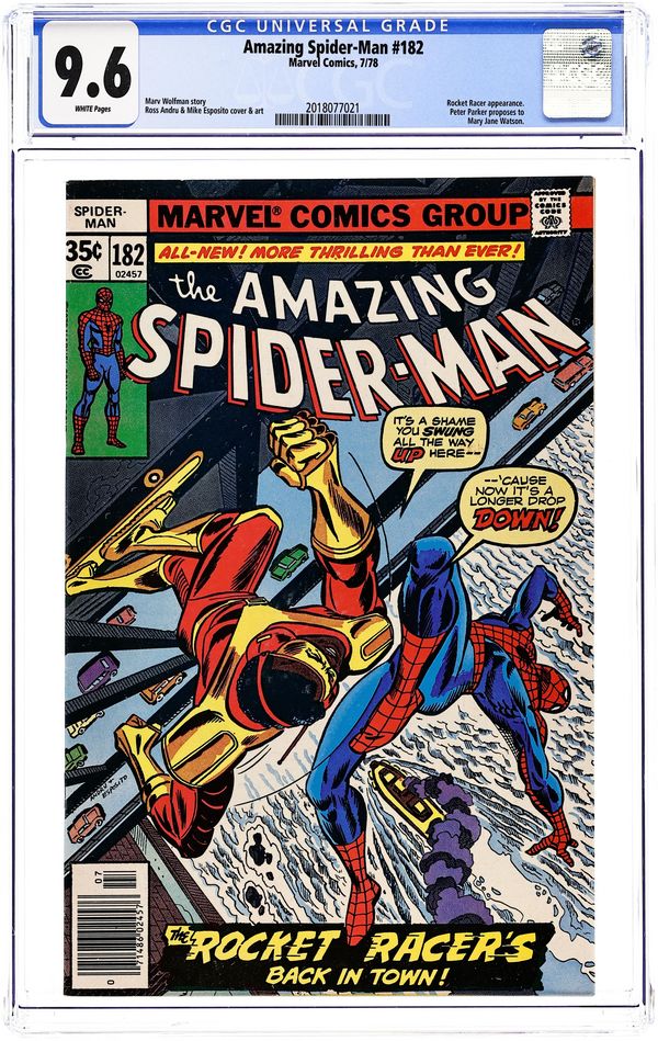 "The Rocket Racer's Back in Town!" Part 1 of 2. Script by Marv Wolfman. Art by Ross Andru (breakdowns) and Mike Esposito (finishes). Cover by Ross Andru and Mike Esposito. The skateboarding phenomenon of the 1970's rolls on in the pages of the Amazing Spider-Man! The Rocket Racer is back! And dashing and darting past the web-slinger all over again! But at this moment Aunt May's nephew has something else on his mind besides catching super-villains! Namely, a surprise marriage proposal for Mary Jane! In stunning fashion Peter pops the question to the enchanting Ms. Watson! And all of Marveldom will wait for her answer next issue! Second appearance of the Rocket Racer. Cameo appearances by J. Jonah Jameson and Betty Brant Leeds. (Notes: The Rocket Racer formerly appeared in Amazing Spider-Man 172. This issue begins Marv Wolfman's 2-year run as the writer of the Amazing Spider-Man title.) 36 pages. Cover price $0.35.