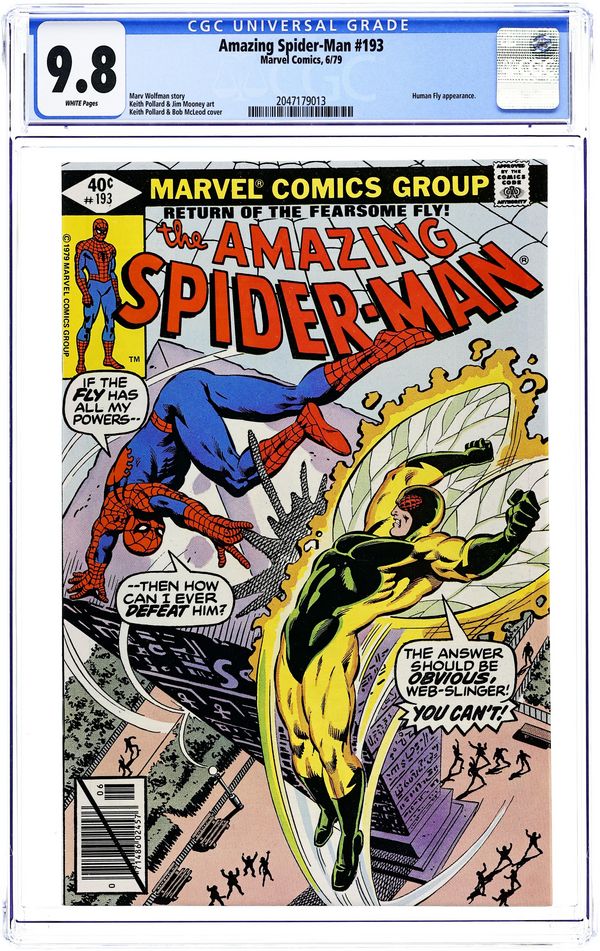 Direct Edition. "The Wings of the Fearsome Fly!" Script by Marv Wolfman. Art by Keith Pollard (layouts) and Jim Mooney (finishes). Cover by Al Milgrom and Bob McLeod. Peter Parker's life is a train wreck after surviving his recent 24-hour ordeal. In very short order Jonah fires him, Mary Jane dumps him, and Ned Leeds punches him! Oh my, where is a super-villain when Spidey really needs one? Fortunately, there is one flying around town for the web-slinger to vent his frustration upon: the Fearsome Fly! But when the wall-crawler and the Fly collide at Cleopatra's Needle, Spider-Man's Day just gets worse. Meanwhile, the original burglar from Amazing Fantasy 15 is back...and still haunting (Aunt) May Parker. Cameo appearances by Mary Jane Watson, Betty Brant, and Mysterio (in civilian clothes). (Notes: The Fly appears next in Spider-Woman 30. The plot briefly crosses over with Fantastic Four 207. Other than a cameo appearance in issue 201, Mary Jane Watson exits the Amazing Spider-Man series for the next 4 years.) 36 pages. Cover price $0.40.
