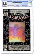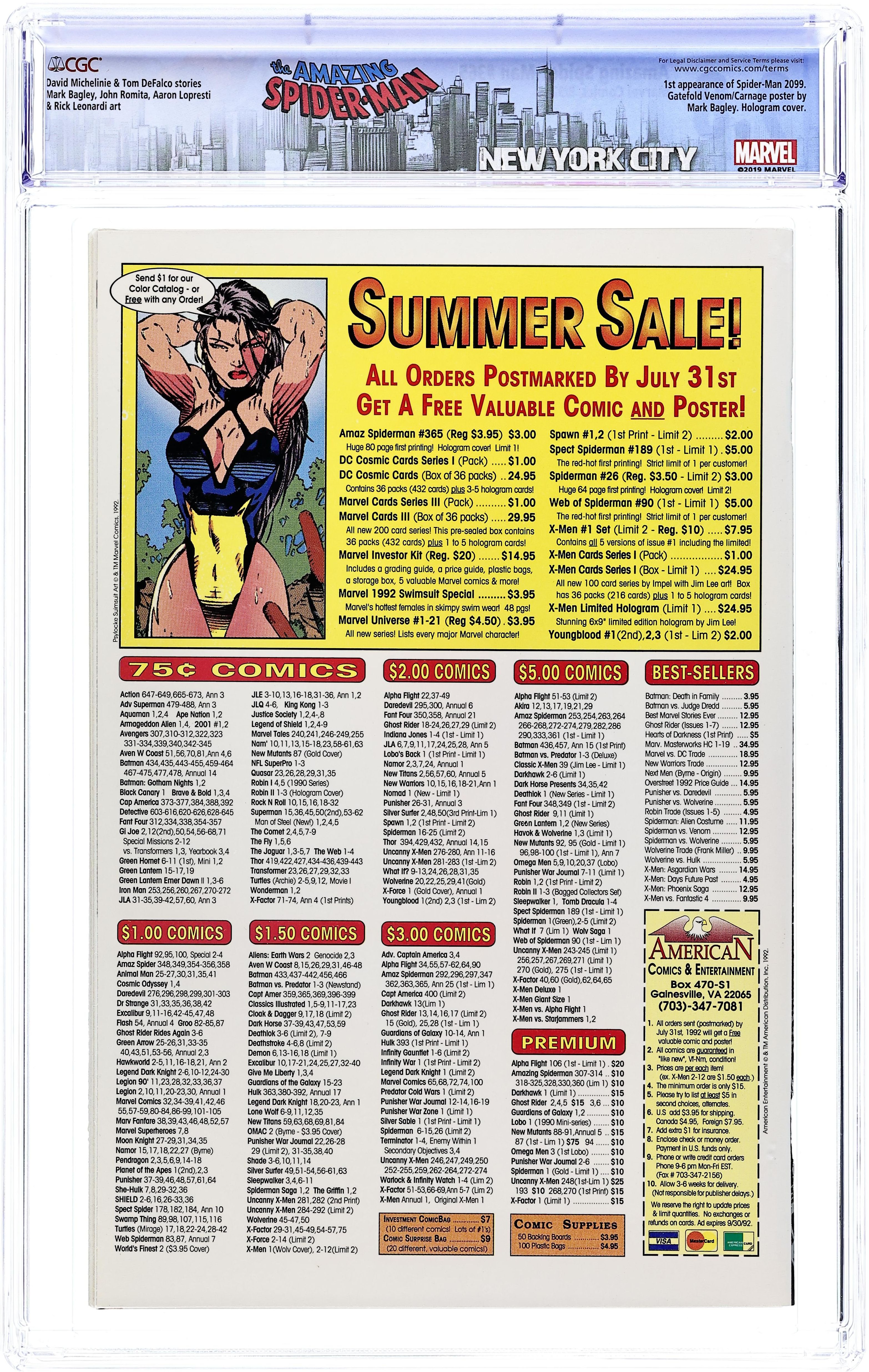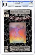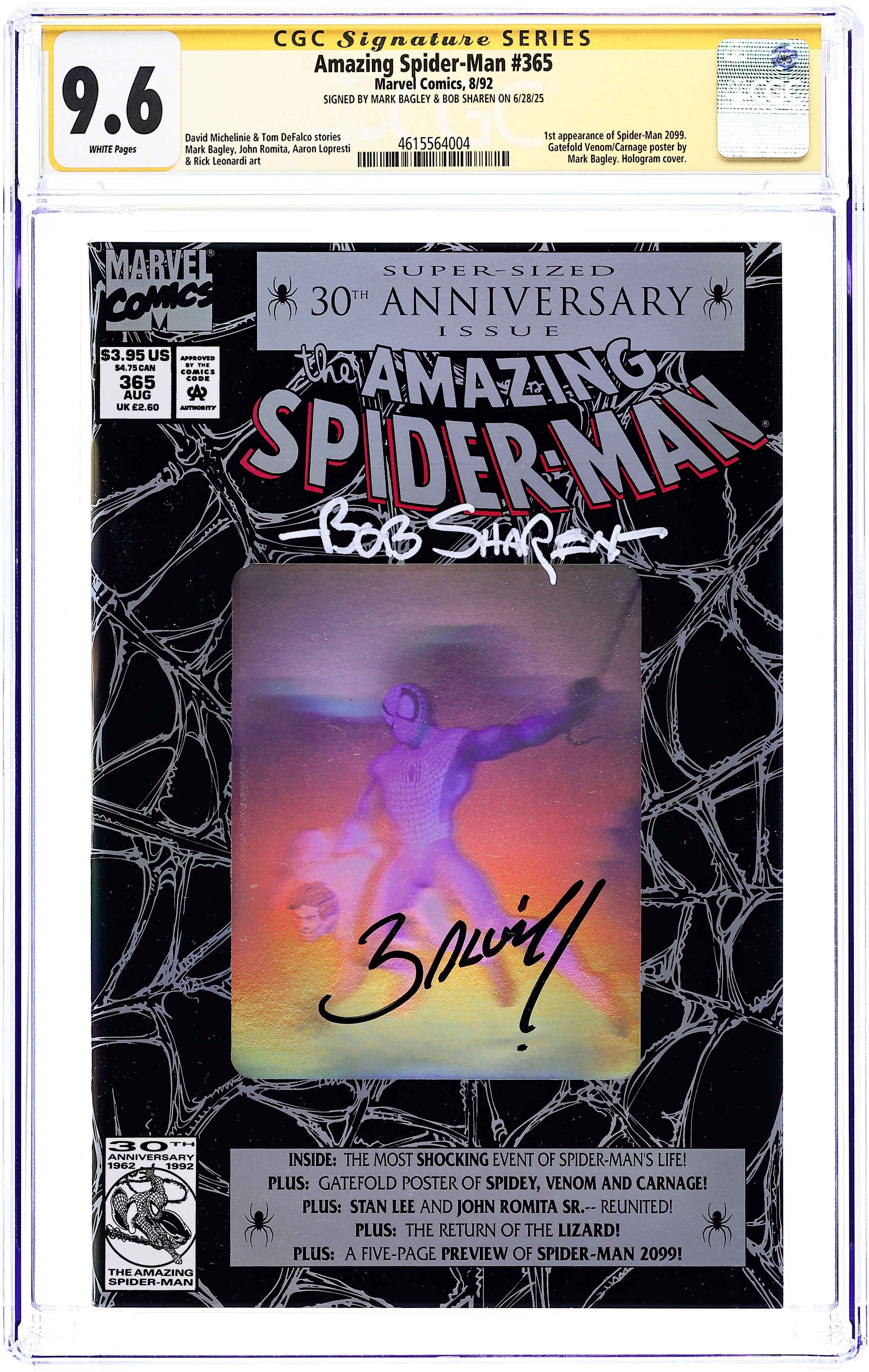 Direct Edition. 80-page giant 30th Anniversary issue, with the first appearance of Spider-Man 2099! The Lizard returns in "Fathers and Sins." Script by David Michelinie, pencils by Mark Bagley, inks by Randy Emberlin. J. Jonah Jameson is featured in "How I Created Spider-Man!" Script by David Michelinie, art by Aaron Lopresti. Gwen Stacy takes center stage in "I Remember Gwen." Script by Stan Lee, plot by Tom DeFalco, art by John Romita Sr. (Cameos by the Green Goblin and Doctor Octopus.) The Prowler is also here in "A Friend in Need." Script by Tom DeFalco, pencils by Tod Smith, inks by Andrew Pepoy. There are also two text pieces, "The Saga of Spidey's Parents" by Stan Lee, and "Spider-Man: The First Thirty Years" by Peter Sanderson. Spider-Man 2099 gets a sneak preview, with a script by Peter David, pencils by Rick Leonardi, and inks by Al Williamson. This issue was originally released with a fold-out poster of Spidey versus Venom and Carnage (poster may be missing in lower grades). 84 pgs. Cover price $3.95.