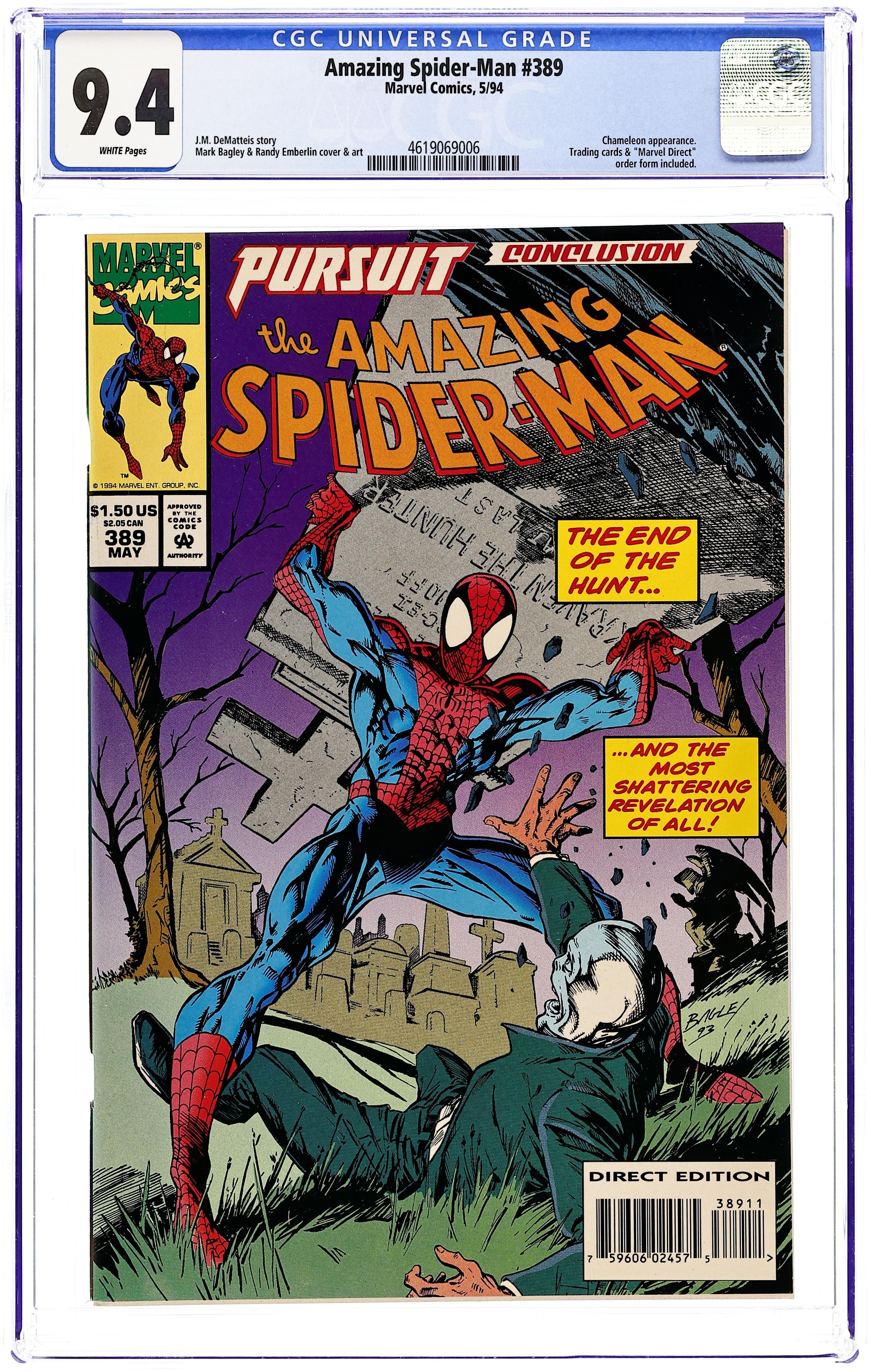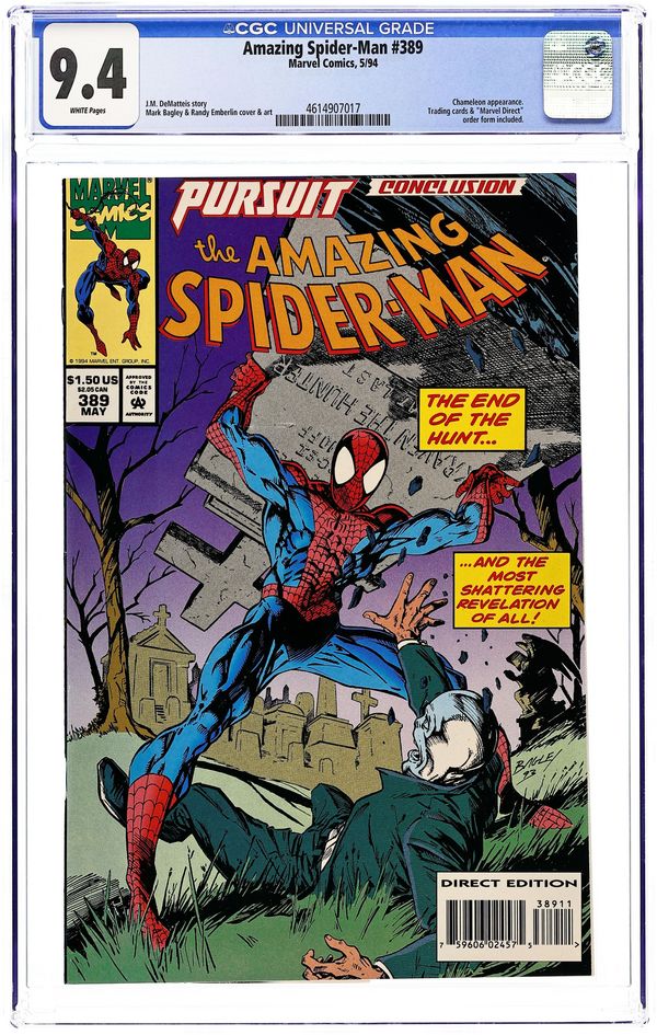 "The Faceless Man" Pursuit Part 4 of 4. Script by J.M. DeMatteis. Pencils by Mark Bagley. Inks by Randy Emberlin. Cover by Mark Bagley. Story continues from Web of Spider-Man 112. The web-slinger's frenzied pursuit of the Chameleon is almost over! As the enraged wall-crawler corners his faceless foe inside Kraven's former estate. The crafty Chameleon tries his best to stop the spectacular one, but he is no match for the emotionally-charged Spider-Man! After his resounding victory, the web-slinger searches through the Chameleon's computer to discover the true mastermind behind his parents' resurrection! The shocking truth has an all too familiar green and purple tinge! Cameo appearance by Harry Osborn. Flashback cameos by Kraven the Hunter and the Richard Parker LMD. First $1.50 cover price. (Notes: This issue includes a full-page ad for the Hulk vs. Venom Special Edition (1994). This issue begins J.M. DeMatteis' one-and-a-half year run as the writer of the Amazing Spider-Man title. This issue also includes 3 Marvel Masterprints Spider-Man cards. The issue may or may not contain the cards now.) 44 pgs. Cover price $1.50.