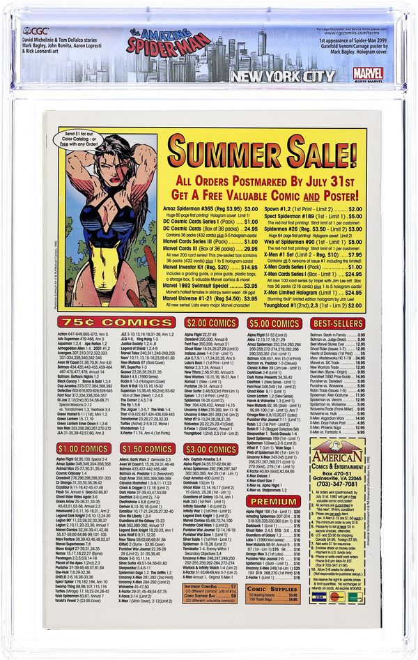 Direct Edition. 30th Anniversary issue of Amazing Spiderman #1. "The Bride of Venom" Part 2 of 2. Script by David Michelinie. Pencils by Mark Bagley. Inks by Randy Emberlin. Gold foil holografix cover by Mark Bagley and Randy Emberlin. Inside an abandoned Brooklyn amusement park, the Lethal Protector holds Richard and Mary Parker captive! The disturbed Venom thinks he's just doing what's best for Peter's parents! But that's not going to work! No way, no how! So, the wall-crawler heads to the park knowing a fierce fight awaits! However, the web-slinger may have help this time from a very unlikely source... Eddie Brock's ex-wife! Wow, will there be a family reunion atop the Ferris wheel? Or perhaps a funeral beneath it? One way or another, the Amazing Spider-Man and Venom battle for the last time! Cameo appearances by Silver Sable, Battlestar, Mary Jane Watson, and J. Jonah Jameson. Second story: "True Friends!" Script by Tom DeFalco. Pencils by Patrick Olliffee. Inks by Mark McKenna. Aware of what the Human Torch did to Empire State University, Spider-Man vows to bring his friend to justice. Cameo appearance by Silver Sable. Plot crosses over with Fantastic Four 373 & 374. Third story: "The Monster Within" Script by Eric Fein. Art by Dan Panosian. JJJ tries to get his son, John Jameson, started in the field of journalism. Fourth story: "Echoes..." Script by Terry Kavanagh. Pencils by Aaron Lopresti. Inks by Don Hudson. The Chameleon visits the grave of Kraven the Hunter. (Notes: Venom appears next in the first issue of his Lethal Protector (1993) series. The letters page includes a statement of ownership: average print run 660,958. average paid circulation 544,900.) 68 pages. Cover price $3.95.