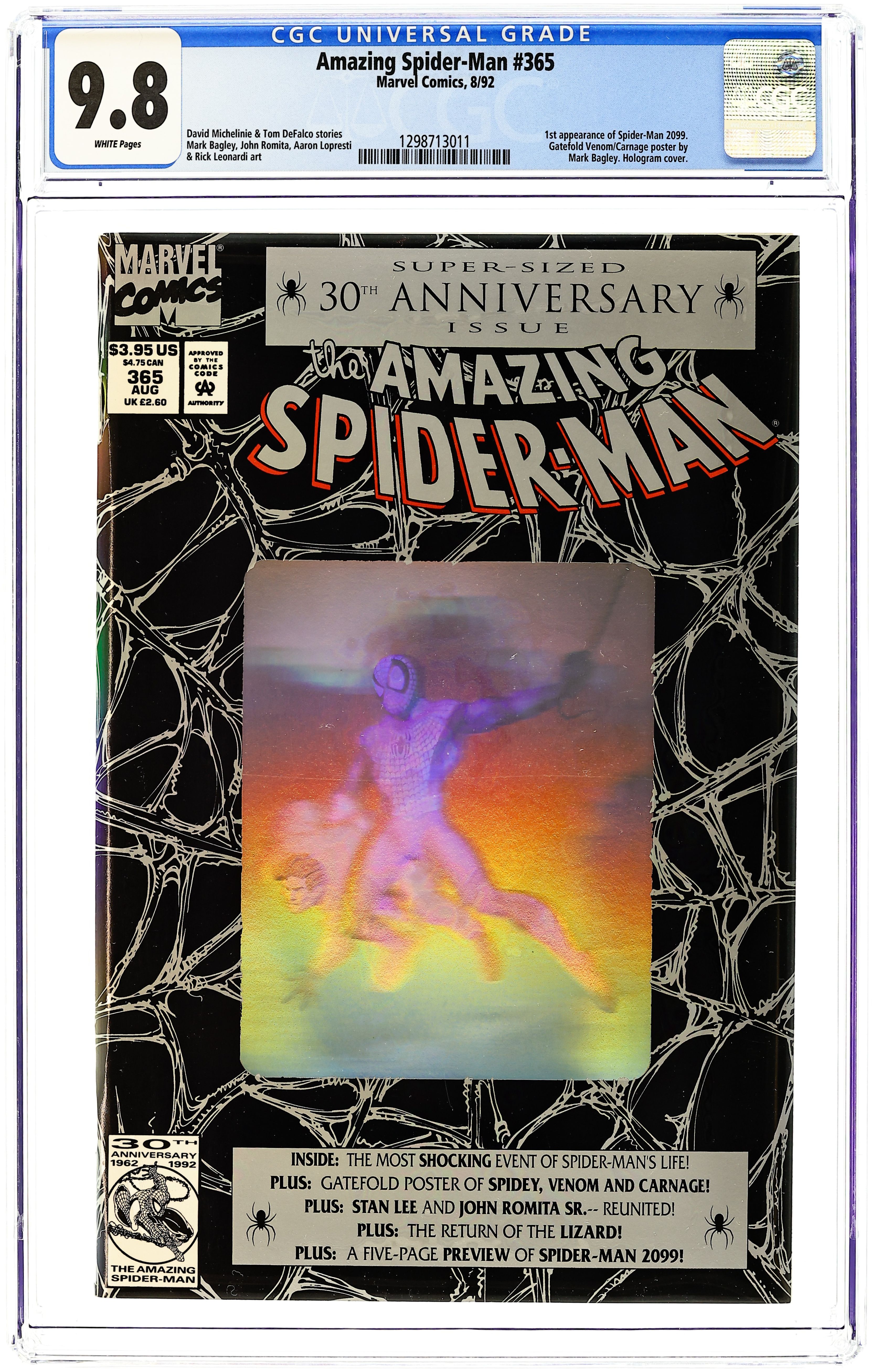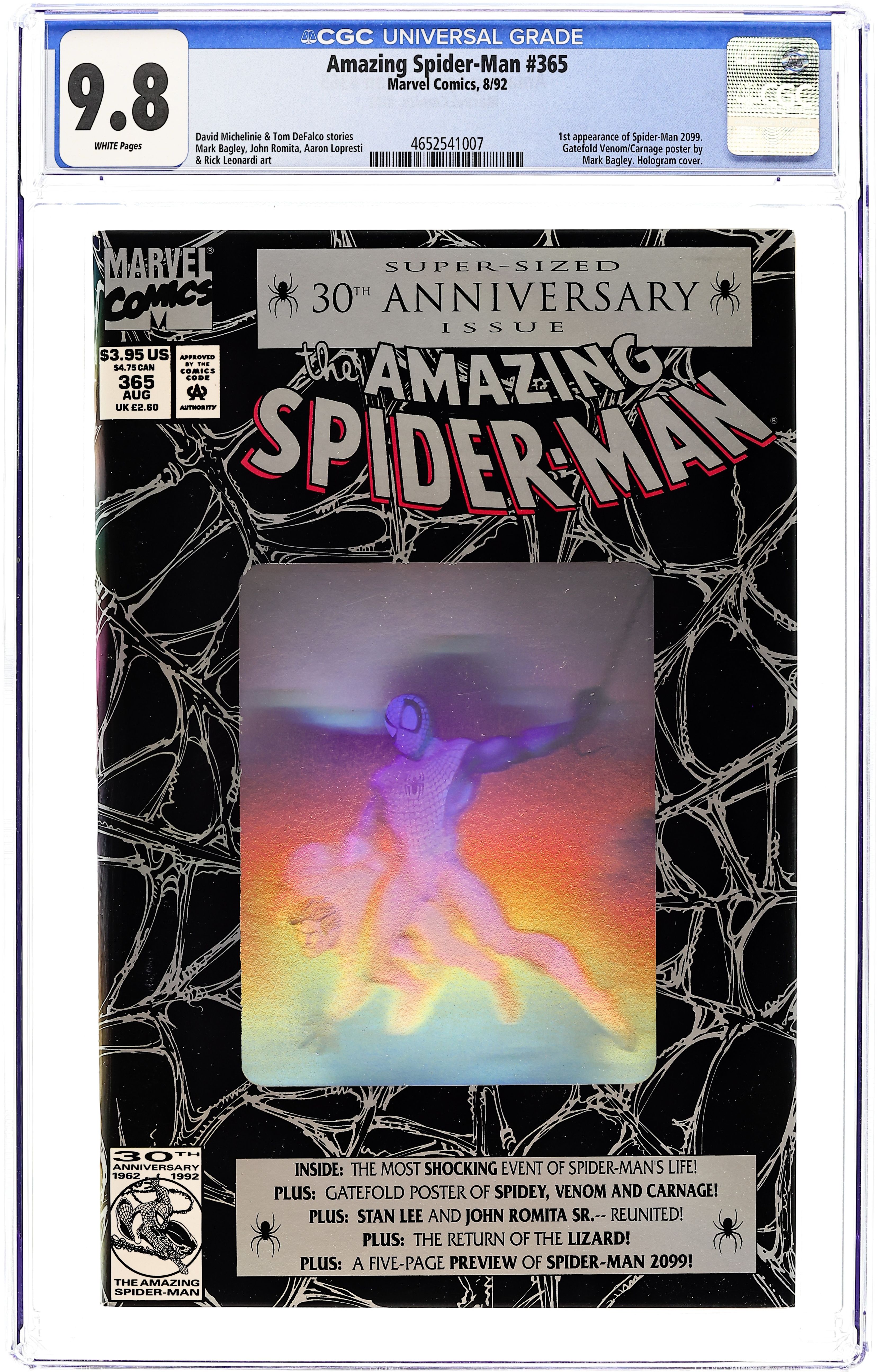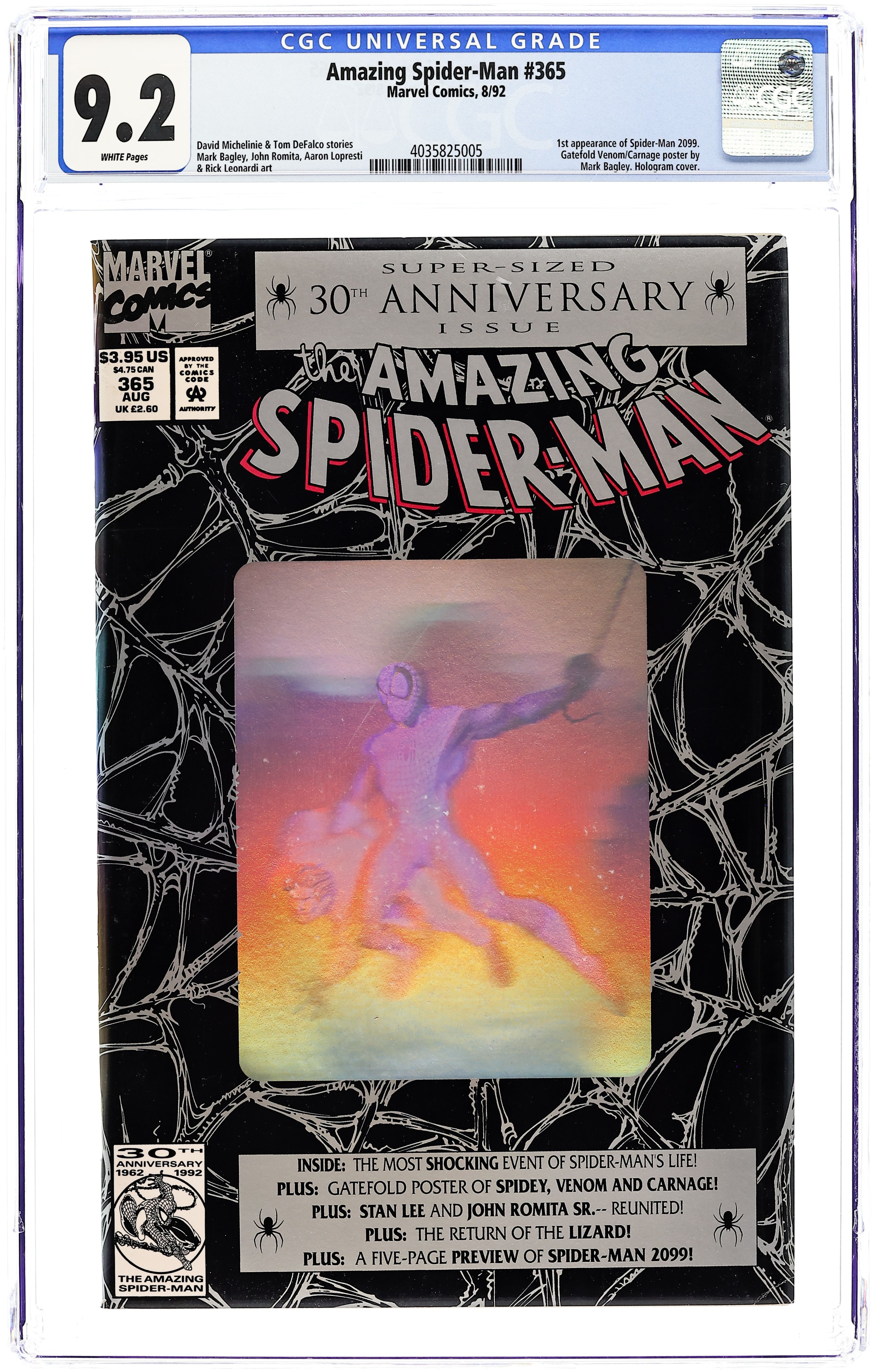 Starts Dec 15 Direct Edition. 80-page giant 30th Anniversary issue, with the first appearance of Spider-Man 2099! The Lizard returns in "Fathers and Sins." Script by David Michelinie, pencils by Mark Bagley, inks by Randy Emberlin. J. Jonah Jameson is featured in "How I Created Spider-Man!" Script by David Michelinie, art by Aaron Lopresti. Gwen Stacy takes center stage in "I Remember Gwen." Script by Stan Lee, plot by Tom DeFalco, art by John Romita Sr. (Cameos by the Green Goblin and Doctor Octopus.) The Prowler is also here in "A Friend in Need." Script by Tom DeFalco, pencils by Tod Smith, inks by Andrew Pepoy. There are also two text pieces, "The Saga of Spidey's Parents" by Stan Lee, and "Spider-Man: The First Thirty Years" by Peter Sanderson. Spider-Man 2099 gets a sneak preview, with a script by Peter David, pencils by Rick Leonardi, and inks by Al Williamson. This issue was originally released with a fold-out poster of Spidey versus Venom and Carnage (poster may be missing in lower grades). 84 pgs. Cover price $3.95.