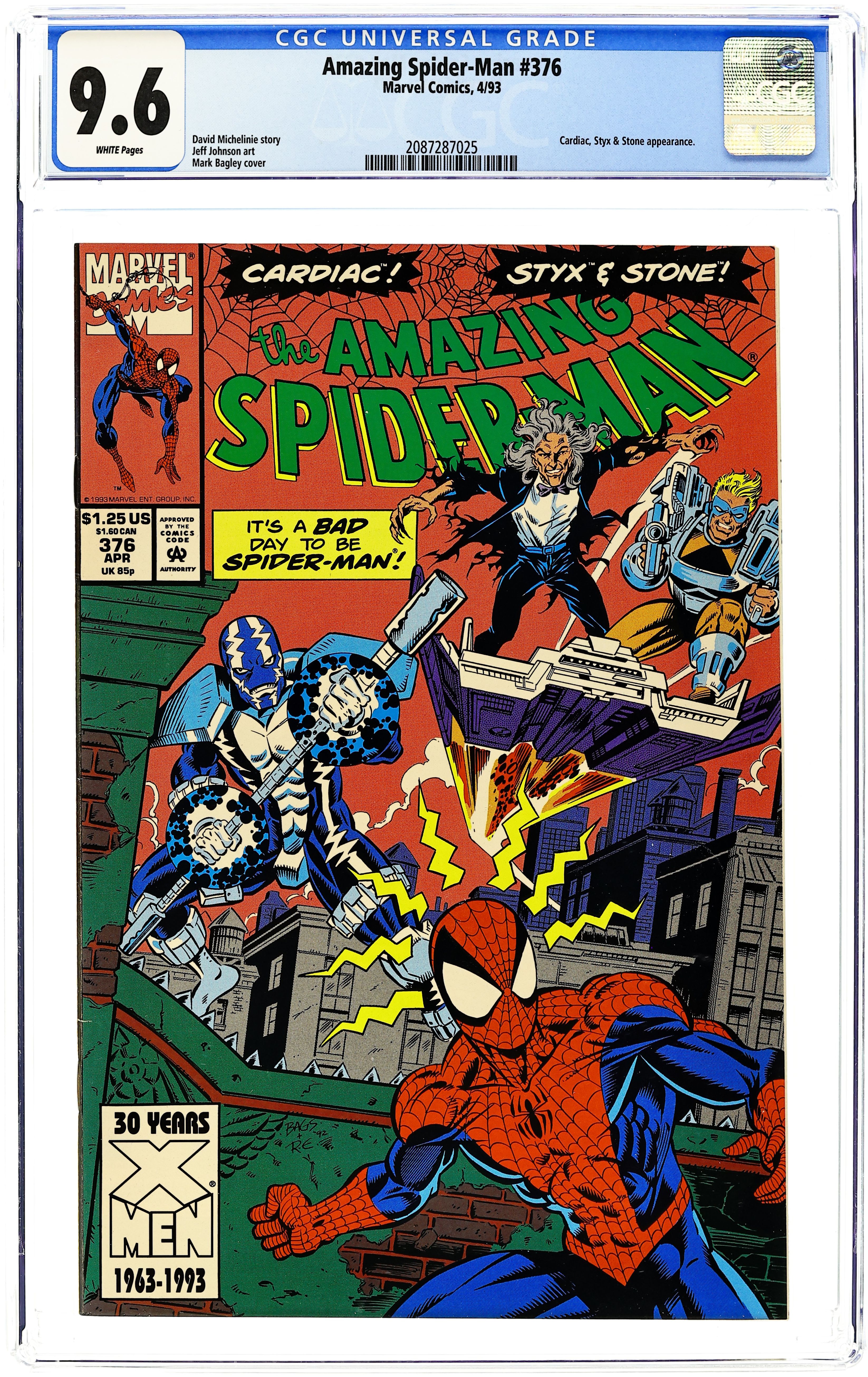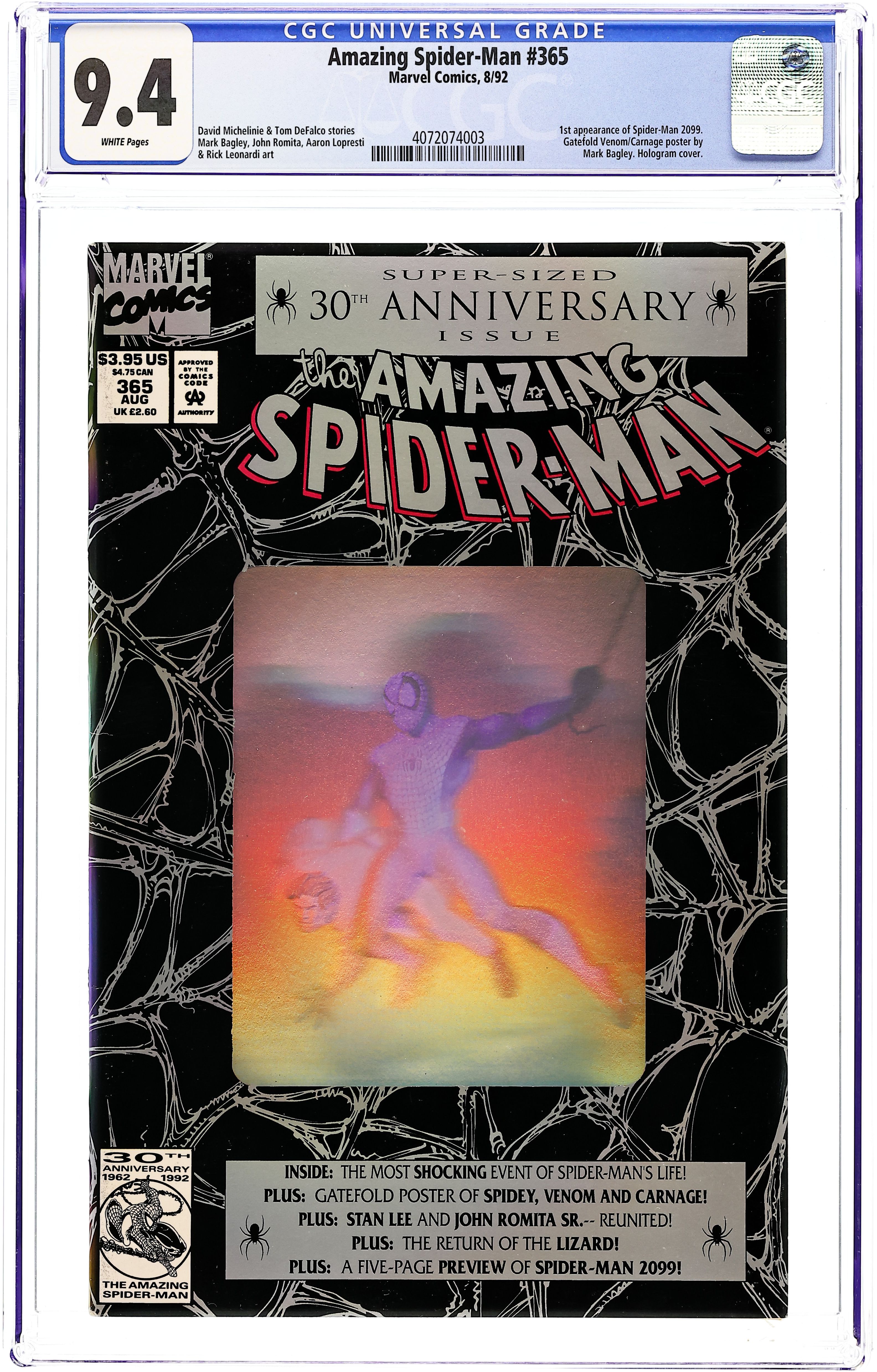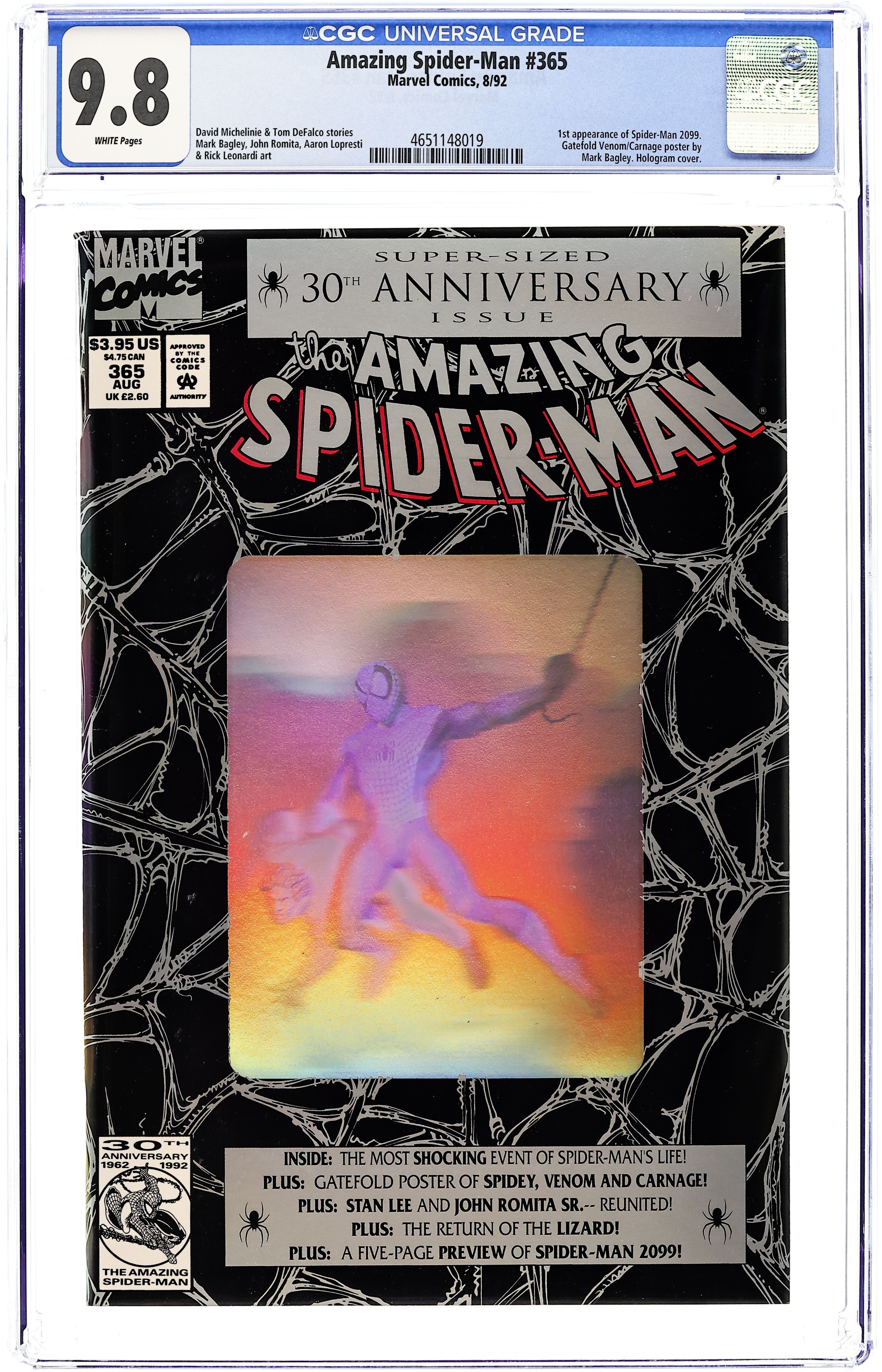 Starts Dec 15 Direct Edition. 80-page giant 30th Anniversary issue, with the first appearance of Spider-Man 2099! The Lizard returns in "Fathers and Sins." Script by David Michelinie, pencils by Mark Bagley, inks by Randy Emberlin. J. Jonah Jameson is featured in "How I Created Spider-Man!" Script by David Michelinie, art by Aaron Lopresti. Gwen Stacy takes center stage in "I Remember Gwen." Script by Stan Lee, plot by Tom DeFalco, art by John Romita Sr. (Cameos by the Green Goblin and Doctor Octopus.) The Prowler is also here in "A Friend in Need." Script by Tom DeFalco, pencils by Tod Smith, inks by Andrew Pepoy. There are also two text pieces, "The Saga of Spidey's Parents" by Stan Lee, and "Spider-Man: The First Thirty Years" by Peter Sanderson. Spider-Man 2099 gets a sneak preview, with a script by Peter David, pencils by Rick Leonardi, and inks by Al Williamson. This issue was originally released with a fold-out poster of Spidey versus Venom and Carnage (poster may be missing in lower grades). 84 pgs. Cover price $3.95.