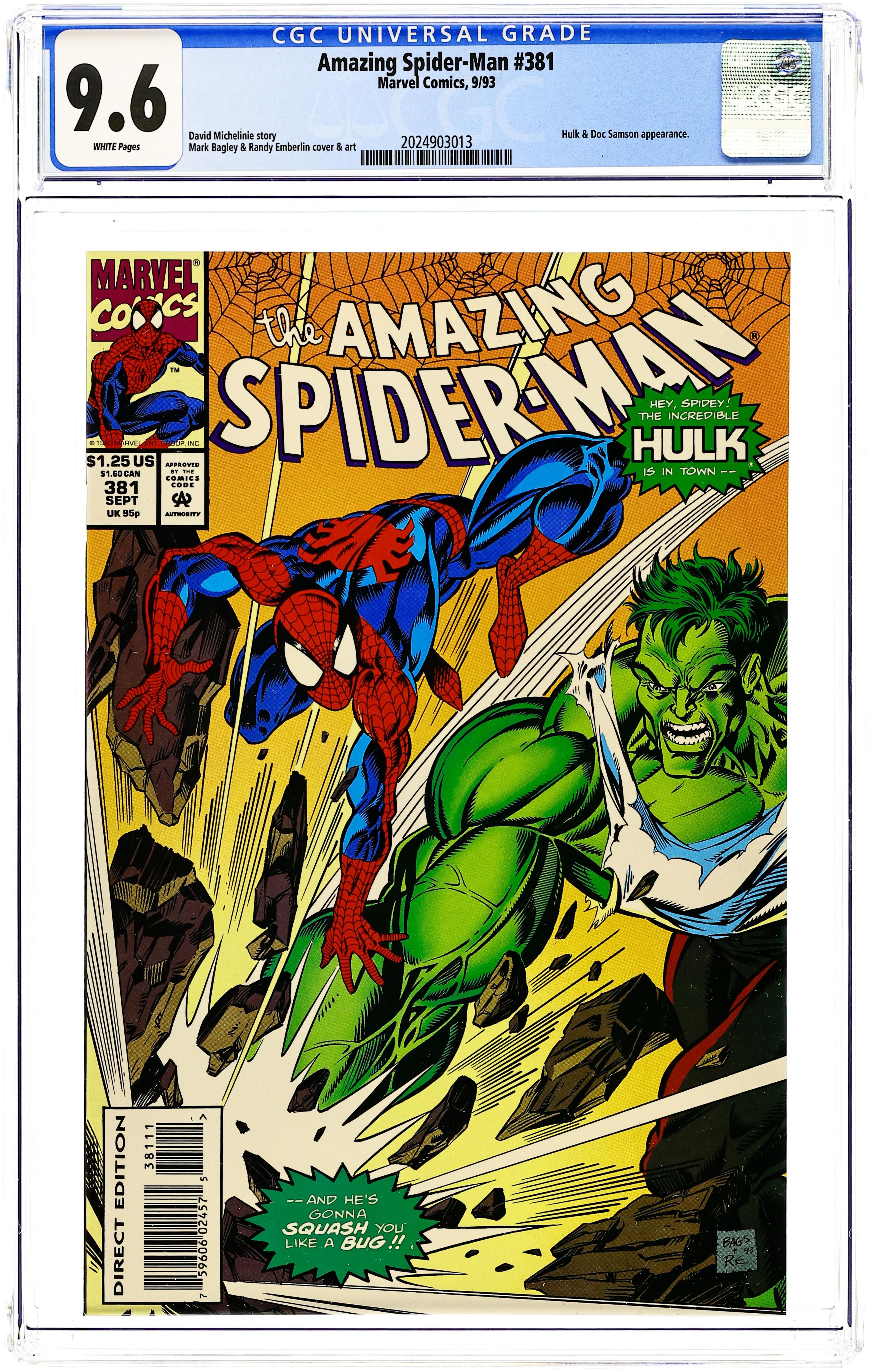 "Samson Unleashed!" Part 1 of 2. Guest-Starring Doc Samson and the Hulk. Script by David Michelinie. Pencils by Mark Bagley. Inks by Randy Emberlin and Al Milgrom. Cover by Mark Bagley and Randy Emberlin. Peter Parker and Leonard Samson attend the unveiling of an experimental psychiatric treatment based upon gamma radiation! The new "gamma virus" will help mentally ill people release their repressed hatred and anger! Hold on, is mixing hatred and anger with gamma radiation a good idea? One thing leads to another... and the new virus infects Doc Samson! And later in Washington Square Park, it infects the Hulk too! And that leaves the Amazing Spider-Man stuck between a rock and a hard place.. .and then some! Cameo appearances by Mary Jane Watson, Aunt May, Richard Parker, and Mary Parker. 36 pages. Cover price $1.25.