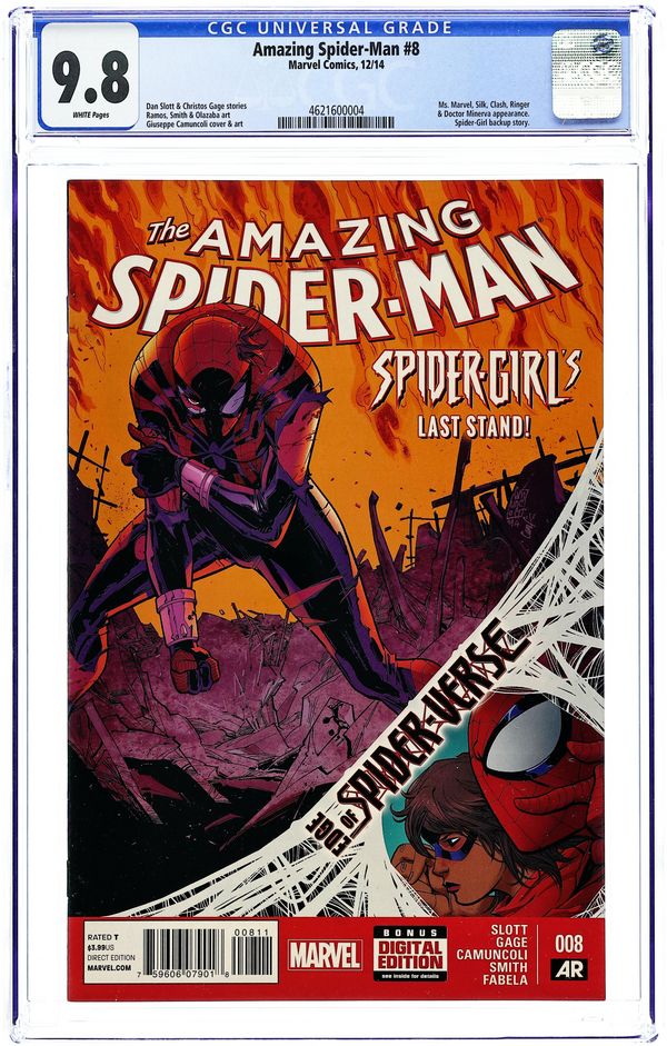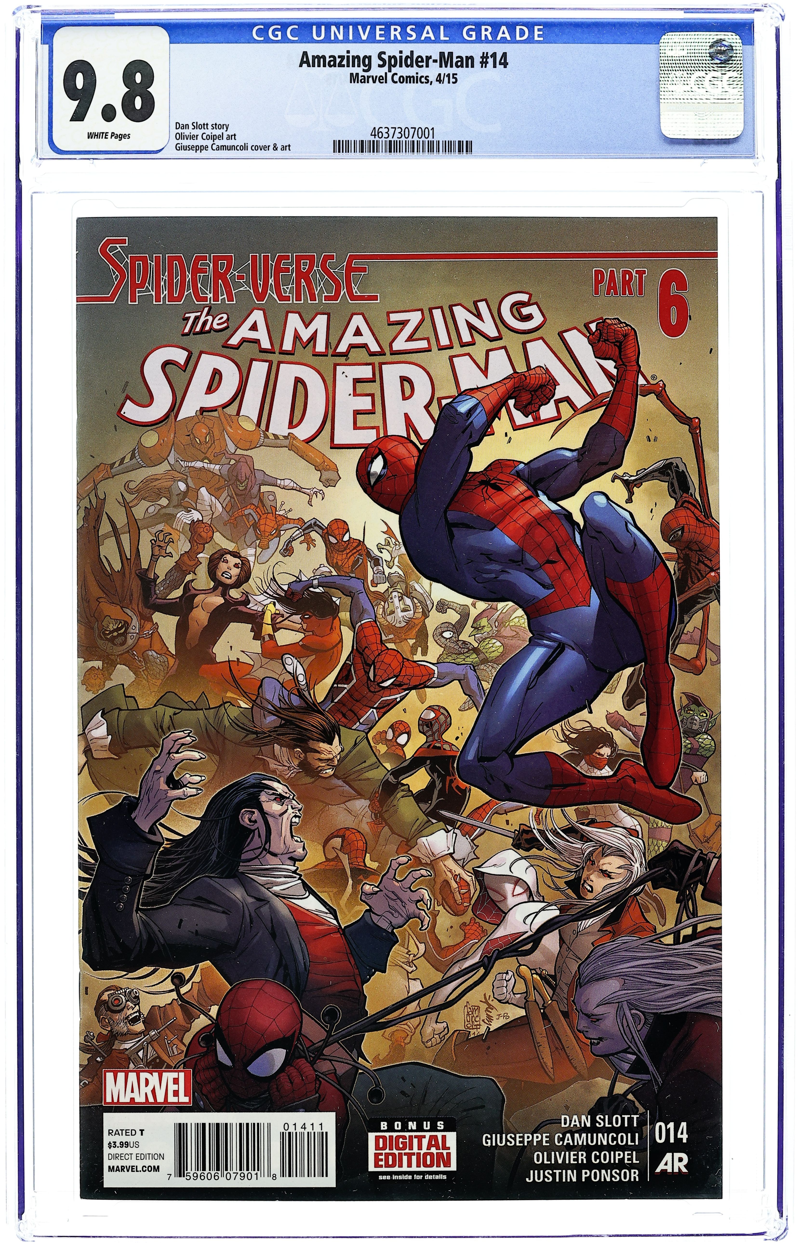 Written by Dan Slott. Art and Cover by Giuseppe Camuncoli. SPIDER-VERSE EPILOGUE See the fallout of Spider-Verse and what it means to Peter Parker and the rest of the Spiders! 28 pages, full color. Rated T Cover price $3.99.