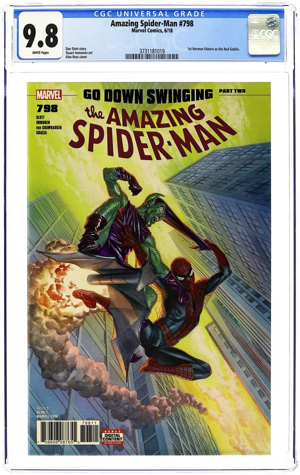 2nd Printing. Go Down Swinging: Part 1 - Written by Dan Slott. Art and Cover by Stuart Immonen. The Green Goblin is back - and scarier than ever! Dan Slott has saved his most harrowing Spider-Man story for last as he and Stuart Immonen kick off the AMAZING SPIDER-MAN story ten years in the making. Osborn got his crazy back and has a plan that'll make all his past plans look like child's play. Peter Parker and the people he loves (ALL of them) are in deep trouble. And who or what is the RED GOBLIN?! The only way Spider-Man survives is to GO DOWN SWINGING! 28 pages, full color. Rated T Cover price $3.99.