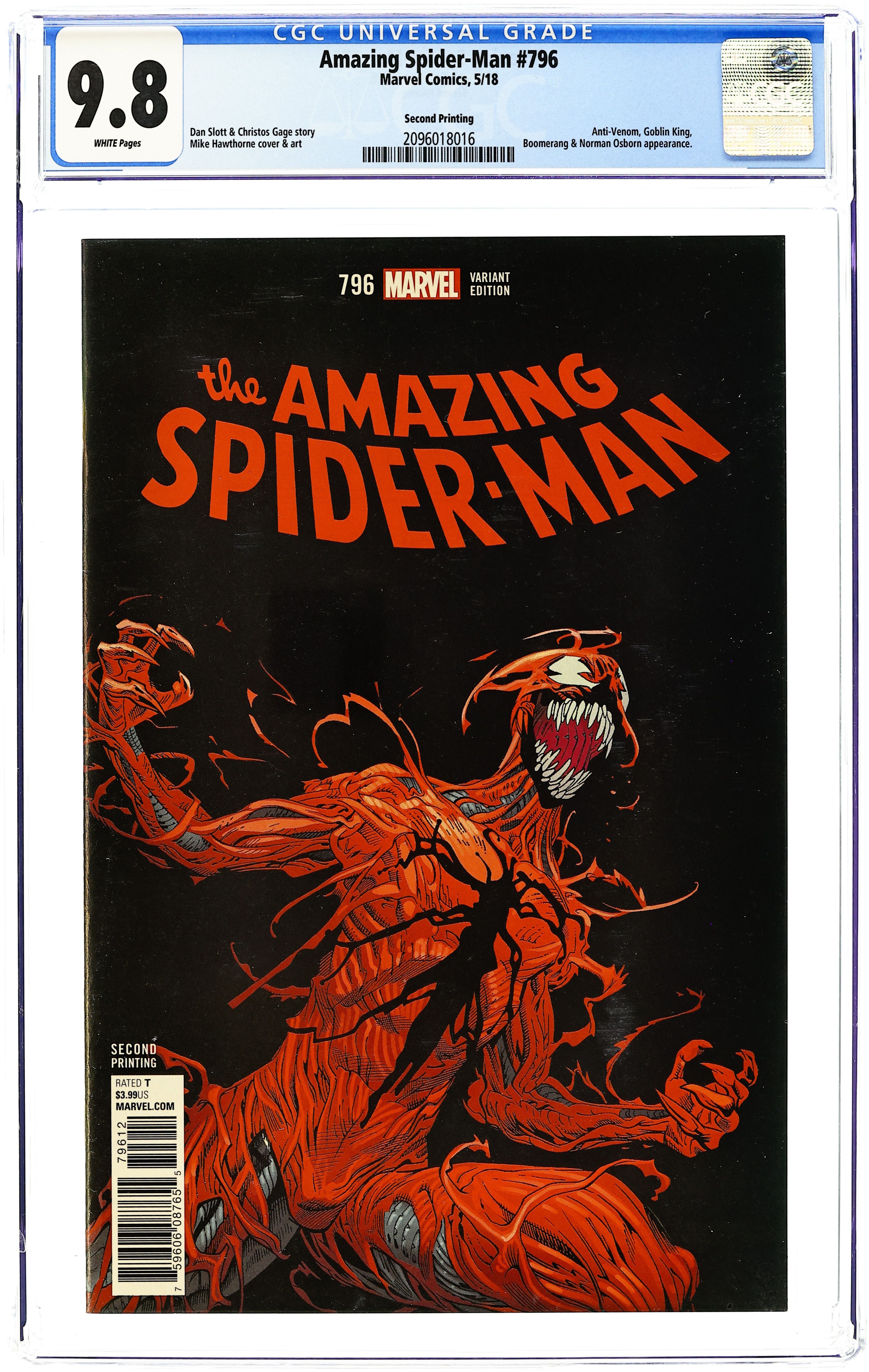 2nd Printing. Threat Level Red: Part 3 of 3 - Written by Dan Slott and Christos Gage. Art and Cover by Mike Hawthorne. You've watched for months as Norman Osborn has scoured the globe for a cure to the genetic tampering that prevents him from becoming the Green Goblin. IN THIS ISSUE…HE FINDS IT! And it spells the worst kind of trouble for your Friendly Neighborhood Spider-Man! 28 pages, full color. Rated T Cover price $3.99.