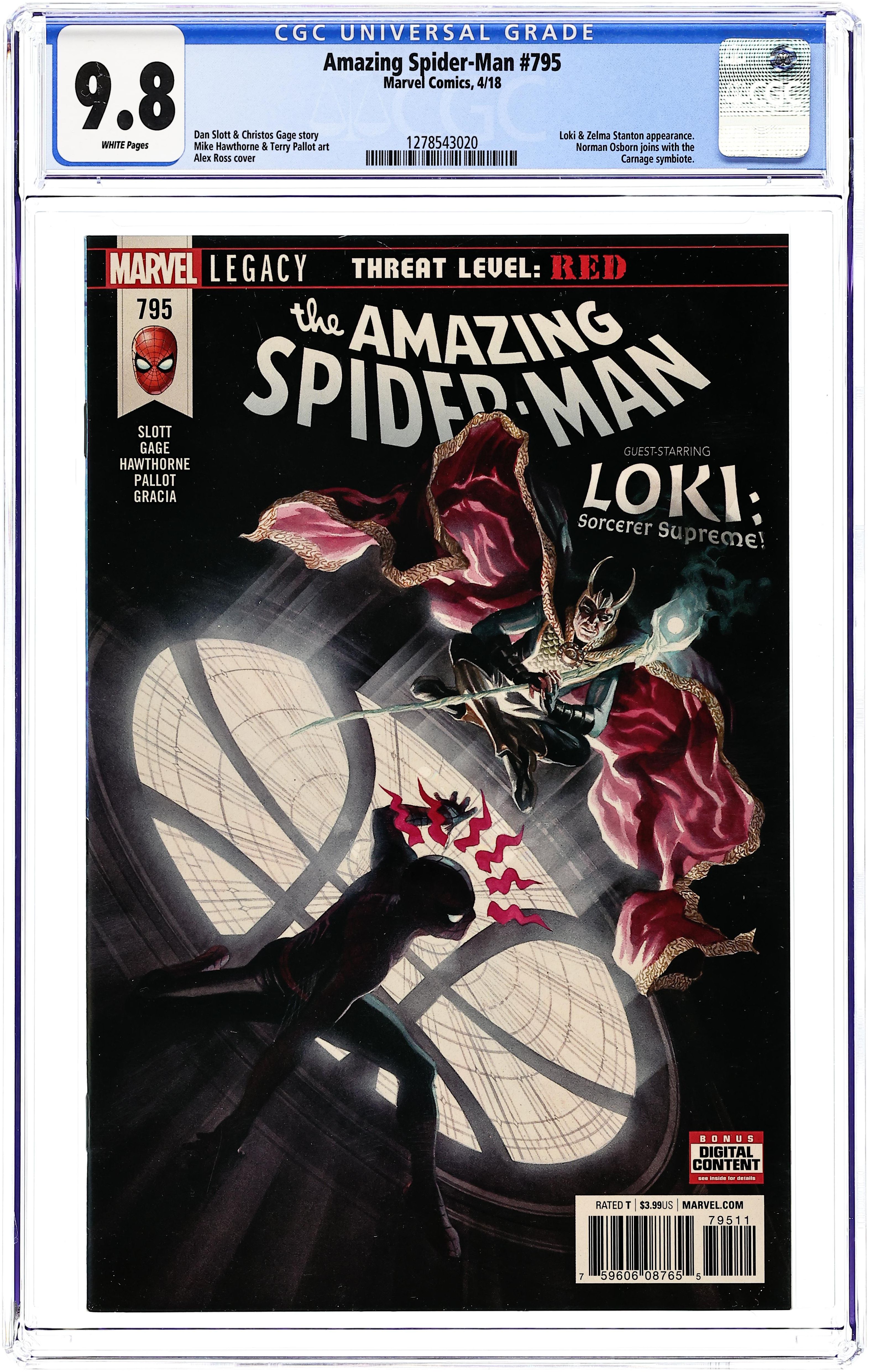 Threat Level Red: Part 2 of 3 - Written by Dan Slott and Christos Gage. Art by Mike Hawthorne. Cover by Alex Ross. IS THERE A DOCTOR IN THE HOUSE?! Spidey pays the Sanctum Sanctorum a visit looking for a consult from the Master of the Mystic arts, Doctor Stephen Strange… …but finds himself face-to-face with the Master of Mischief and new Sorcerer Supreme - LOKI LAUFEYSON! And he's even MORE charming than in the movies! Don't believe us? Read this one and find out for yourself! 28 pages, full color. Rated T Cover price $3.99.
