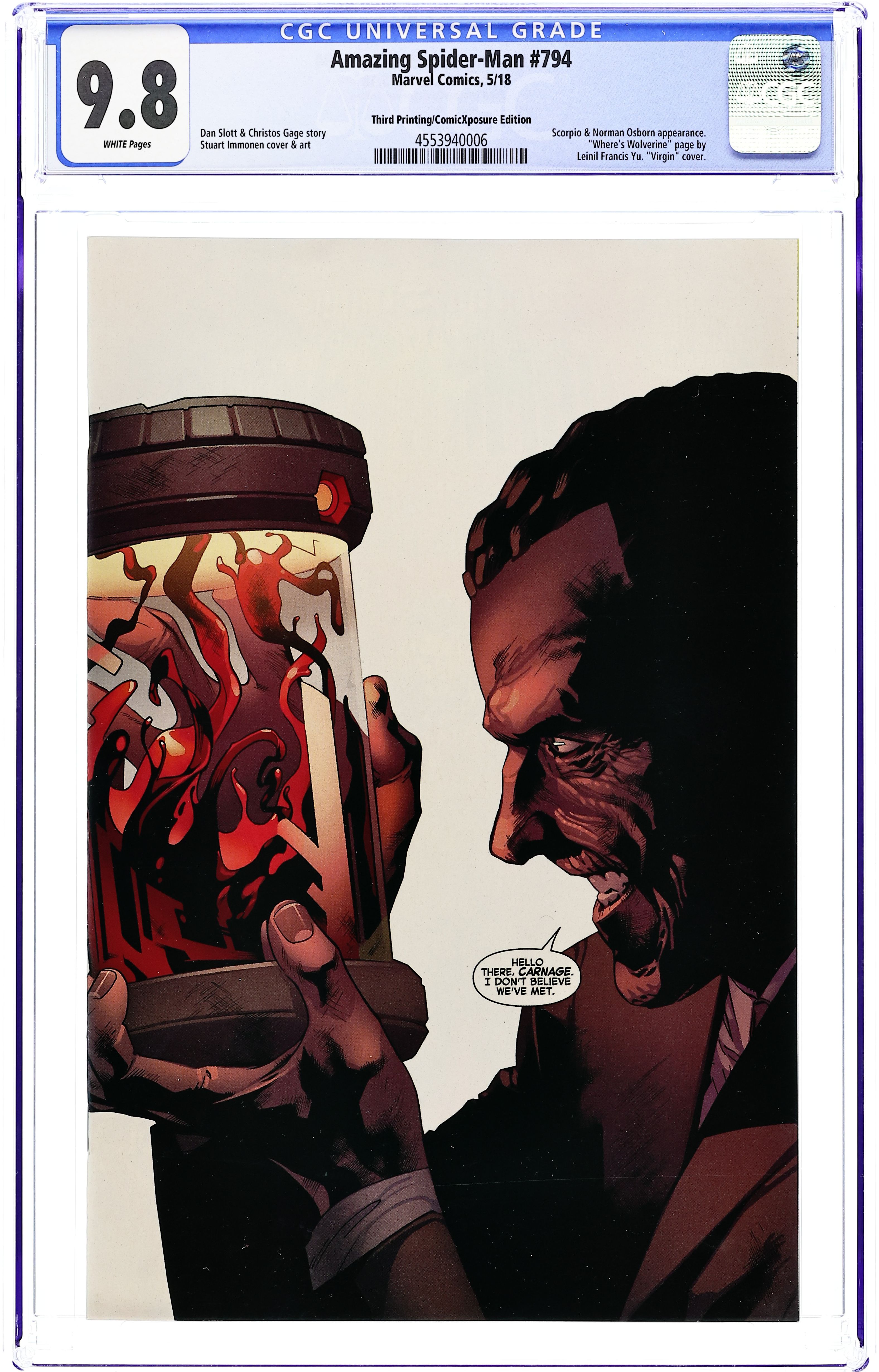 ComicXposure exclusive variant by Clayton Crain. Threat Level Red: Part 3 of 3 - Written by Dan Slott and Christos Gage. Art by Mike Hawthorne. You've watched for months as Norman Osborn has scoured the globe for a cure to the genetic tampering that prevents him from becoming the Green Goblin. IN THIS ISSUE…HE FINDS IT! And it spells the worst kind of trouble for your Friendly Neighborhood Spider-Man! 28 pages, full color. Rated T