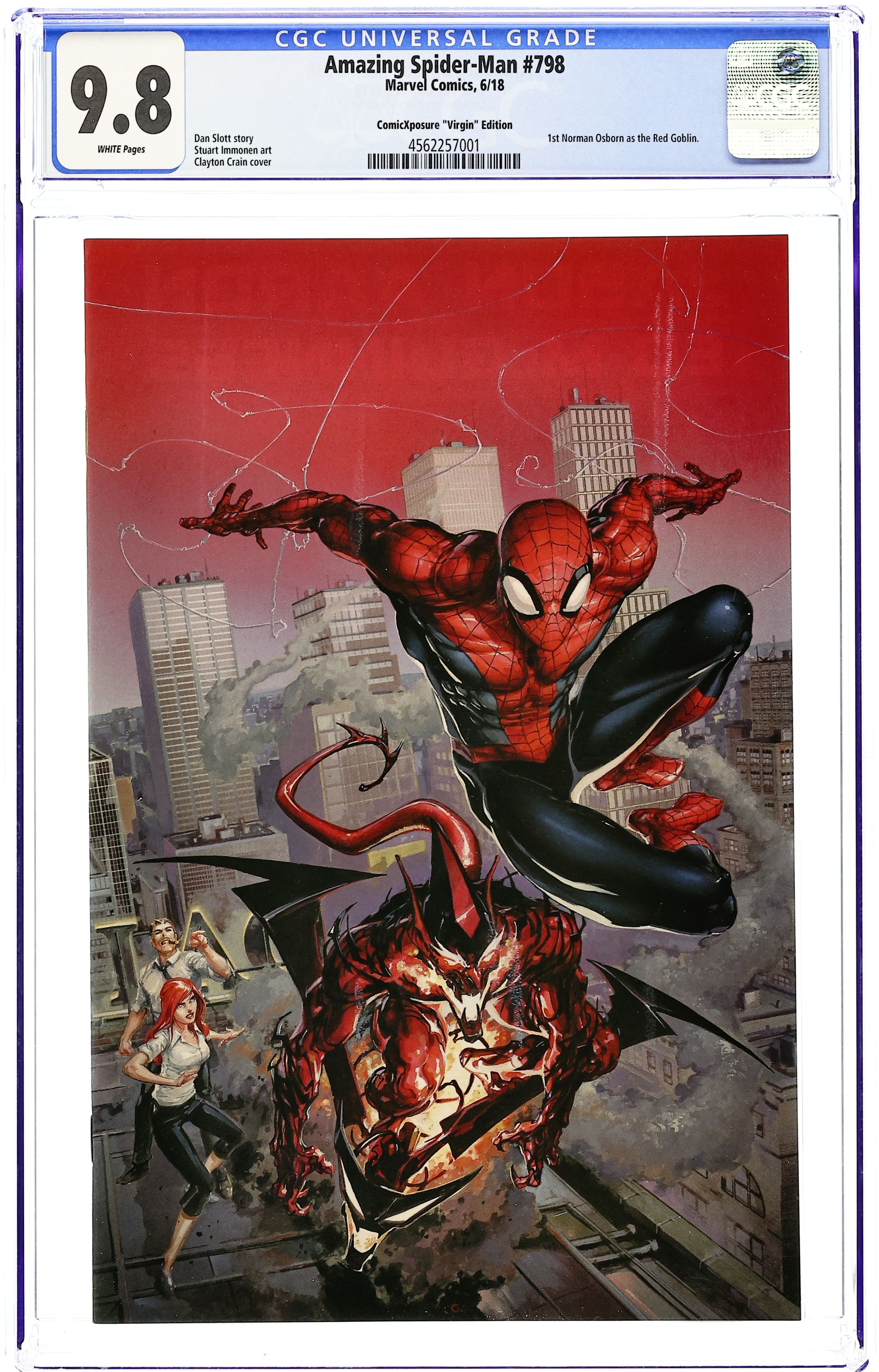 ComicXposure exclusive cover by Clayton Crain. Go Down Swinging: Part 1 of 4 - Written by Dan Slott. Art by Stuart Immonen. The Green Goblin is back - and scarier than ever! Dan Slott has saved his most harrowing Spider-Man story for last as he and Stuart Immonen kick off the AMAZING SPIDER-MAN story ten years in the making. Osborn got his crazy back and has a plan that'll make all his past plans look like child's play. Peter Parker and the people he loves (ALL of them) are in deep trouble. And who or what is the RED GOBLIN?! The only way Spider-Man survives is to GO DOWN SWINGING! 28 pages, full color. Rated T