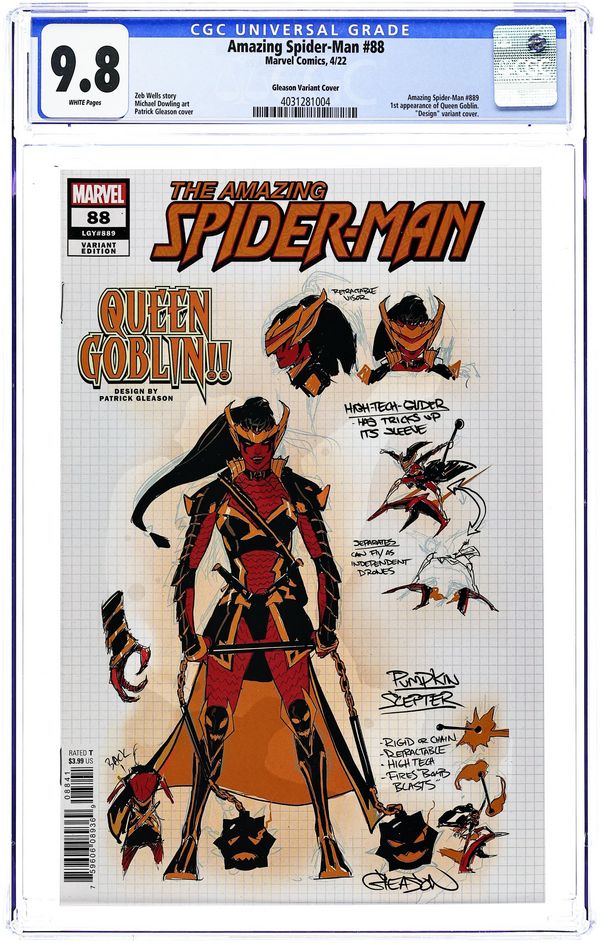 Limited 1 for 10 Retailer Incentive Variant Cover. Written by Zeb Wells. Art by Michael Dowling. Cover by Patrick Gleason. Who is QUEEN GOBLIN?! For almost sixty years, Spider-Man has been defined by Goblins, and Ben Reilly has a brand-new one all his own. 28 pages, full color. Rated T Cover price $3.99.