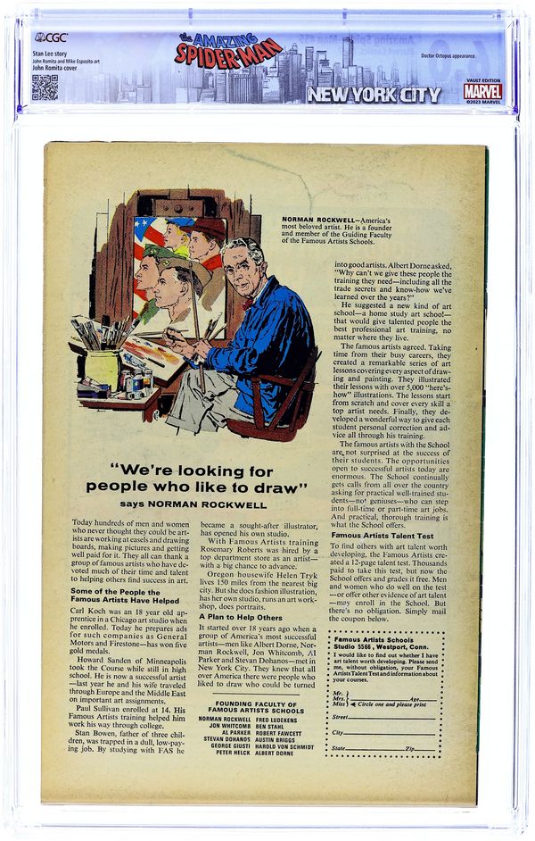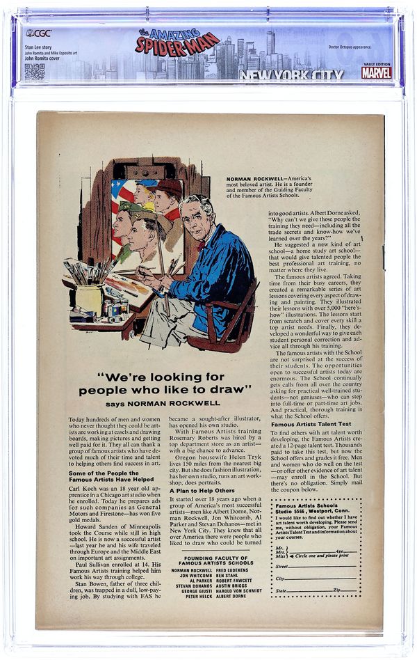 Starts Dec 15 Doctor Octopus appearance and the first appearance of Capt. Stacy in "Disaster" script by Stan Lee, pencils by John Romita Sr., inks by Mike Esposito as "Mickey Demeo." Spidey has amnesia, and Doc Ock convinces him that they are partners! Will he fall for it? Or just go along until his memory comes back? Romita cover. Reprinted in Marvel Tales # 41. 36 pgs. Cover price $0.12.
