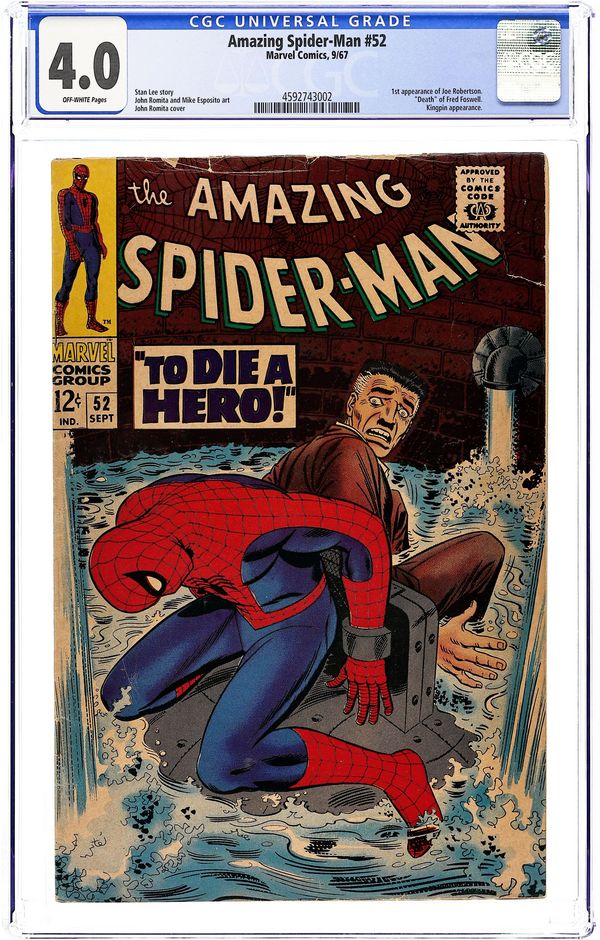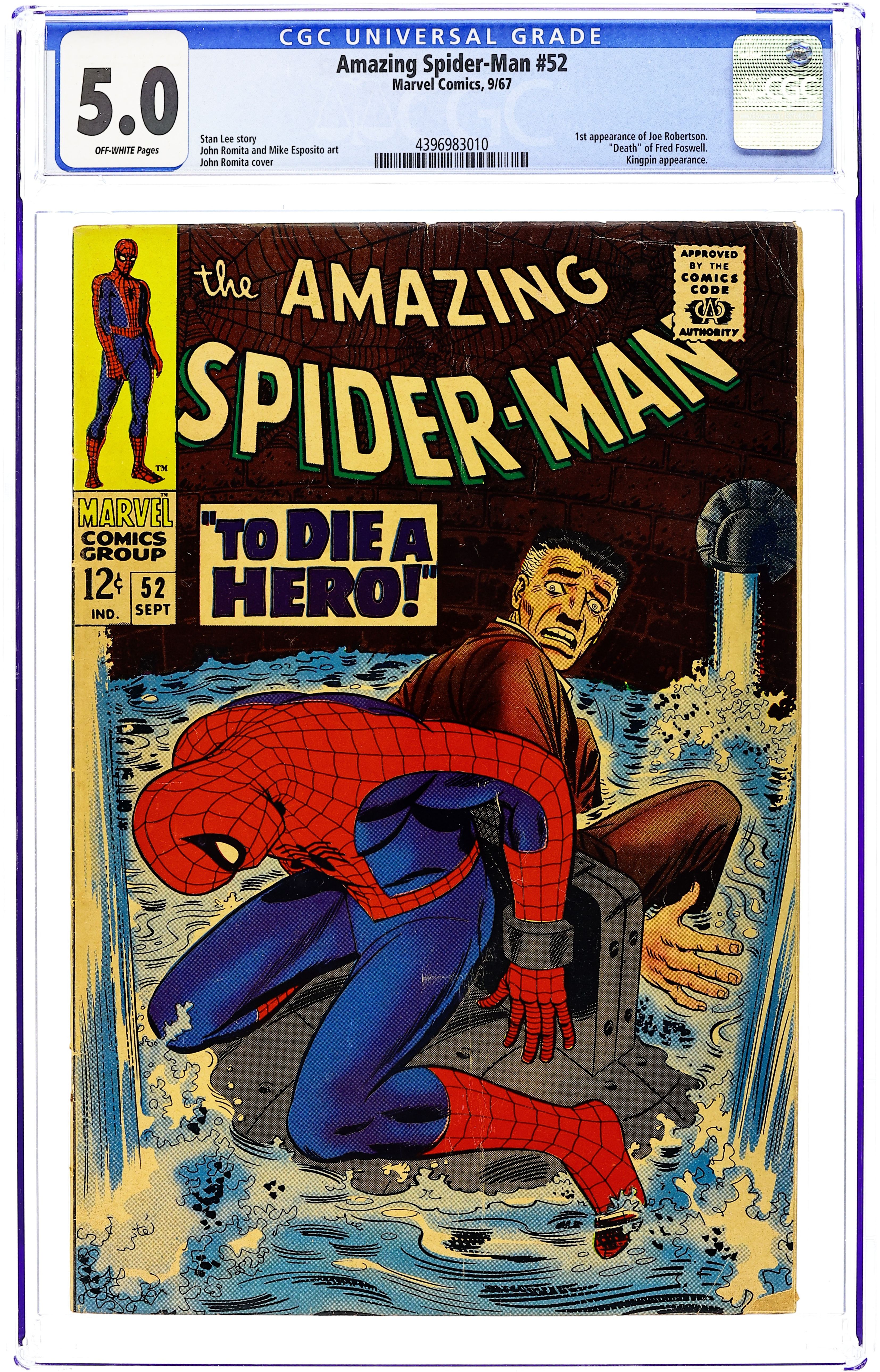 Cover by John Romita Sr. First appearance of Joe (Robbie) Robertson in To Die A Hero!, script by Stan Lee, pencils by John Romita, inks by Mike Esposito (as Mickey Demeo); The Kingpin has an unconscious Spidey and J. Jonah Jameson sealed up tight in a watery deathtrap!; If they want to get out while still breathing, Jameson will have to wake Spider-Man up from his afternoon nap. Reprinted in Marvel Tales # 37. 36 pgs., full color. $0.12. Cover price $0.12.