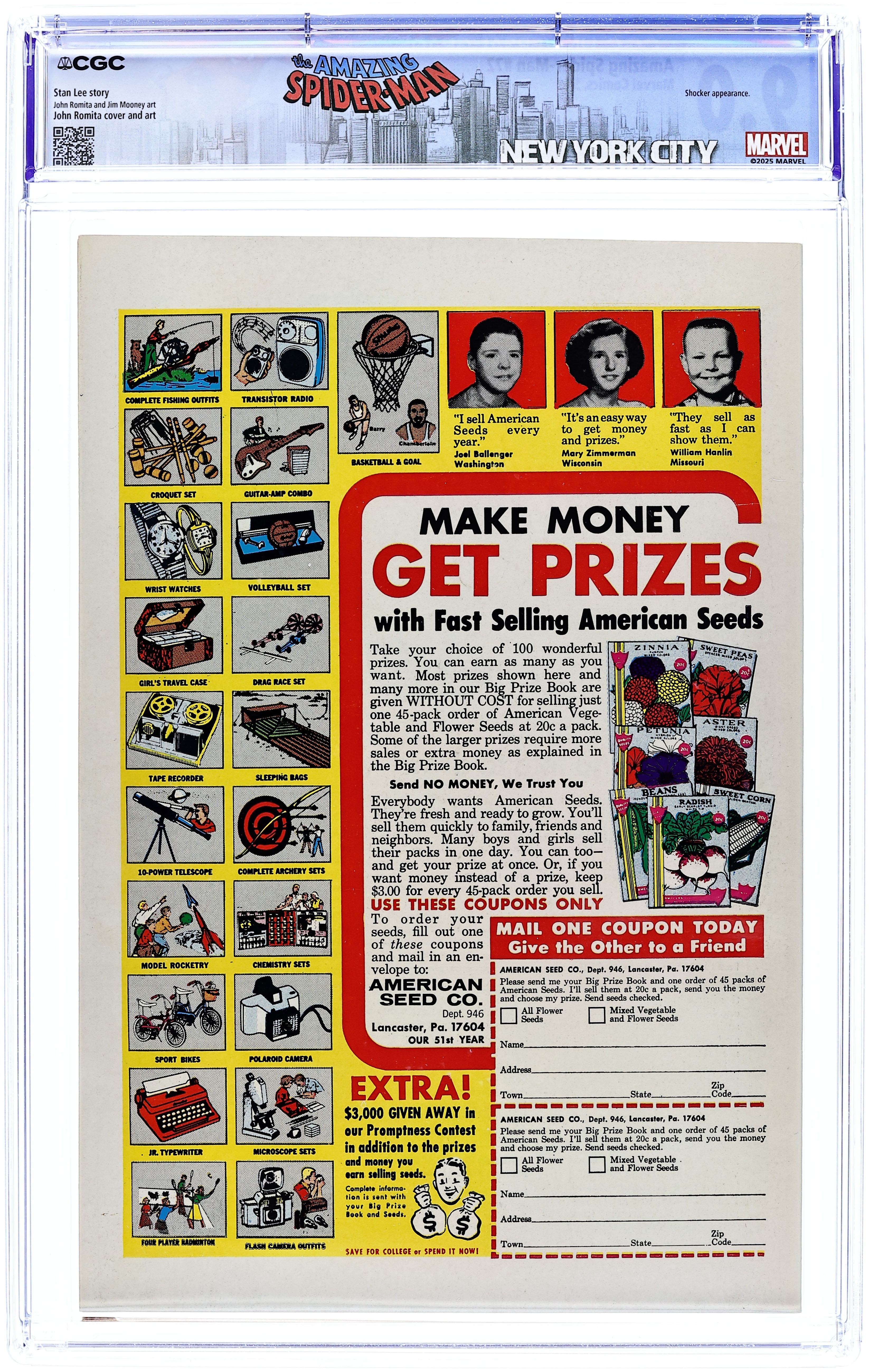 Starts Mar 16 First appearance of Randy Robertson in "To Squash a Spider!" Part 2 of 2. Script by Stan Lee. Pencils by John Romita. Inks by Jim Mooney. Cover by John Romita. In unbelievable fashion, Mysterio has shrunk the web-slinger to just six inches tall...and thrown him into a giant amusement park! Spider-Man attempts to get his bearings, but when he enters the house of mirrors -- everything goes haywire! However the web-spinner has fought Mysterio a few times before. And he knows if he can see through the illusions -- the path to triumph will be revealed! Will your friendly neighborhood Spider-Man find the pathway in time? Cameo appearances by Aunt May, Anna Watson, J. Jonah Jameson, Joe Robertson, Betty Brant, and Ned Leeds. (Notes: The original Mysterio does not return until a decade later -- in the storyline leading up to Amazing Spider-Man 200. This issue was reprinted in Marvel Tales #50.) 32 pages. Cover price $0.12.