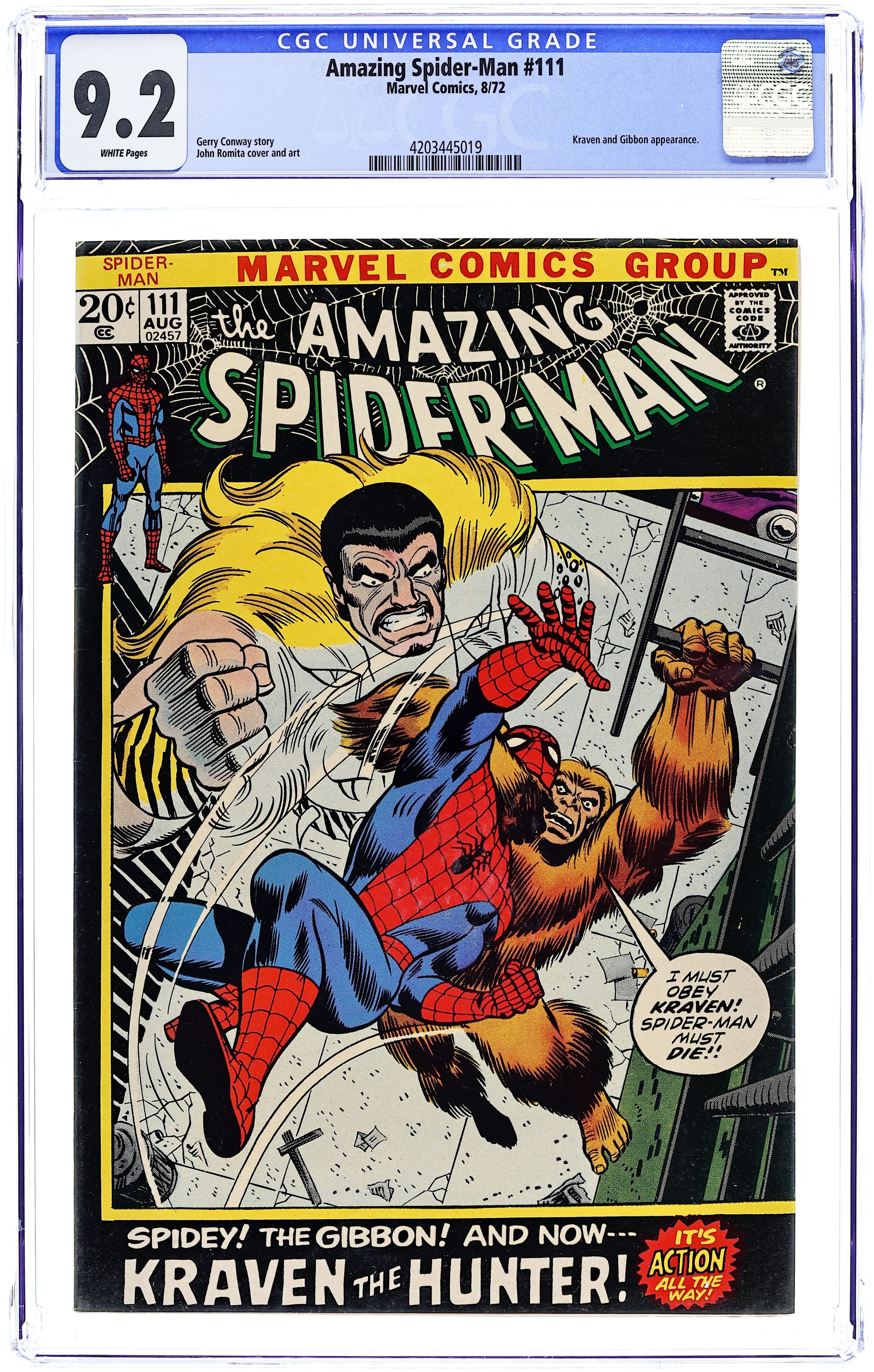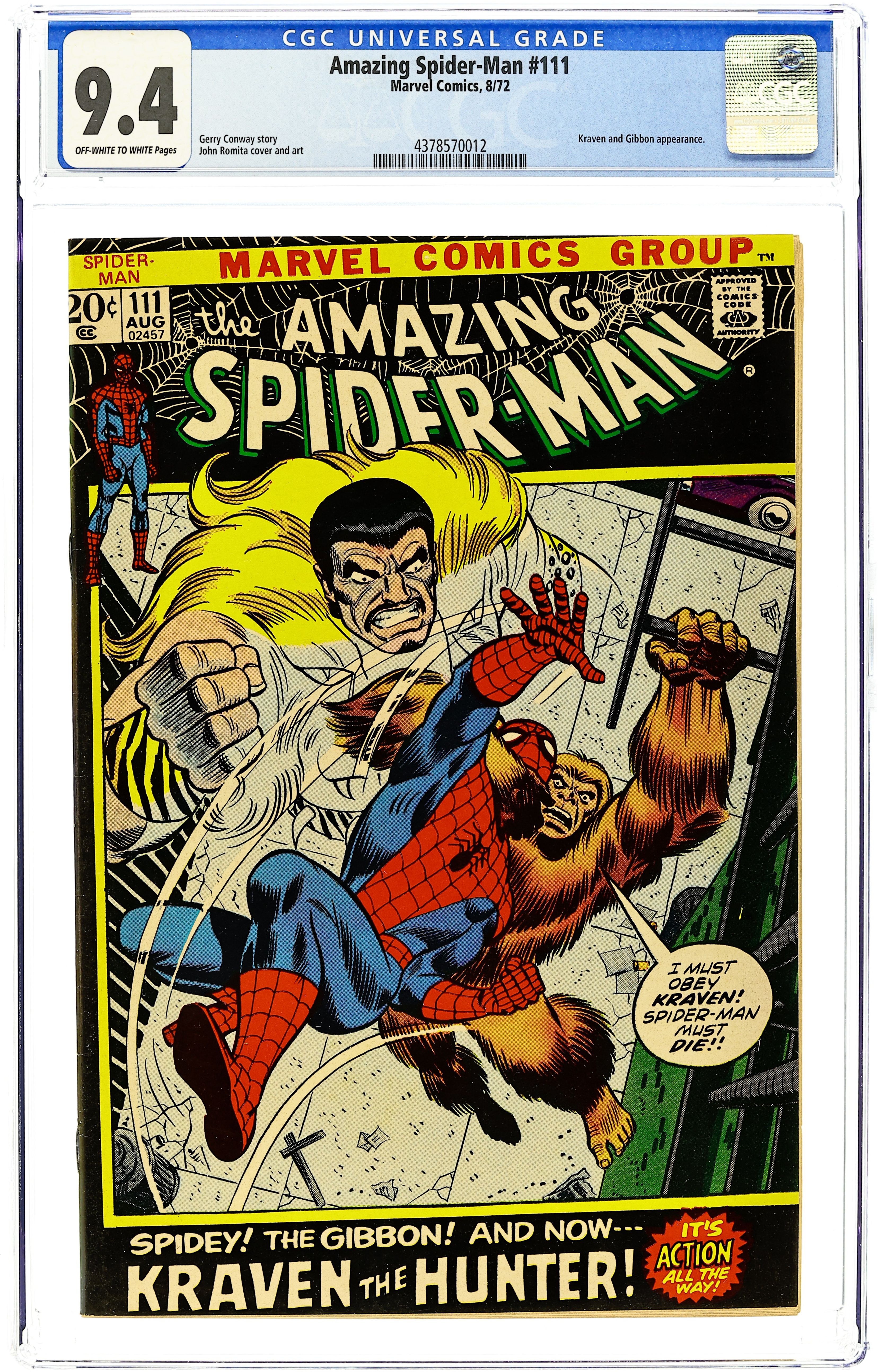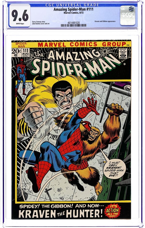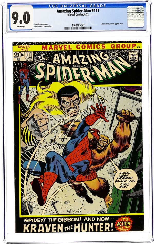 First appearance of the Gibbon in "The Birth of the Gibbon!" Part 1 of 2. Script by Stan Lee. Pencils by John Romita. Inks by John Romita and Tony Mortellaro (backgrounds). Cover by John Romita and Frank Giacoia. On a Manhattan rooftop, the wall-crawler has a chance meeting with a man named Martin Blank. And after he talks with Spider-Man; the tall, lanky, and athletic Martin decides to become a superhero! But when Martin (in his ape costume) meets the web-slinger again, Spider-Man laughs at his offer to become partners, and Martin is hurt. And now the Gibbon is vulnerable to becoming partners...with someone else! Origin of the Gibbon. Cameo appearances by Aunt May, Gwen Stacy, Harry Osborn, Flash Thompson, and Kraven the Hunter. (Notes: This story completes Stan Lee's extraordinary scripting run on the Amazing Spider-Man title -- which began with issue #1in 1963. The letters page includes a letter from comics writer David Michelinie. This issue was reprinted in Marvel Tales #89.) 36 pages. Cover price $0.20.