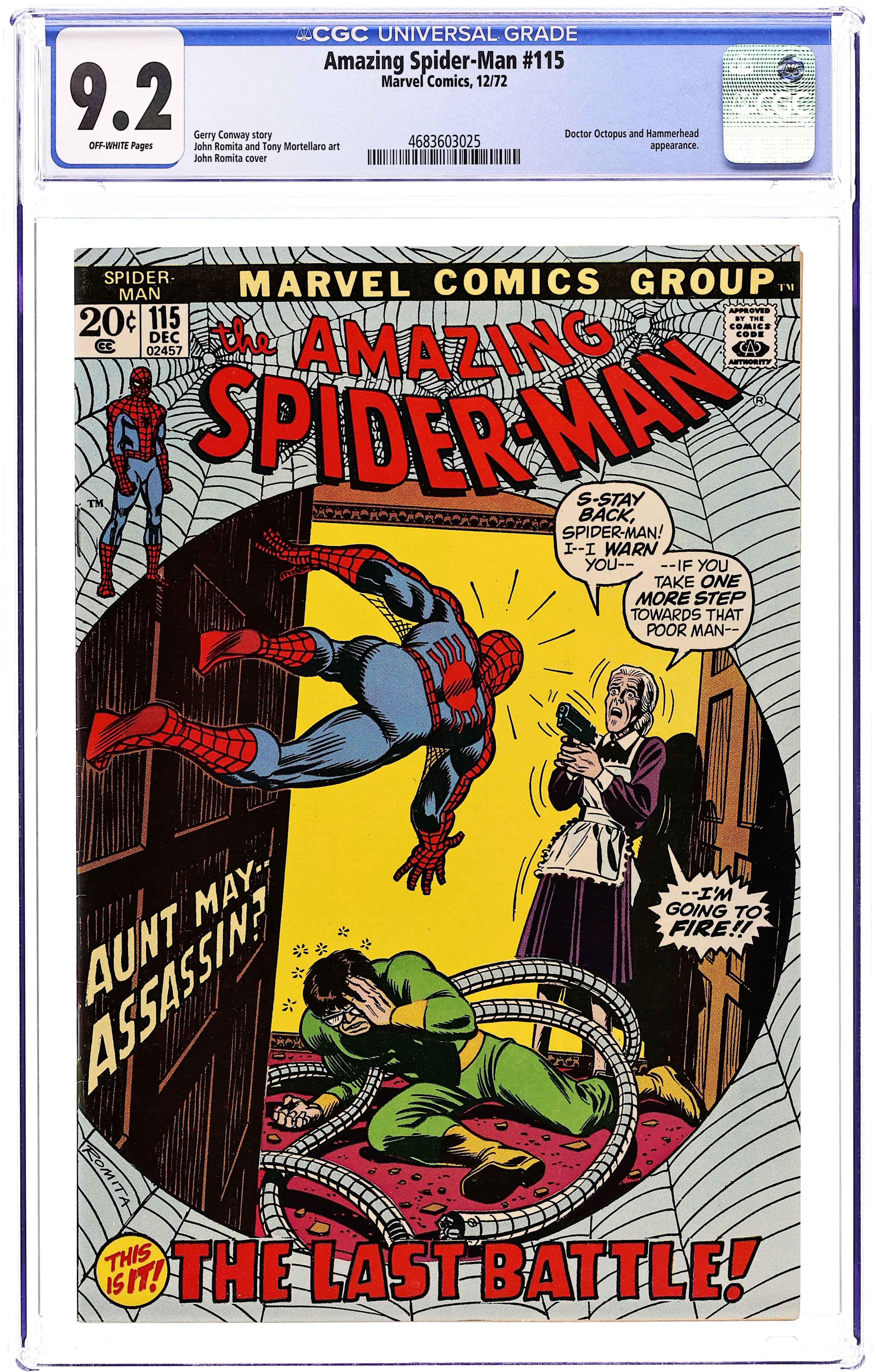 First appearance of Hammerhead in "They Call the Doctor...Octopus!" Part 1 of 3. Script by Gerry Conway. Art by Jim Starlin (breakdowns), John Romita (finishes), and Tony Mortellaro (backgrounds). Cover by John Romita. What a shocking turn of events! The web-slinger was looking for his Aunt May...but he found Doc Ock instead! As expected, a free-for-all quickly commences between the long-time adversaries. But due to sharp pains in his stomach, Spider-Man has to retreat. However not before Dr. Octopus rips off his mask! When Peter returns to his apartment, his roommate calls for a doctor. And to everybody's surprise, Peter is diagnosed with an ulcer! Meanwhile, Otto Octavius resumes his plan to take over the New York underworld. But there's a new crime boss in town who also wants to run New York's rackets! And his name is Hammerhead! Cameo appearances by Randy Robertson, Martha Robertson, Joe Robertson, J. Jonah Jameson, Gwen Stacy, Harry Osborn, Betty Brant, and Ned Leeds. (Notes: John Romita is credited as a co-plotter. This story was reprinted in Marvel Tales #92.) 36 pages. Cover price $0.20.